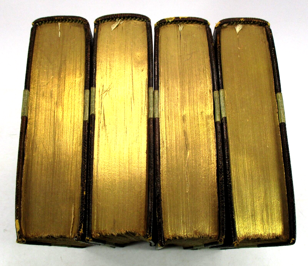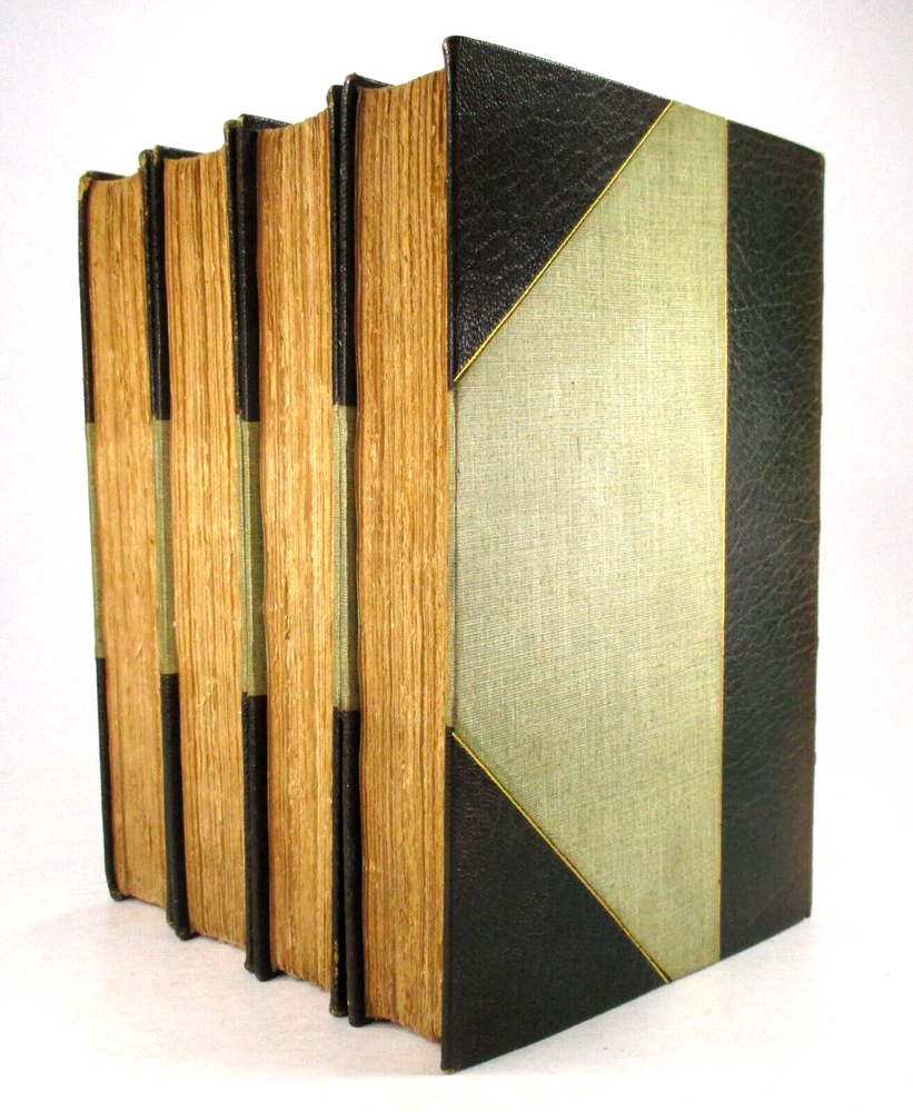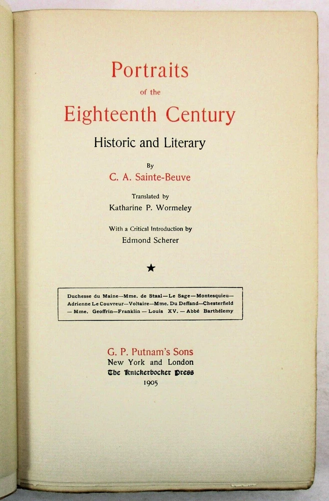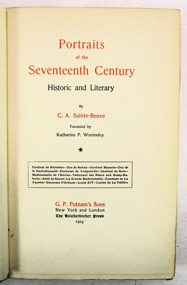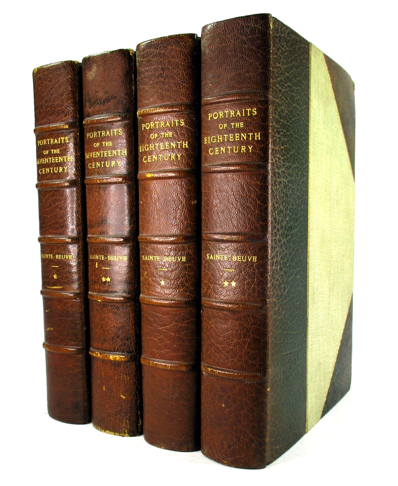 Very Good condition quarter-bound leather hardcover 4 volume set of Portraits of the Seventeenth Century Historic and Literary, and Portraits of the Eighteenth Century Historic and Literary by C. A. Sainte-Beauve. Published 1905 by G. P. Putnam's Sons, NY. Printed by The Knickerbocker Press, NY. Books are quarter-bound in dark green leather and light green cloth, with gold foil lettering to banded spine, and gilt head fore edges. Bindings are sound and pages are unmarked. Boards are clean and square with minor sunning to spine, minor curling to corners, minor scuffing to spine ends and hinges and occasionally on covers, and minor shelf wear. Please see photos for condition detail. L-2319