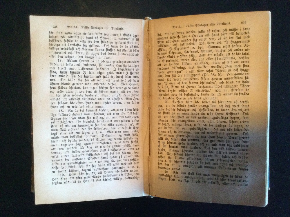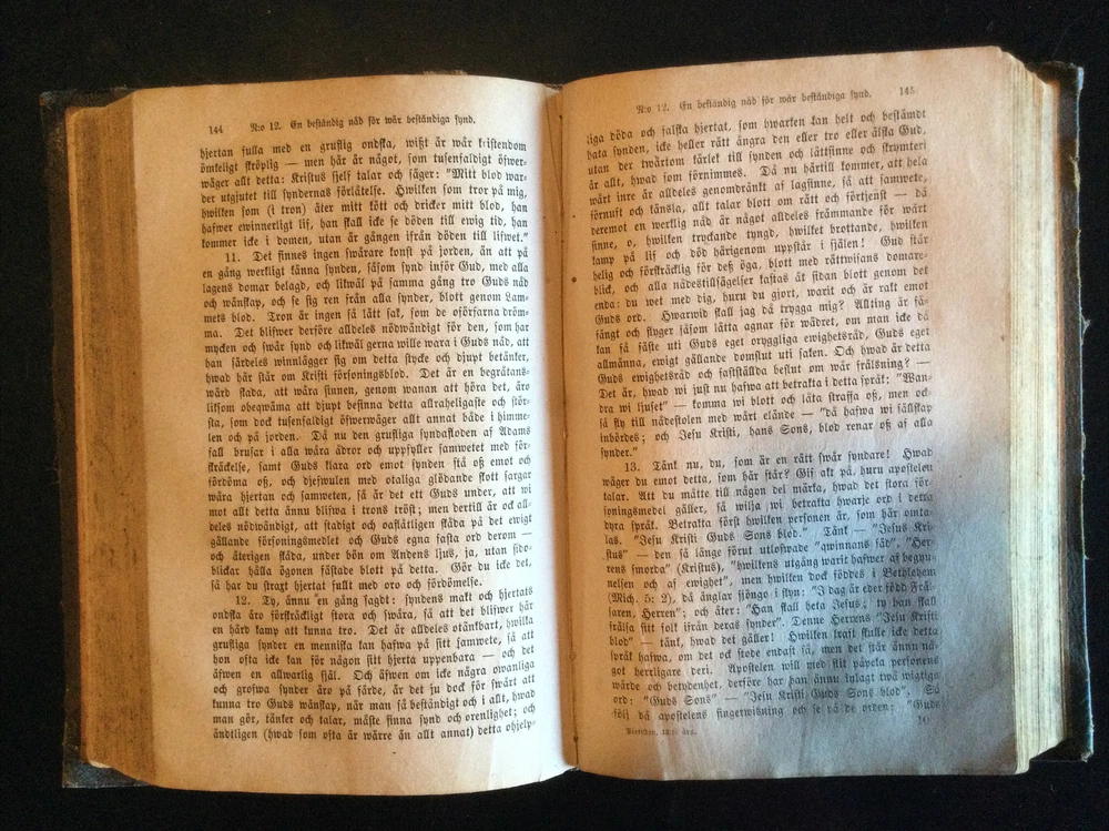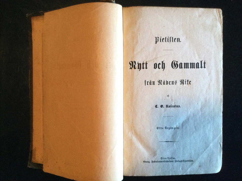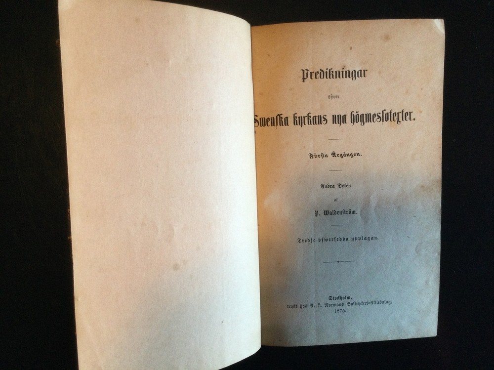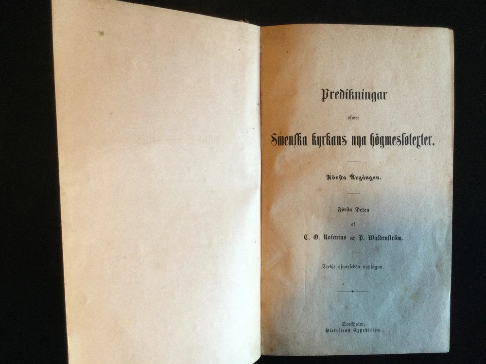 Predikningar öfver Svenska kyrkans nya bogmesloterter Forsta Delen, (Sermon's Over Swedish Church's New Bookmakers First Part), 1875; Predikningar öfver Svenska kyrkans nya bogmesloterter Andra Delen (Sermon's Over Swedish Church's New Bookmakers Second Part), 1875;Pietisten Nytt och Gammalt Fran Nadens Rike (Pietist New and Old from the Aftermath of the Kingdom), 1878 Shipped with USPS Media Mail.