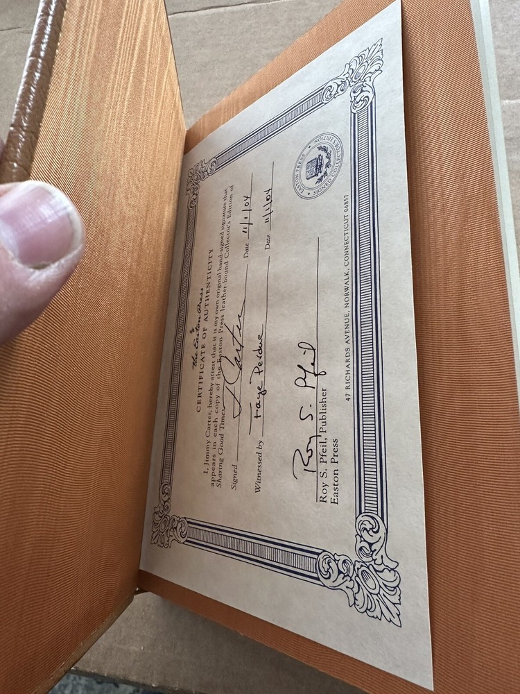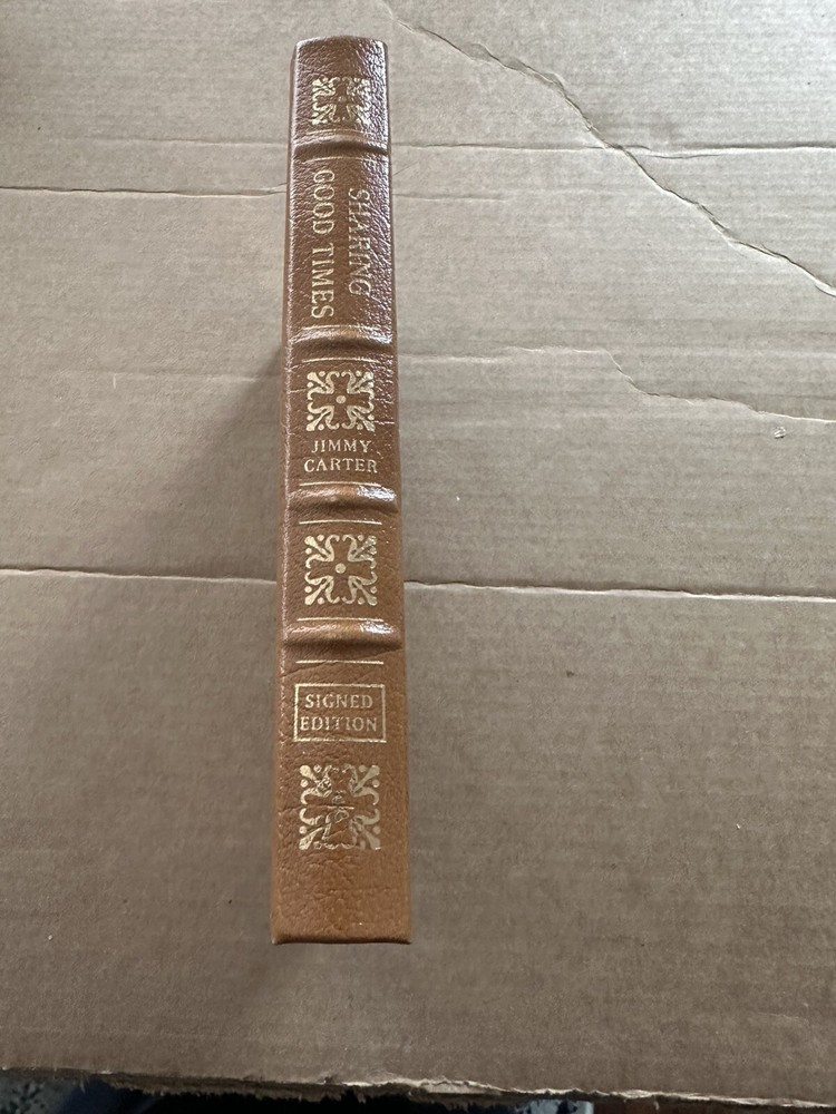 This is a luxury edition collector's book titled "Sharing Good Times" by Jimmy Carter, signed by the author. It is a full leather bound volume published by Easton Press in 2004. The book is a memoir focusing on history and is written in English.
