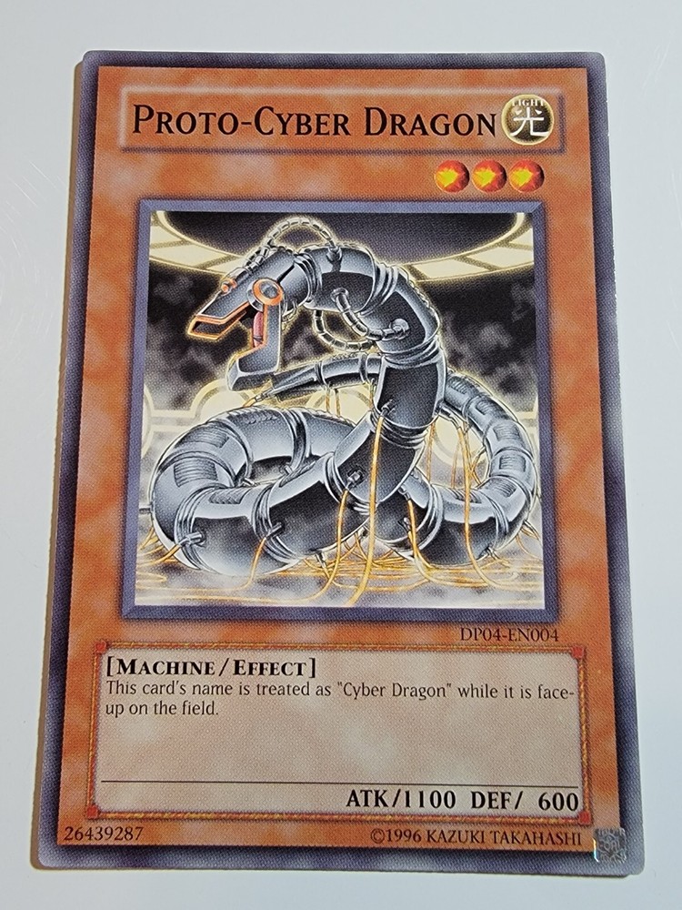 Proto-Cyber Dragon - DP04-EN004 Common Unlimited Yugioh. Overall NM-M condition. (Please reference pictures for c osmetic condition). Take advantage of our multi item discount!!! When you buy 2 items you will have the opportunity to select a 3rd item of equal our lesser value for free from our whole inventory. (Must use Ebay's shopping cart feature in order to take advantage of this discount). If you have any inquiries please feel free to message us and we will respond as soon possible, usually within 24 hours. SHIPPING We almost always use USPS as our primary SHIPPING service. We ship within 24 hours of receipt of payment and will always provide tracking, unless otherwise stated in the listing. (We reserve the right to use a different carrier or service). FEEDBACK Your FEEDBACK is important to us as a growing small business. If for any reason you are unhappy with your transaction, please message us and we will do everything in our power to make it right. Returns Returns are accepted within 30 days of confirmation of delivery. If there is anything you are unhappy about with your purchase please message us and we will respond within 24 hours to your concerns. Thank you for supporting our small business. We appreciate your valued business with us and look forward to serving you in the future. Dan & Tonya Dio's Eclectic Treasures