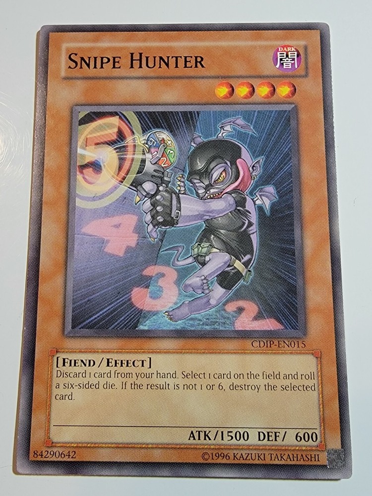 Snipe Hunter - CDIP-EN015 Common Unlimited Yugioh. Overall NM-M condition. (Please reference pictures for c osmetic condition). Take advantage of our multi item discount!!! When you buy 2 items you will have the opportunity to select a 3rd item of equal our lesser value for free from our whole inventory. (Must use Ebay's shopping cart feature in order to take advantage of this discount). If you have any inquiries please feel free to message us and we will respond as soon possible, usually within 24 hours. SHIPPING We almost always use USPS as our primary SHIPPING service. We ship within 24 hours of receipt of payment and will always provide tracking, unless otherwise stated in the listing. (We reserve the right to use a different carrier or service). FEEDBACK Your FEEDBACK is important to us as a growing small business. If for any reason you are unhappy with your transaction, please message us and we will do everything in our power to make it right. Returns Returns are accepted within 30 days of confirmation of delivery. If there is anything you are unhappy about with your purchase please message us and we will respond within 24 hours to your concerns. Thank you for supporting our small business. We appreciate your valued business with us and look forward to serving you in the future. Dan & Tonya Dio's Eclectic Treasures