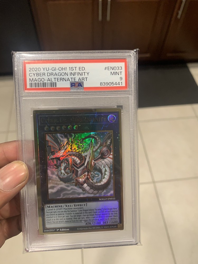 This rare collectible card features Cyber Dragon Infinity from the Yu-Gi-Oh! TCG set, Yugi. It has been professionally graded with a score of 9 by the reliable Professional Sports Authenticator (PSA) and certified with number 83905441. The card boasts an attractive holo finish and is a 1st Edition from 2020. This is a must-have for any serious collector of CCG individual cards, especially those who are fans of Yu-Gi-Oh! TCG. The alternate art design of Cyber Dragon Infinity makes this card even more special and unique. Don't miss the opportunity to add this exceptional card to your collection.
