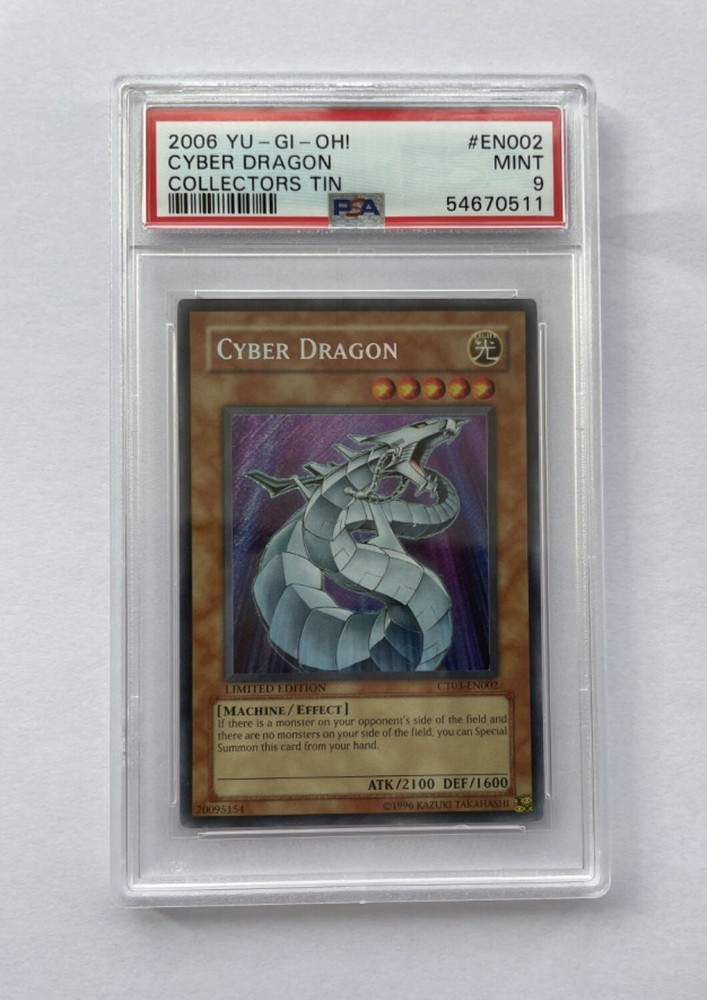 This PSA9 graded Yu-Gi-Oh! TCG card is a must-have for any collector. Featuring the iconic Cyber Dragon, this card is sure to be a standout in your collection. The card is individually graded and comes from the Collectors Tin, making it a rare find. Add this card to your CCG Individual Cards collection today and show off your love for the Yu-Gi-Oh! TCG. Don't miss out on the chance to own this graded card and add it to your collection.