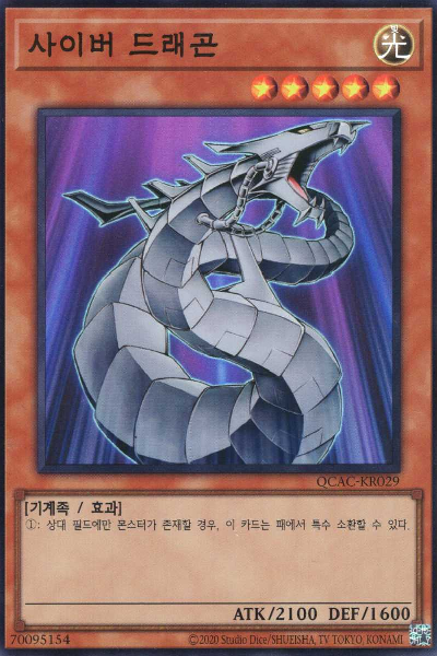 [QCAC-KR029] Super Rare "Cyber Dragon" Korean Product Description: [QCAC-KR029] Super Rare "Cyber Dragon" Korean Single Card + Sleeve + Top loader (Case) Mint Condition (Made in Korea) 100% Genuine Product of Konami (Korean Version) All singles cards are never used, fresh from the pack. Available for combined shipping (send invoice or partial refund after payment) Store Policy Items will be shipped from South Korea, 1 ~ 3 business days after order. All the items, we are selling, include manufacturers' warranty and do strict inspection & packaging before shipping. We use Korea Post / Rincos International Priority Airmail. All of our shipping provide tracking number. (Standard & Expedited) Standard: 10 ~ 20 business days (+ Tracking Number) Expedited: 5 ~ 10 business days (+ Tracking Number) We do accept all reasonable request and offer.