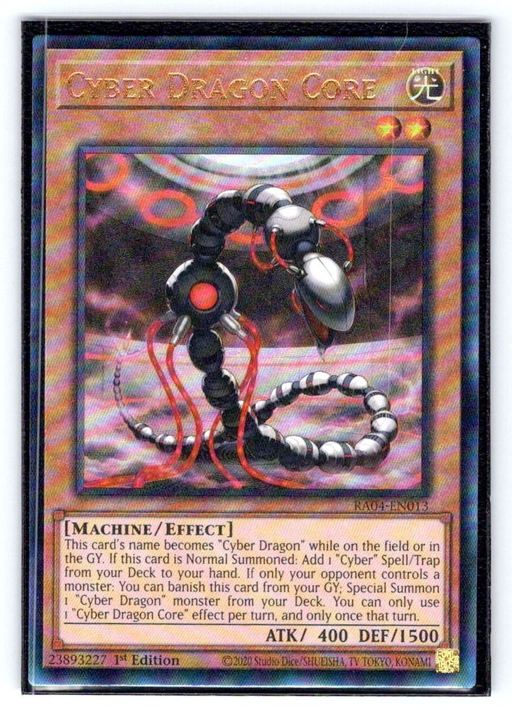 This is a nice example of a Quarter Century Stampede #RA04-EN013 Cyber Dragon Core (UR) Other important information about this card: Ultra Rare In 2025 Cyber Dragon Core (UR) played for the . Please check out our other listings for more great cards.