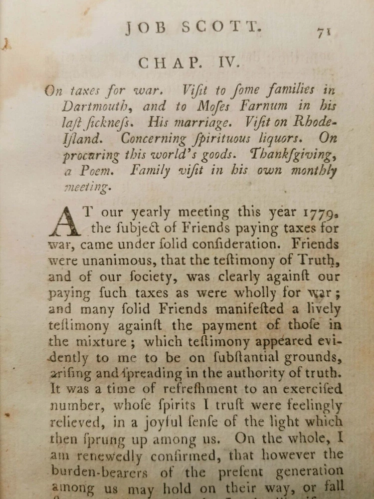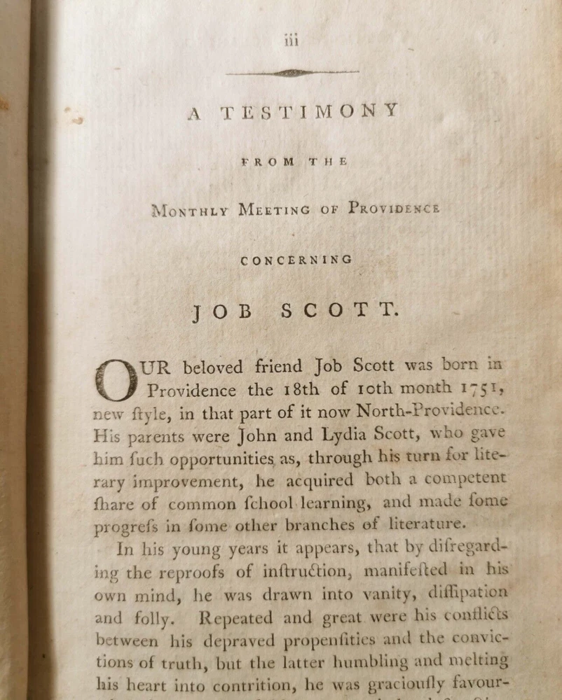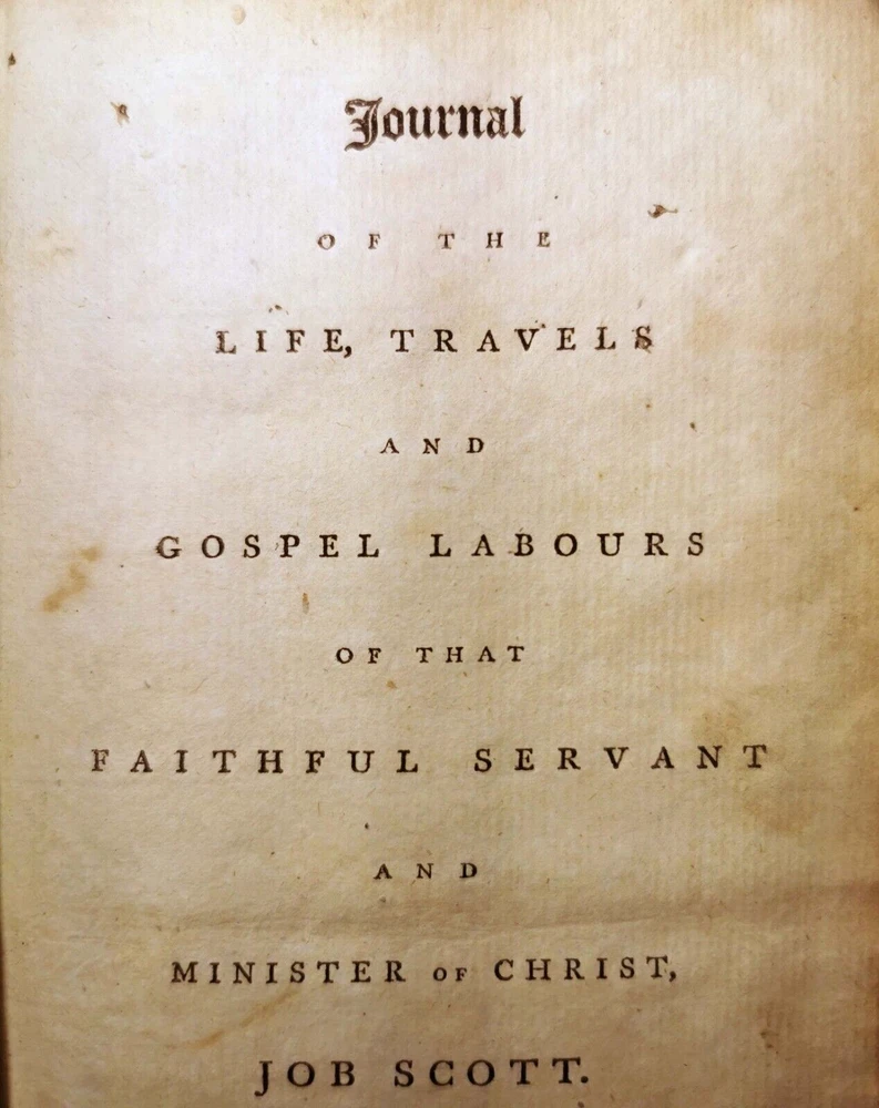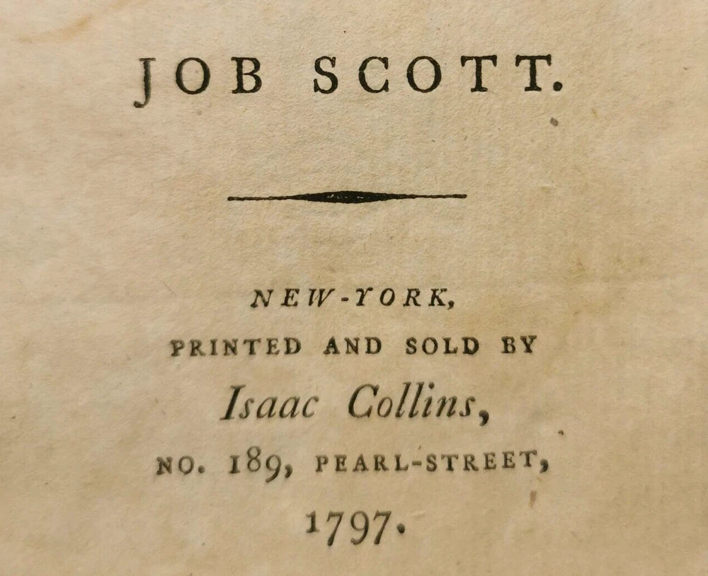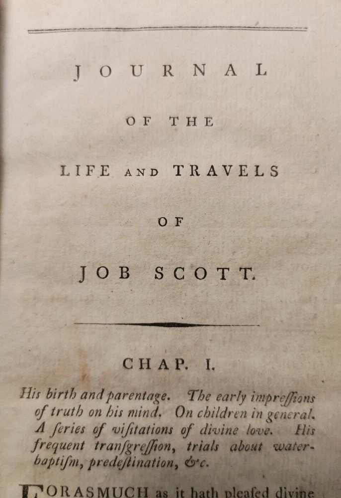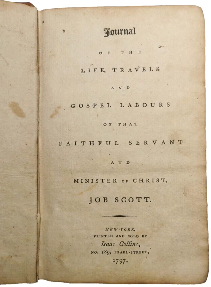 RARE 1797, JOB SCOTT'S JOURNAL, PEARL STREET, NEW YORK CITY, NY, LATE 18TH CENTURY ANTIQUE AME RI CAN BIOGRAPHICAL PUBLISHED 1ST EDITION VOLUME on the LIFE & TIMES of QUAKER MINISTER & ABOLITIONIST JOB SCOTT, with LEATHER HARDBOARDS, CORDOVAN BANDED SPINE with GOLD GILT STAMPED TYPOGRAPHY, from a FINELY APPOINTED BOSTON, MA ESTATE, with NO MISSING PAGES or OTHER NOTICEABLE DAMAGE SUCH as EXCESSIVE FOXING, PAGE TEARS or CORNER FOLDS, with BLACK INK INSCRIPTION in CURSIVE PENMANSHIP 'RUTH SHEFFIELD'S BOOK' on INSET PAGE 'JOURNAL of the LIFE, TRAVELS & GOSPEL LABOURS of the FAITHFUL SERVANT & MINISTER of CHRIST, JOB SCOTT NEW-YORK, Printed and Sold by No. 189, Pearl Street, New York City, NY Published by ISAAC COLLINS 1797 (Published in 1797, New York, NY) Late 18th century Ame ri can antique leather bound, published biographical volumes of notable Ame ri can people DIMENSIONS: 7 ¼" Height x 4 ½" Width x 1" Depth Weight: 11.7 oz. D E S C R I P T I O N : CONDITION: Very Good to Excellent overall antique condition.