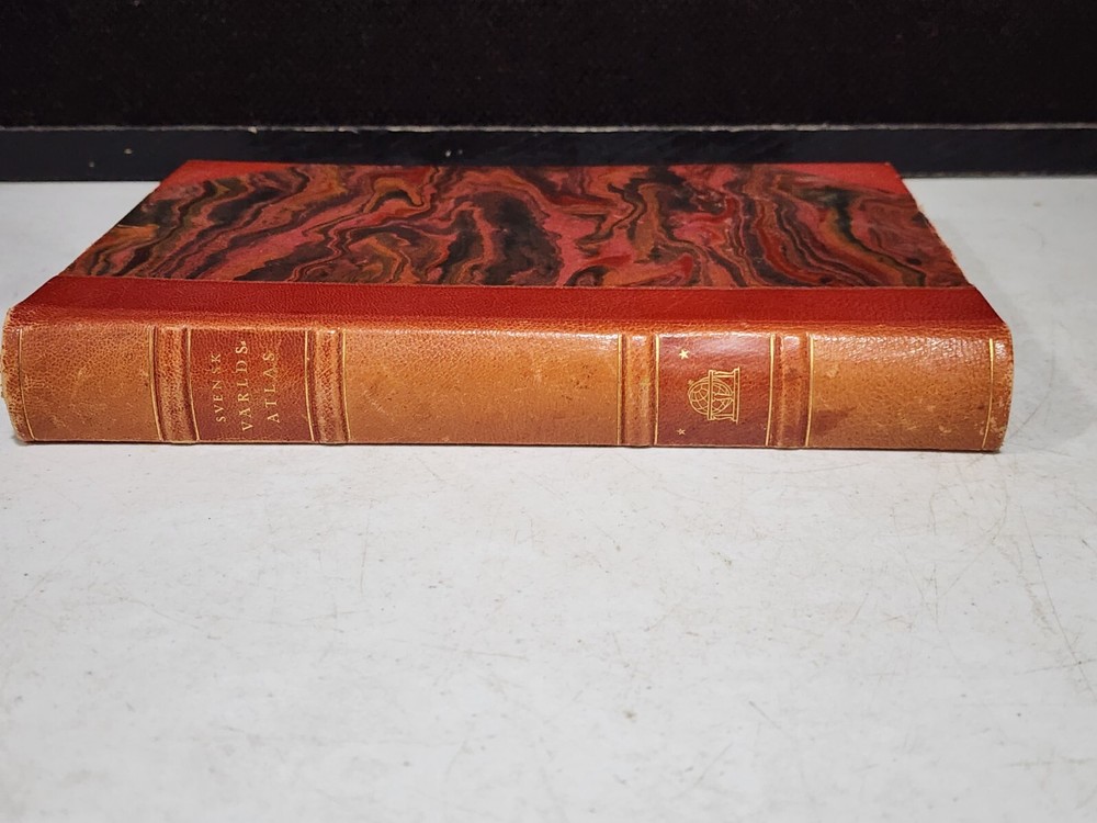 LEATHER AND MARBLED BOUND ATLAS BOOK PRINTED IN 1930 IN SWEDEN 293 PAGES WRITING ON THE FIRST COVER PAGE, NO OTHER MARKINGS NOTED. MEASURES 9.5" X 7" SPINE TIGHT, NO MISSING PAGES. RUBBING TO COVER ED...