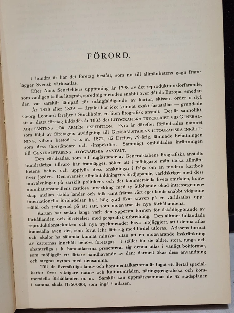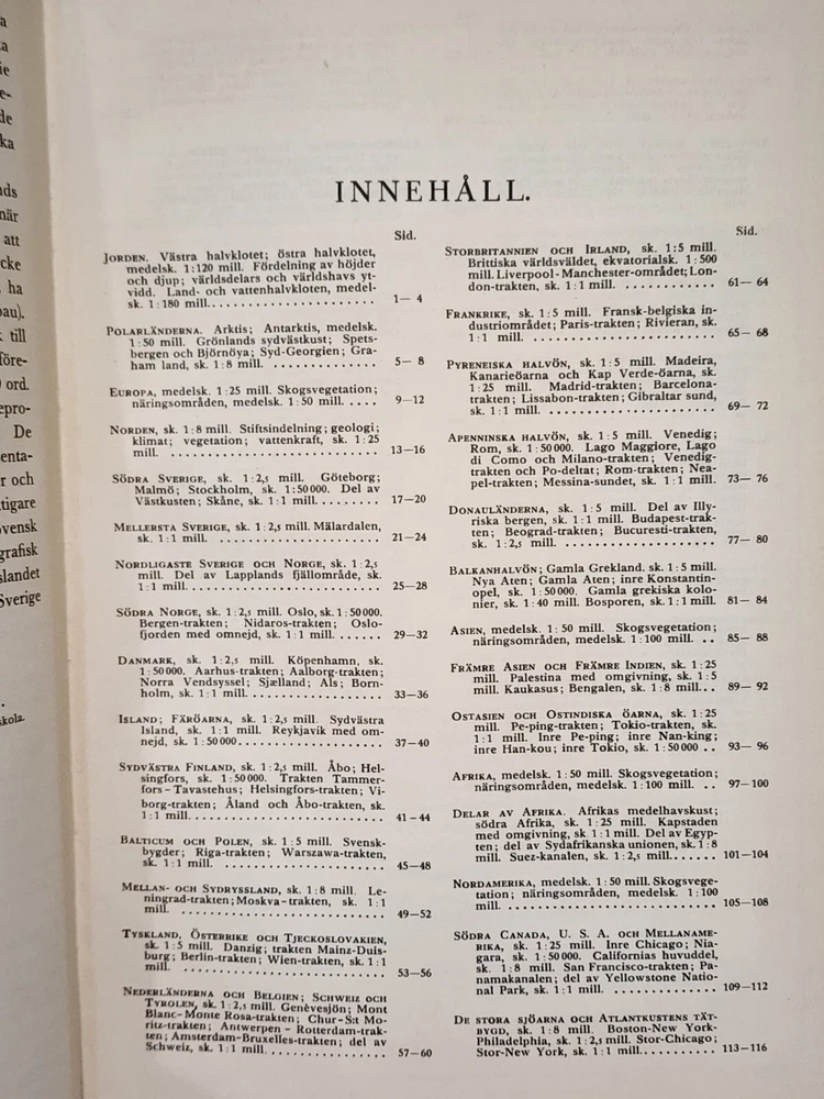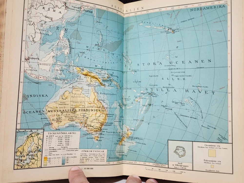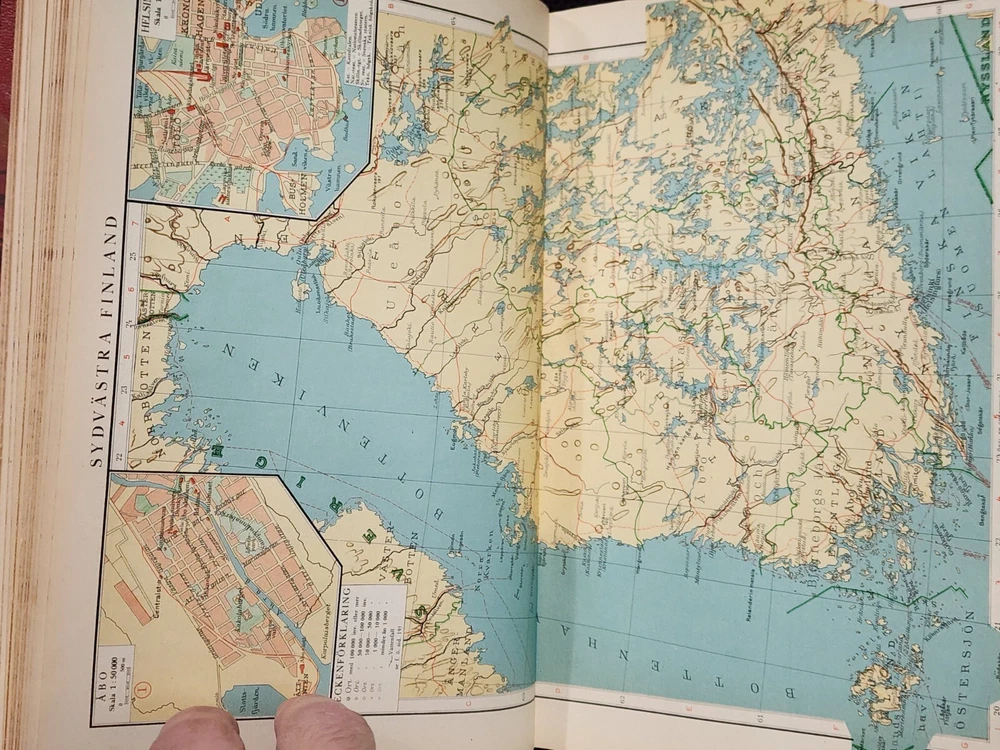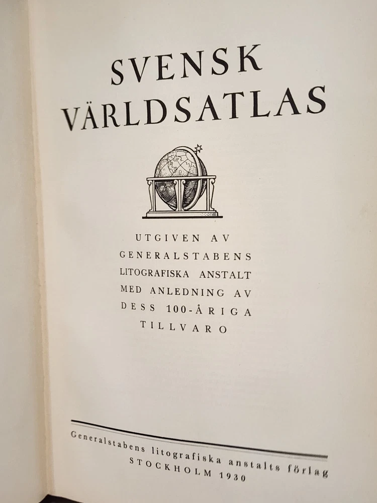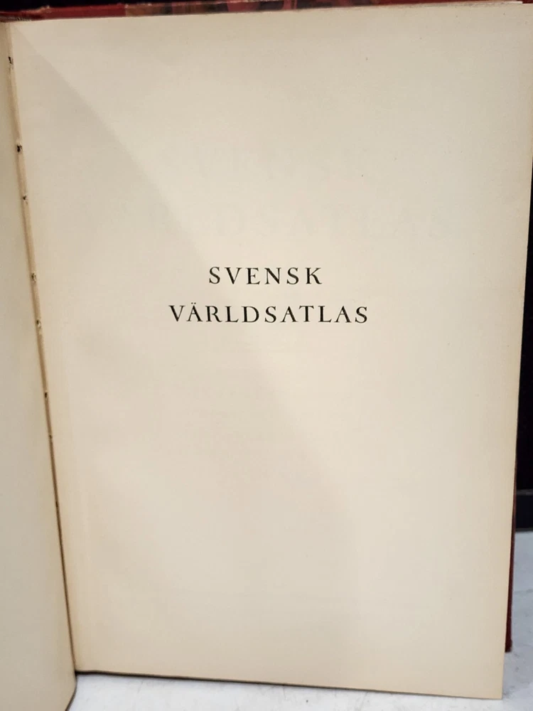 LEATHER AND MARBLED BOUND ATLAS BOOK PRINTED IN 1930 IN SWEDEN 293 PAGES WRITING ON THE FIRST COVER PAGE, NO OTHER MARKINGS NOTED. MEASURES 9.5" X 7" SPINE TIGHT, NO MISSING PAGES. RUBBING TO COVER EDGES AS SEEN IN THE PHOTOS.