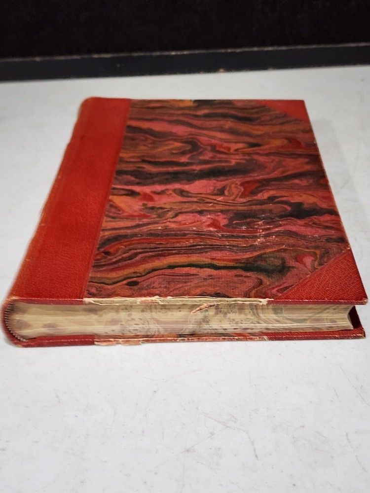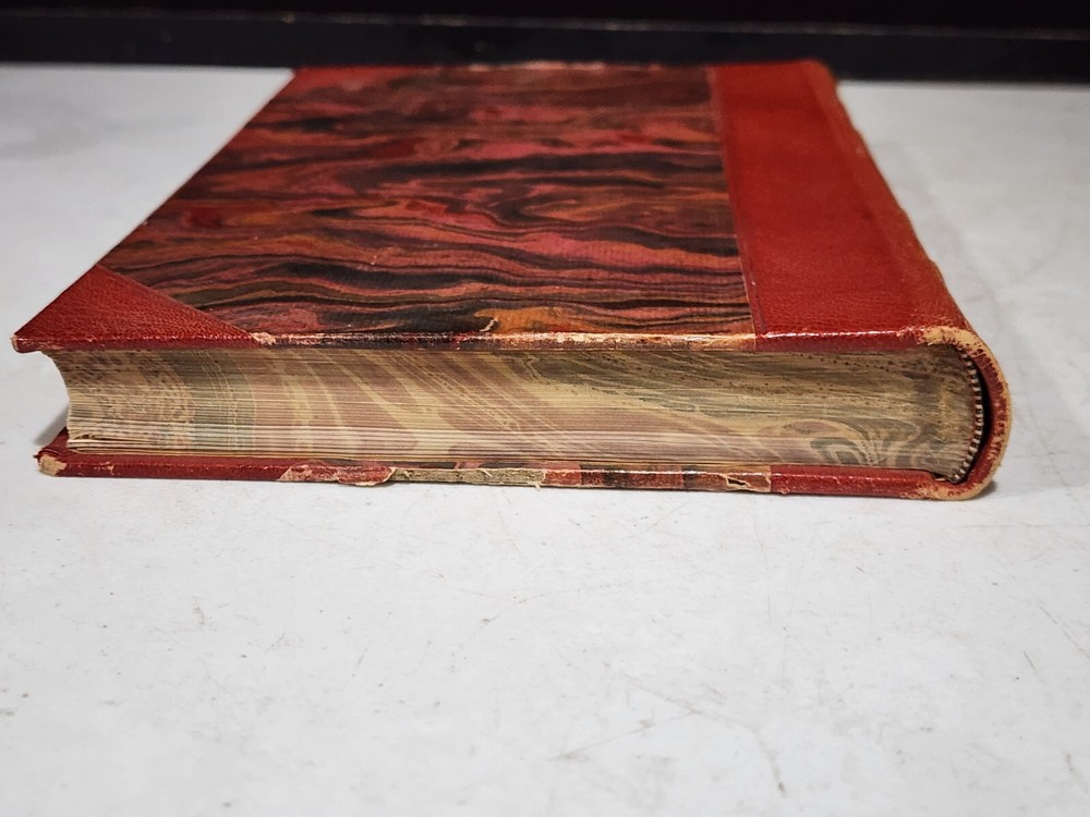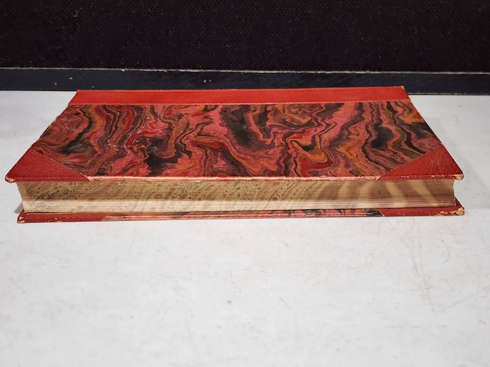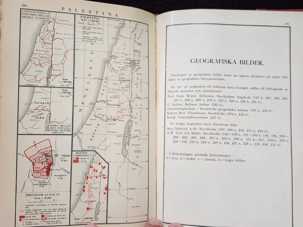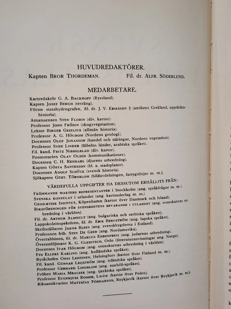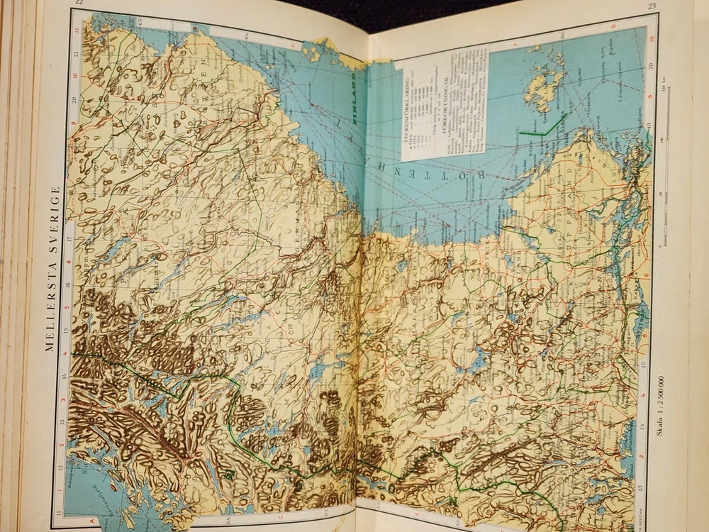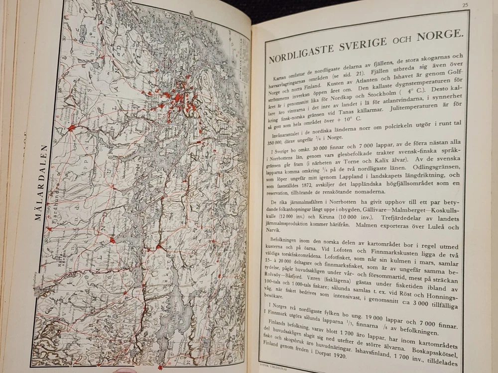 LEATHER AND MARBLED BOUND ATLAS BOOK PRINTED IN 1930 IN SWEDEN 293 PAGES WRITING ON THE FIRST COVER PAGE, NO OTHER MARKINGS NOTED. MEASURES 9.5" X 7" SPINE TIGHT, NO MISSING PAGES. RUBBING TO COVER EDGES AS SEEN IN THE PHOTOS.