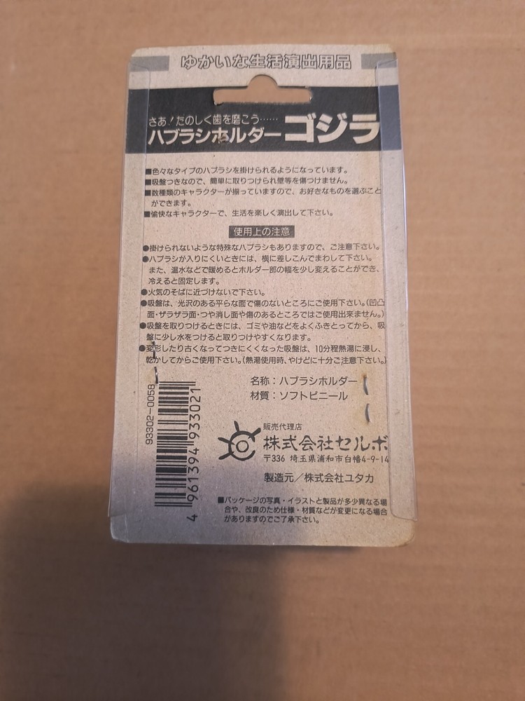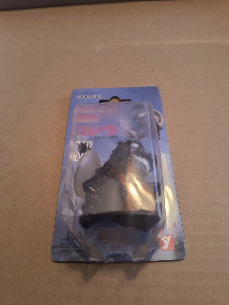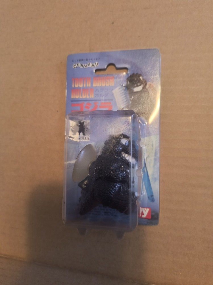 The product is a rare 1973 Godzilla Cerveau Toothbrush Holder, showcasing the iconic Godzilla franchise in a unique and nostalgic item. Perfect for fans of science fiction and horror genres, this collectible piece is sure to appeal to enthusiasts of all ages who appreciate the legendary monster. The toy is well-preserved and comes with its original packaging, making it a valuable addition to any Godzilla collection.