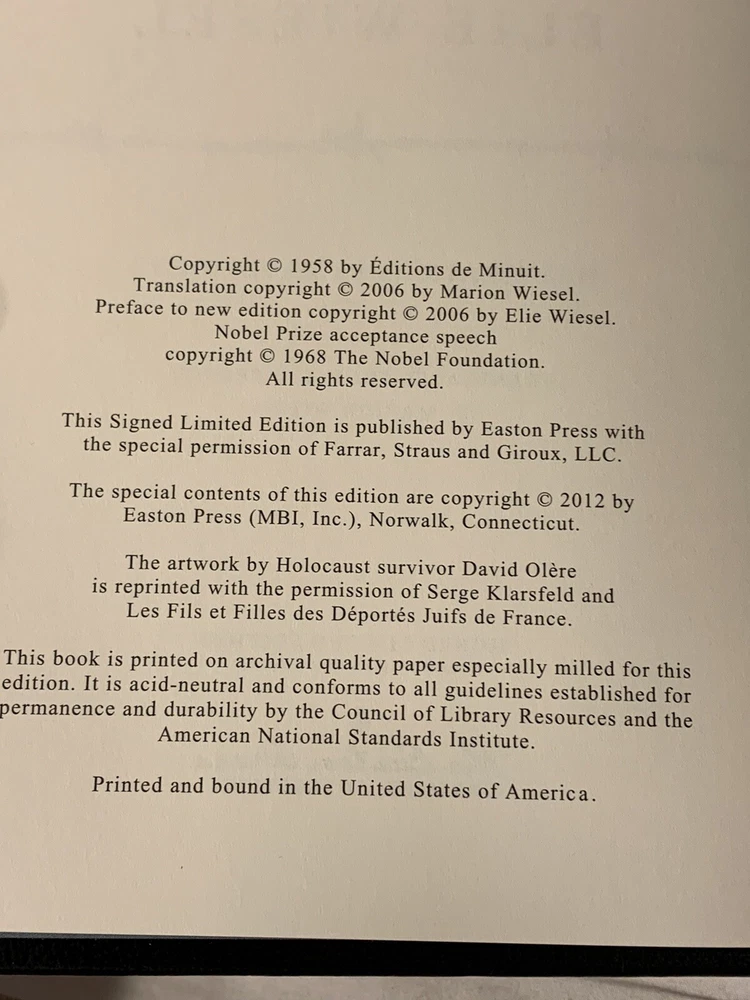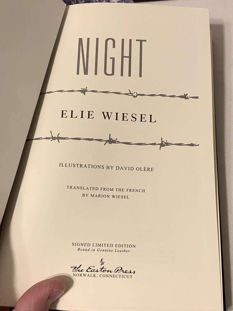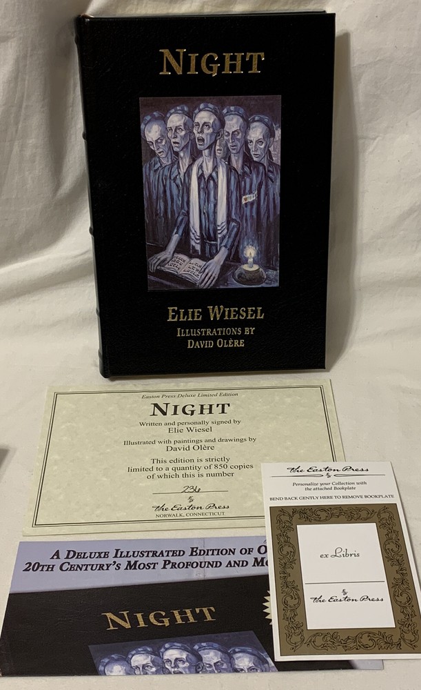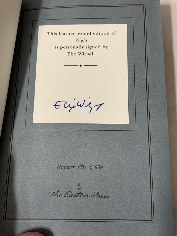 RARE 2012 “Night” Elie Wiesel Easton Press Signed Limited Leather Edition in slipcase. Gorgeous edition limited to 850 copies. Very nice condition. There is one spot of wear to the black leather on the front of the book from handling. Otherwise no issues. Sold as is!