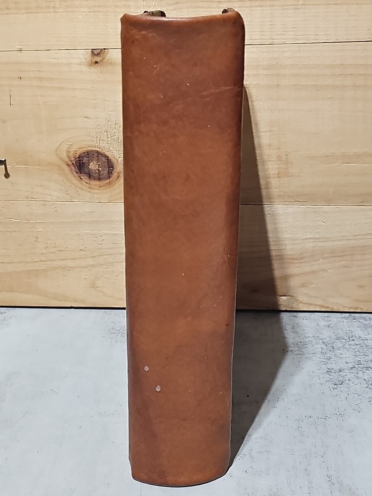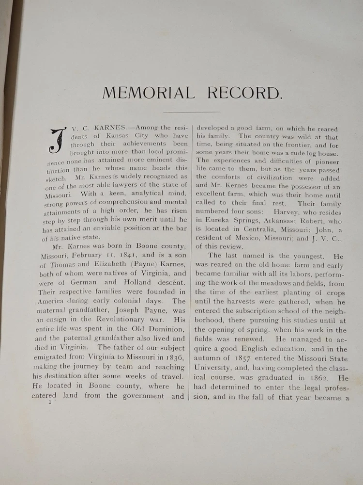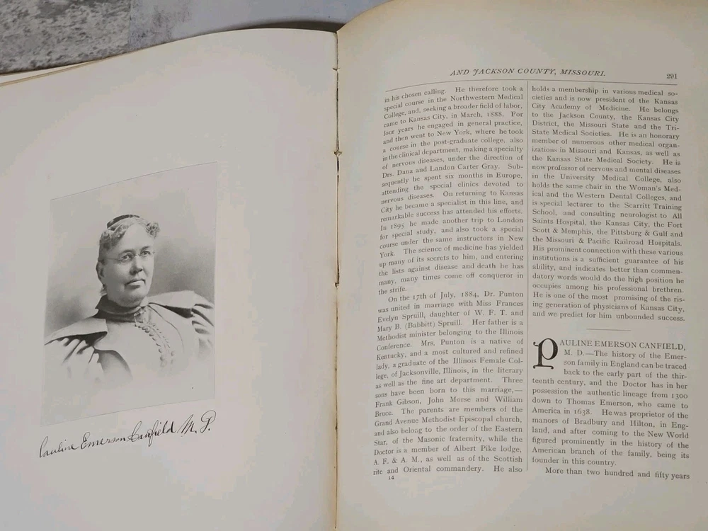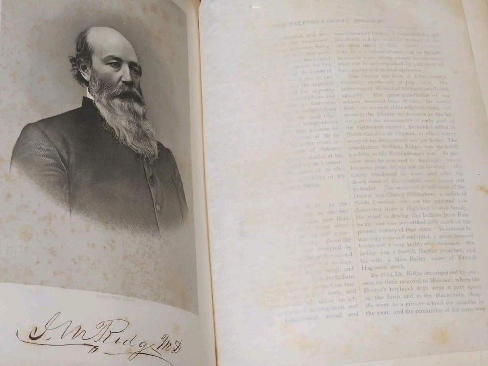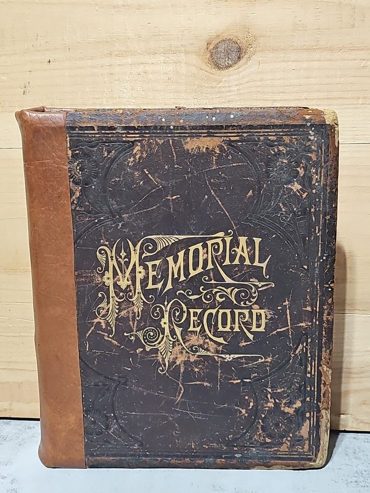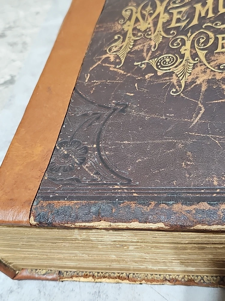 RARE Original 1896 Leather Memorial and Biographical Record of Kansas City and Jackson County (Missouri). Large leather bound book, approx. 12"x9"x3", weighs over 7 lbs. Fancy textured leather cover with gilded lettering, page gilt edge on 3 sides, fancy black & gold printed end papers. Gold stamped design bordering the endpapers. Book cover has significant wear inside and out. Binding is loose. Some of the prominent figures are illustrated with etchings or photographs and their signatures are printed below the portrait. Some of the signatures appear to be actual signatures, the ink can be felt on the page. One woman is included, with portrait, Pauline EmersonCanfield, M.D. The etchings are marked E.G. Williams & Bro. N.Y. Book is very worn, pages are yellowed and some have small tears along the edges. Please see photos for details and condition. We combine shipping on request. Local pickup is available in Pleasant Hill, Missouri.