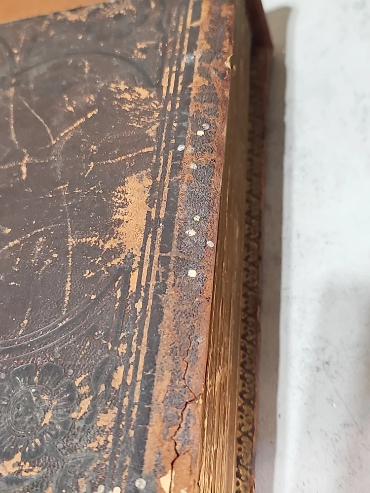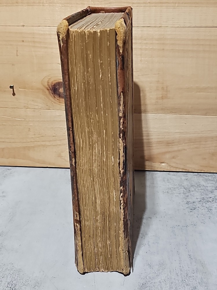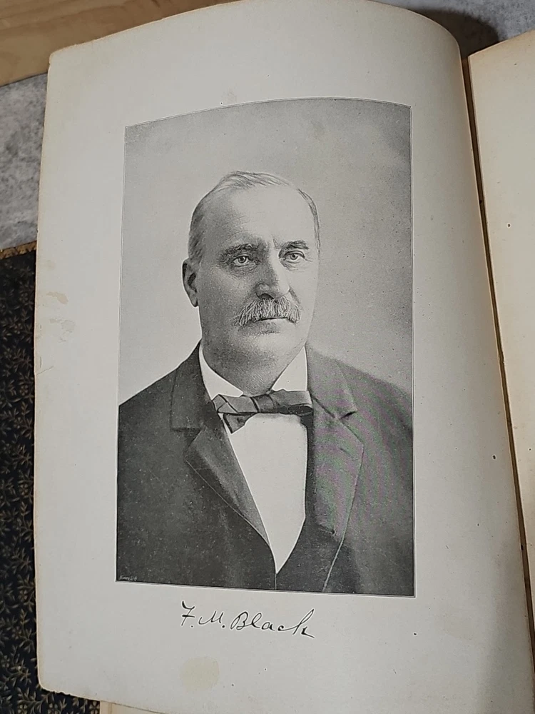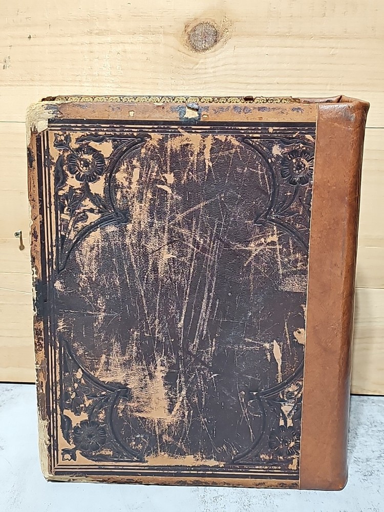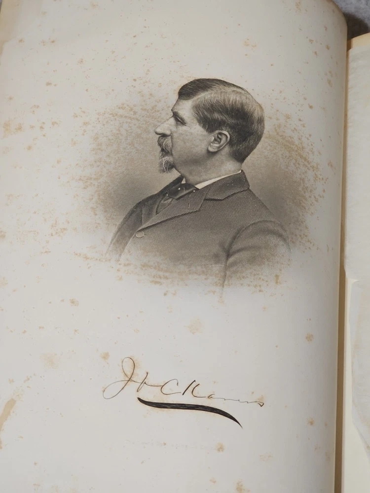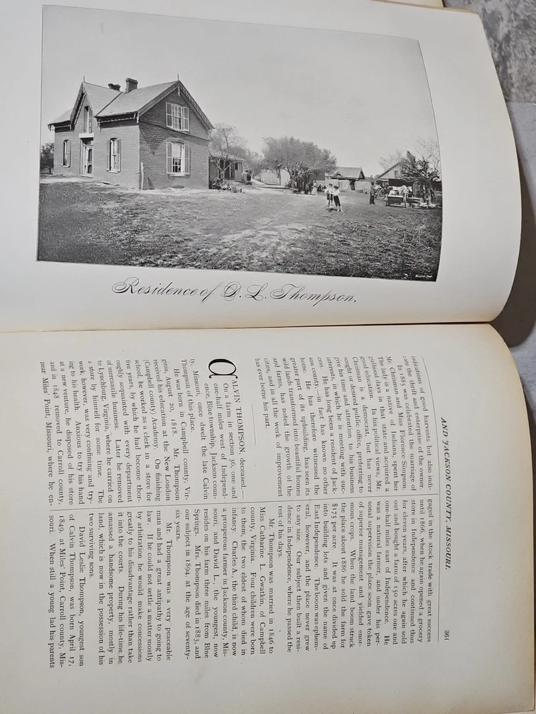 RARE Original 1896 Leather Memorial and Biographical Record of Kansas City and Jackson County (Missouri). Large leather bound book, approx. 12"x9"x3", weighs over 7 lbs. Fancy textured leather cover with gilded lettering, page gilt edge on 3 sides, fancy black & gold printed end papers. Gold stamped design bordering the endpapers. Book cover has significant wear inside and out. Binding is loose. Some of the prominent figures are illustrated with etchings or photographs and their signatures are printed below the portrait. Some of the signatures appear to be actual signatures, the ink can be felt on the page. One woman is included, with portrait, Pauline EmersonCanfield, M.D. The etchings are marked E.G. Williams & Bro. N.Y. Book is very worn, pages are yellowed and some have small tears along the edges. Please see photos for details and condition. We combine shipping on request. Local pickup is available in Pleasant Hill, Missouri.