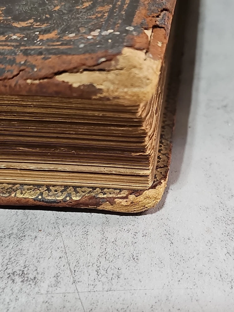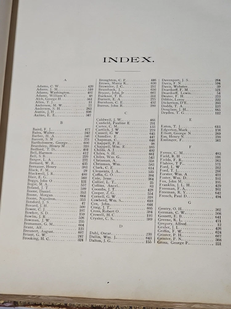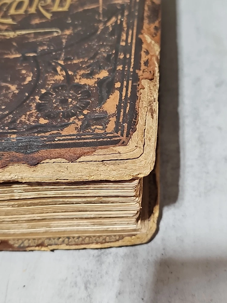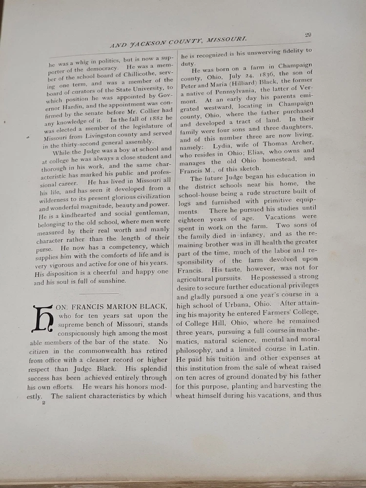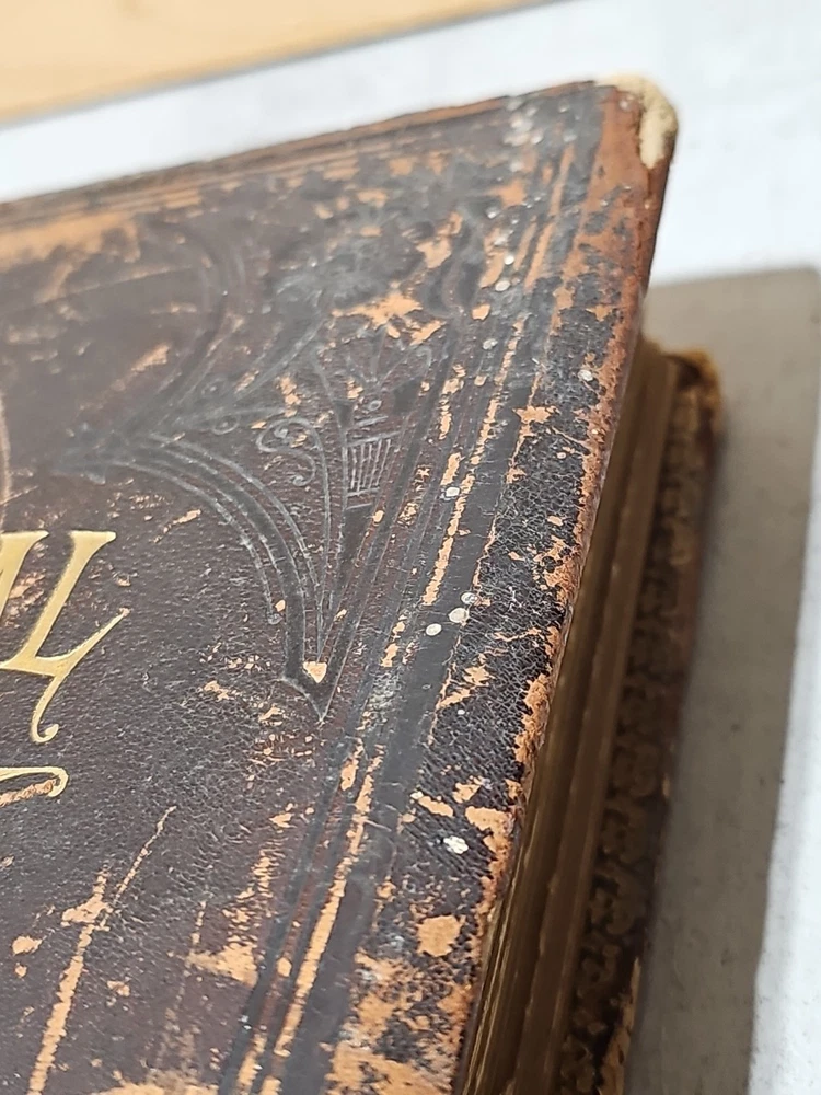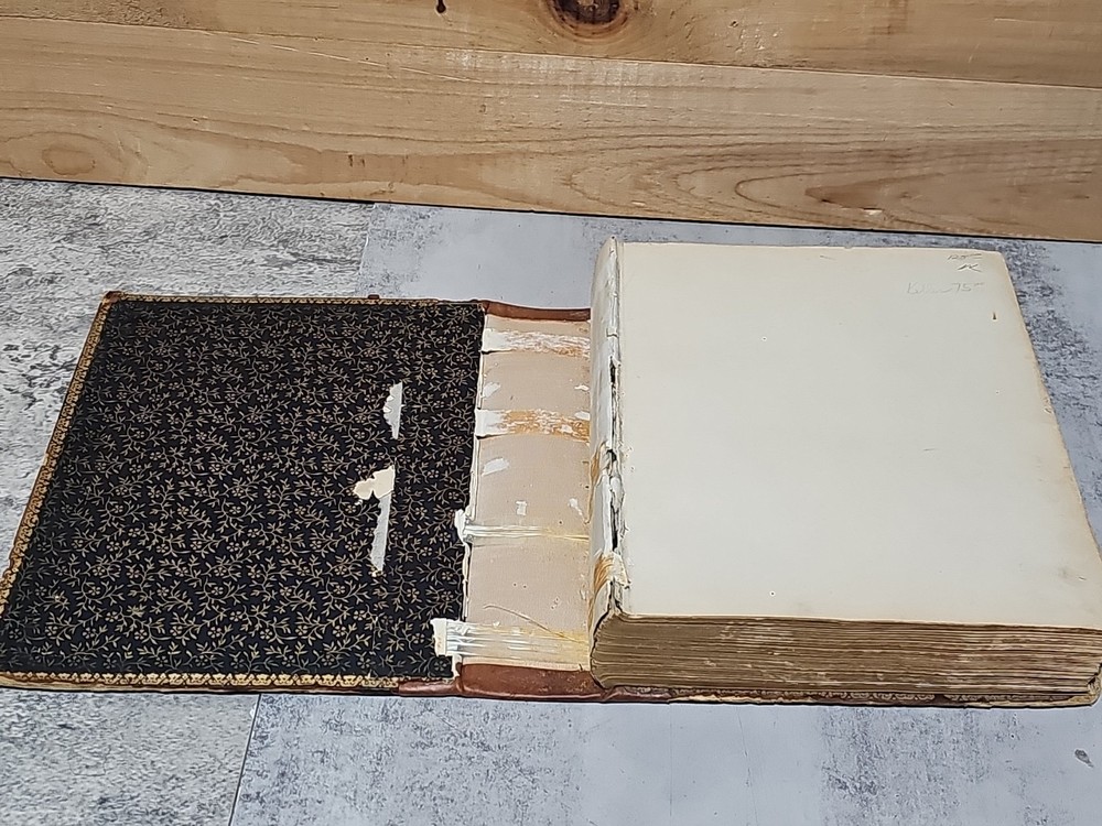 RARE Original 1896 Leather Memorial and Biographical Record of Kansas City and Jackson County (Missouri). Large leather bound book, approx. 12"x9"x3", weighs over 7 lbs. Fancy textured leather cover with gilded lettering, page gilt edge on 3 sides, fancy black & gold printed end papers. Gold stamped design bordering the endpapers. Book cover has significant wear inside and out. Binding is loose. Some of the prominent figures are illustrated with etchings or photographs and their signatures are printed below the portrait. Some of the signatures appear to be actual signatures, the ink can be felt on the page. One woman is included, with portrait, Pauline EmersonCanfield, M.D. The etchings are marked E.G. Williams & Bro. N.Y. Book is very worn, pages are yellowed and some have small tears along the edges. Please see photos for details and condition. We combine shipping on request. Local pickup is available in Pleasant Hill, Missouri.