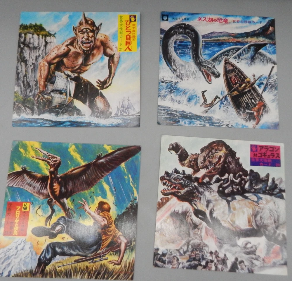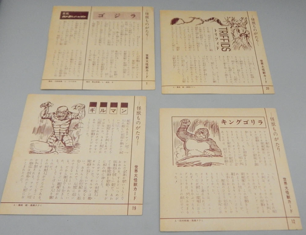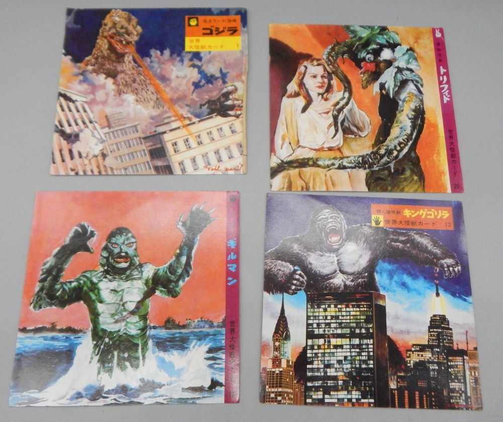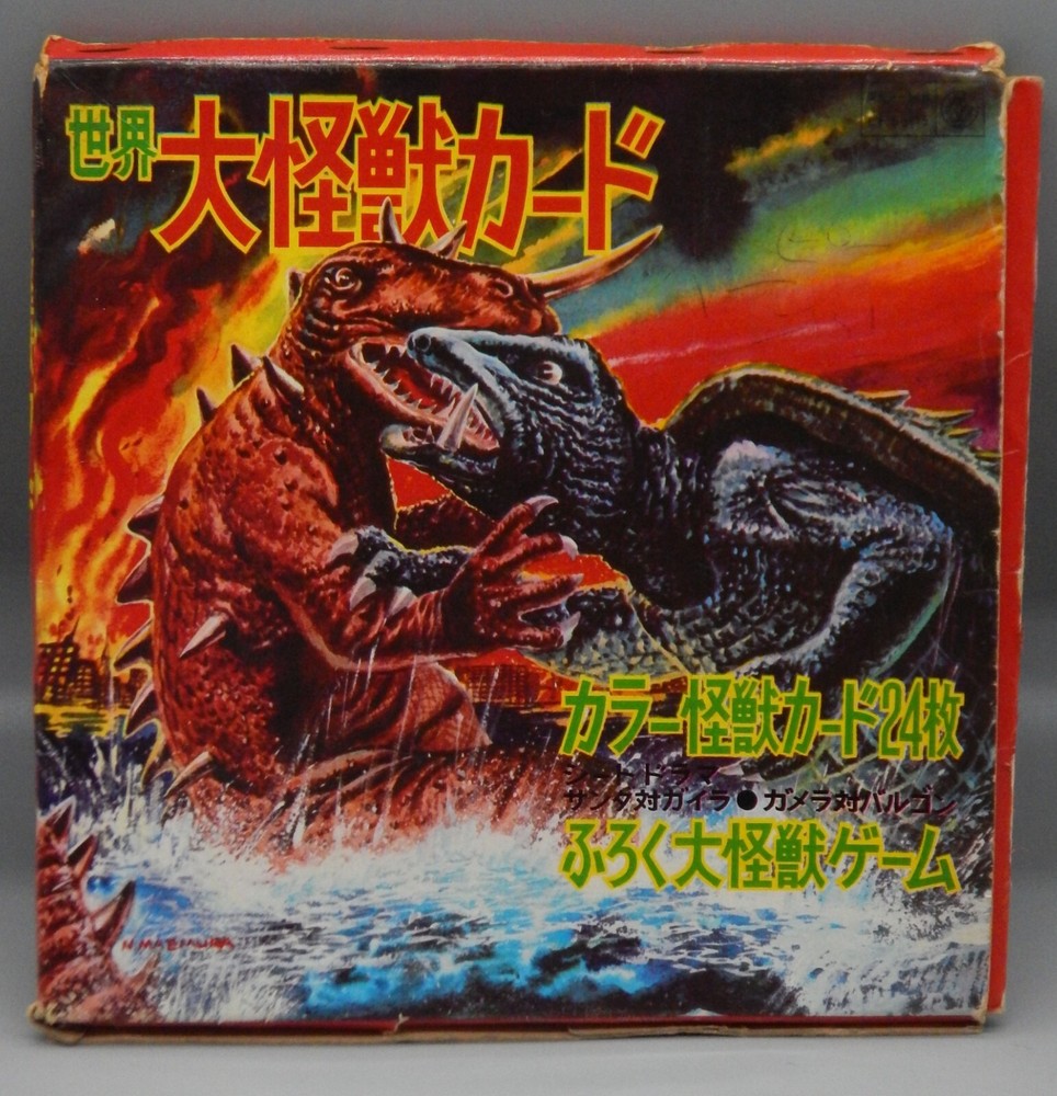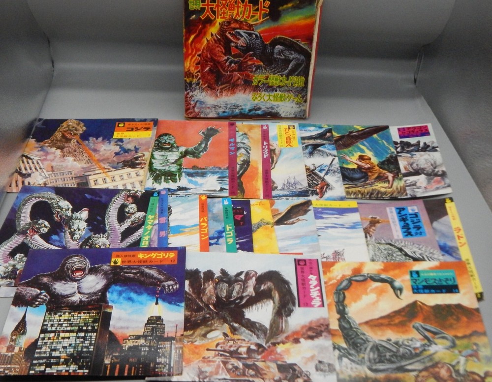 EXTREMELY RARE vintage 1960's Japanese "Daikaiju card game" which features a mix of both Japanese and Western cinematic monsters! This fabulous card game features 24 cards (measuring approximately 7" x 7") all of which feature fantastic art of famous movie monsters! This game features card with Godzilla, The Creature From The Black Lagoon, King Kong, Day of the Triffids, Kaiju including Maguma, Mothra, Dogora, Frankenstein vs. Baragon, Rodan, Godzilla, Invasion of Astro-Monster, and more! The cards and original box show wear, with dings and dents, as well as chipping and paperloss due to the aged and dry paper. The card set is NOT COMPLETE, and is missing other Universal monster cards including the Wolfman, Frankenstein, and Dracula. Overall a rare and fantastic addition to any monster collection! PLEASE SEE PHOTOS FOR DETAILS. Check our other auctions for similar items & to save on shipping. All items are sold as-is and we do not accept returns, so please ask any questions you may have before bidding. ZERO FEEDBACK or other questionable bidders, please email to obtain permission to participate in our auctions BEFORE bidding. Please feel free to stop by our RETAIL LOCATION to view items in person at: 912 W. Burnside - Portland, OR 97209.