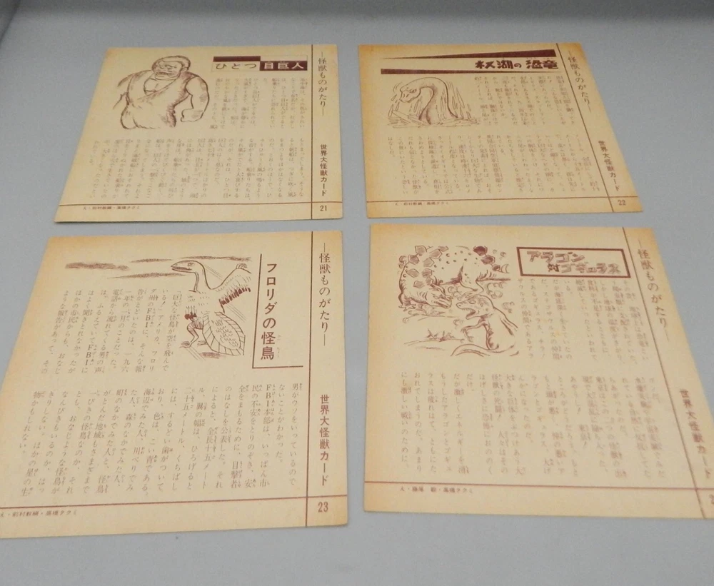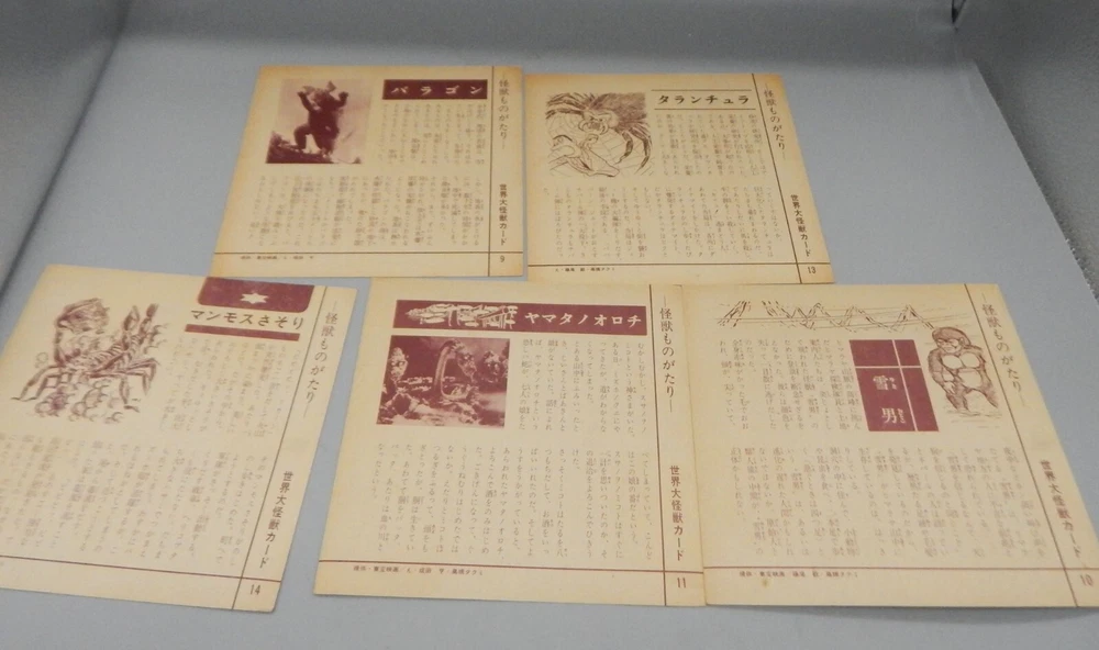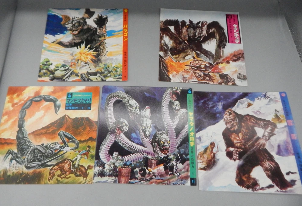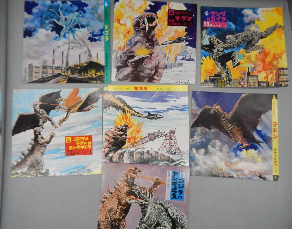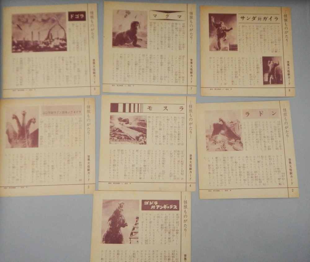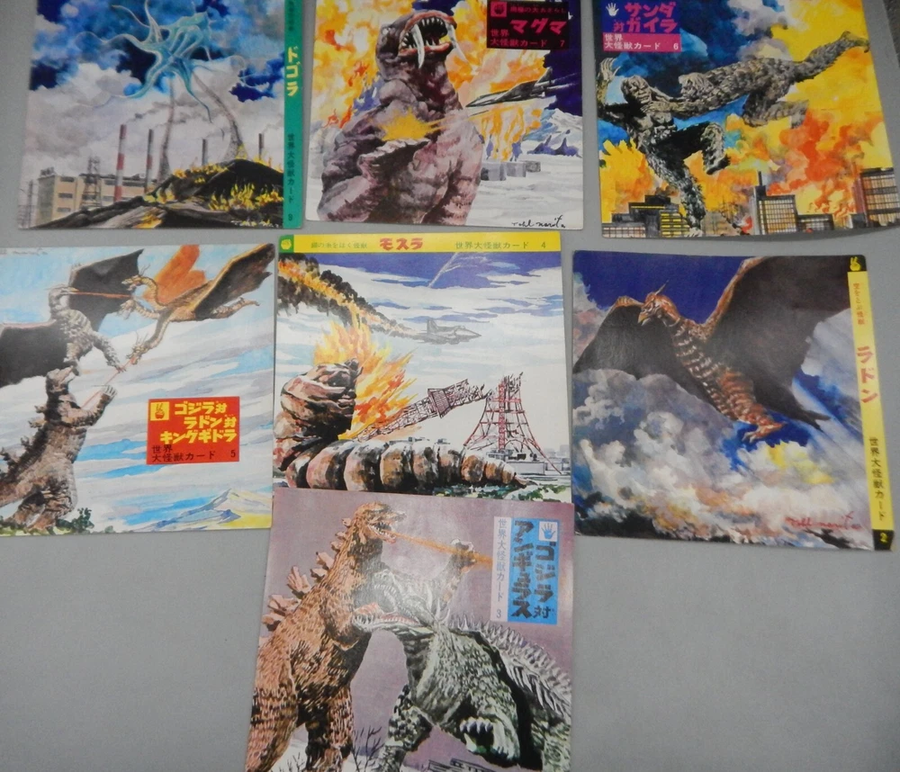 EXTREMELY RARE vintage 1960's Japanese "Daikaiju card game" which features a mix of both Japanese and Western cinematic monsters! This fabulous card game features 24 cards (measuring approximately 7" x 7") all of which feature fantastic art of famous movie monsters! This game features card with Godzilla, The Creature From The Black Lagoon, King Kong, Day of the Triffids, Kaiju including Maguma, Mothra, Dogora, Frankenstein vs. Baragon, Rodan, Godzilla, Invasion of Astro-Monster, and more! The cards and original box show wear, with dings and dents, as well as chipping and paperloss due to the aged and dry paper. The card set is NOT COMPLETE, and is missing other Universal monster cards including the Wolfman, Frankenstein, and Dracula. Overall a rare and fantastic addition to any monster collection! PLEASE SEE PHOTOS FOR DETAILS. Check our other auctions for similar items & to save on shipping. All items are sold as-is and we do not accept returns, so please ask any questions you may have before bidding. ZERO FEEDBACK or other questionable bidders, please email to obtain permission to participate in our auctions BEFORE bidding. Please feel free to stop by our RETAIL LOCATION to view items in person at: 912 W. Burnside - Portland, OR 97209.