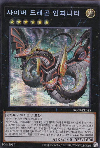 [RC03-KR025 A] Secret Rare "Cyber Dragon Infinity" ALT ART Korean Product Description: [RC03-KR025 A] Secret Rare "Cyber Dragon Infinity" ALT ART Korean Single Card + Sleeve + Top loader (Case) Mint Condition (Made in Korea) 100% Genuine Product of Konami (Korean Version) All singles cards are never used, fresh from the pack. (also available for combined shipping) Store Policy Items will be shipped from South Korea, 1 ~ 3 business days after order. All the items, we are selling, include manufacturers' warranty and do strict inspection & packaging before shipping. We use Korea Post / Rincos International Priority Airmail. All of our shipping provide tracking number. (Standard & Expedited) Standard: 10 ~ 20 business days (+ Tracking Number) Expedited: 5 ~ 10 business days (+ Tracking Number) We do accept all reasonable request and offer.