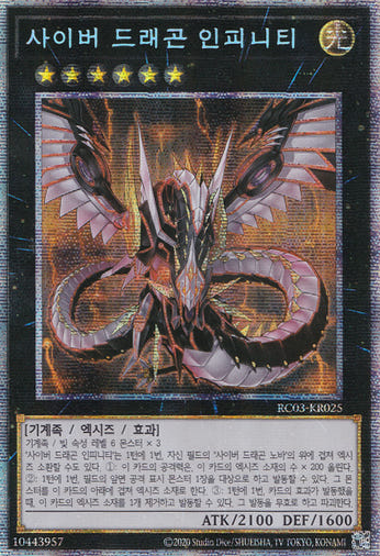 [RC03-KR025] Prismatic Secret Rare "Cyber Dragon Infinity" Korean Product Description: [RC03-KR025] Prismatic Secret Rare "Cyber Dragon Infinity" Korean Single Card + Sleeve + Top loader (Case) Mint Condition (Made in Korea) 100% Genuine Product of Konami (Korean Version) All singles cards are never used, fresh from the pack. (also available for combined shipping) Store Policy Items will be shipped from South Korea, 1 ~ 3 business days after order. All the items, we are selling, include manufacturers' warranty and do strict inspection & packaging before shipping. We use Korea Post / Rincos International Priority Airmail. All of our shipping provide tracking number. (Standard & Expedited) Standard: 10 ~ 20 business days (+ Tracking Number) Expedited: 5 ~ 10 business days (+ Tracking Number) We do accept all reasonable request and offer.