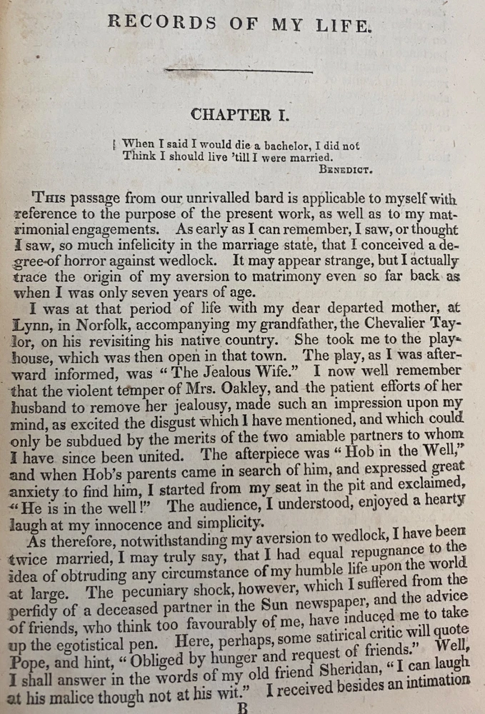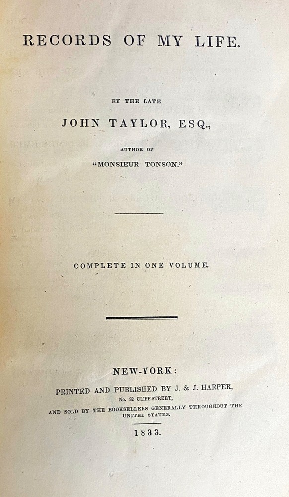 RECORDS OF MY LIFE by John Taylor, Esq. 1833 Oculist & Drama Critic RECORDS OF MY LIFE by John Taylor, Esq. 1833 Oculist & Drama Critic POB#59530 TITLE: Records of My Life AUTHOR: John Taylor, Esq., MD PUBLISHER: New York: J & J Harper DATE: 1833 DESCRIPTION: 1 preliminary leaf, [v]-xi, [13]-461 pages ; 23 cm. CONDITION NOTES: ACCEPTABLE. Front board detached. Spine covered in modern library cloth, which once held the front cover and is currently adhered to spine and back cover. The original spine leather appears tightly held in the library cloth adhesive. If correct preservation practice was followed (probable) the the original spine can be soaked away from the cloth to be put on a new binding. BINDING: Sheep half over blue marbled boards. . John Taylor (1757–1832) was an English oculist, drama critic, editor and finally newspaper publisher, perhaps most famous for his posthumous memoir Records of My Life. Listing and template services provided by inkFrog
