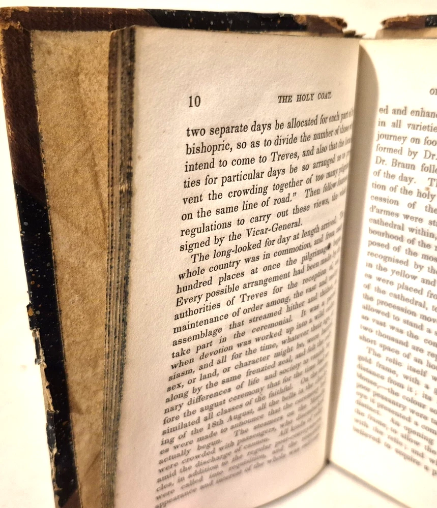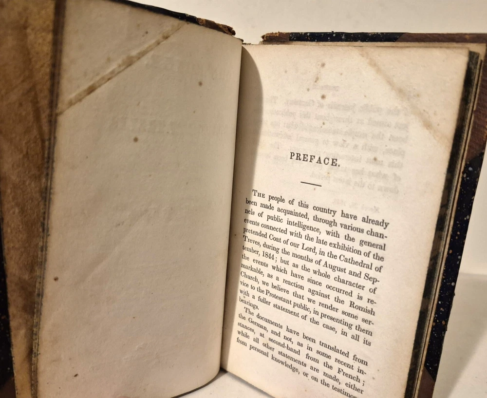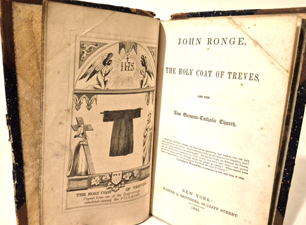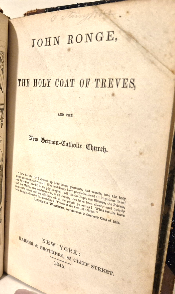 JOHN RONGE: THE HOLY COAT OF TREVES New German-Catholic Church JOHN RONGE - THE HOLY COAT OF TREVES AND THE NEW GERMAN-CATHOLIC CHURCH .......Published by Harper and Brothers in 1845...... DESCRIPTION - The book is bound with a leather spine......The book measures about 6 1/2 inches high and about 4 1/2 inches across the front...... CONDITION - The little fella is in overall good condition, with damage ......The pages are overall good, with a stained area on the upper corner of the first few pages, and with spots, mostly on the endpapers.....The cover has lots of wear and use, shown in the pictures in the gallery...… And both hinges are cracked from top to bottom, and will need careful handlin’ to stay attached - the covers are almost detached. ..........This is a very readable and useable book - but do handle it with care……….I think you will be pleased with it...... PAYMENT AND SHIPPIN ' - 'Course the thrilled winner is gonna hafta pay $5.45 for postage and handlin'........Multiple purchases save on shippin'..... ... Now while you're here, why don't you give my other auctions a look-see...Why, I 'spect I got a wagon load of mighty good books over yonder in my Book Barn..... Thanks a heap....!!! - - - ol' arkee