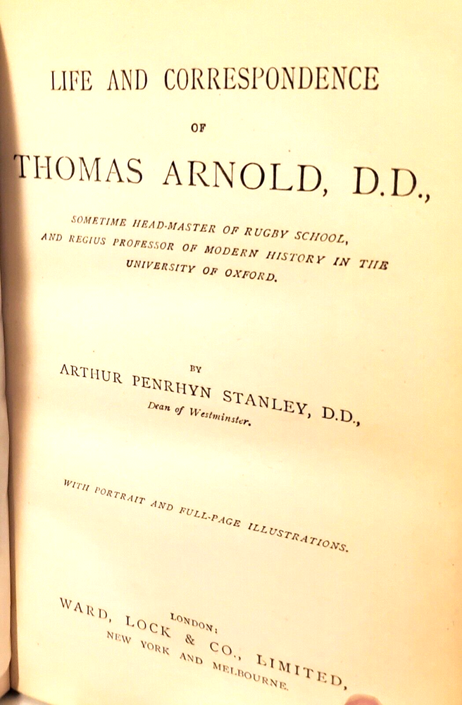 THE LIFE AND CORRESPONDENCE OF THOMAS ARNOLD A P Stanley THE LIFE AND CORRESPONDENCE OF THOMAS ARNOLD, by A P Stanley ...... Headmaster of Rugby School, and Regius Professor of Modern History in the University of Oxford ...... Published by Ward, Lock and Co. - I don't see a publication date, but the book appears to be from the late 1800s... Some very nice full-page illustrations .… .... .. DESCRIPTION - The book is bound with leather, with MARBLED ENDPAPERS...Mercy...!!!...... CONDITION - The book is in overall good condition.....The pages are good, with the edges darkened..... …The cover has general wear and use, with the front cover detached - please look at the pictures in the picture gallery..............Even with the detached cover, this is still a purty good ol' book.. ......I think you will be pleased with it ... PAYMENT AND SHIPPIN' - 'Course the thrilled buyer is gonna hafta pay $4.95 for shippin' and handlin'.... ....Multiple purchases save on shippin'... ...Now while you're here, why don't you give my other auctions a look-see...Why, I 'spect I got a wagon load of mighty good books over yonder in my Book Barn... Thanks a heap....!! - - - ol' arkee