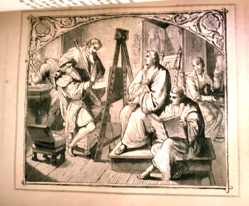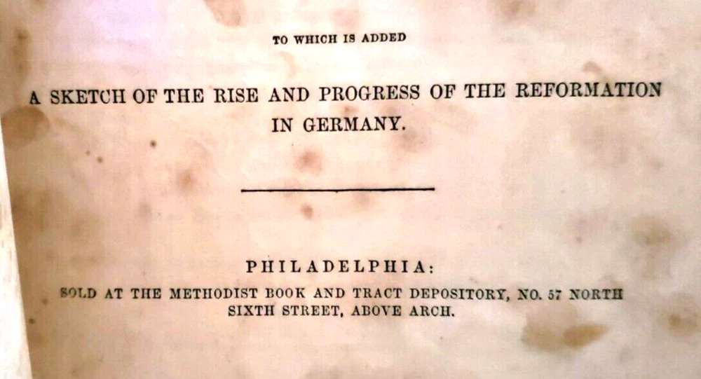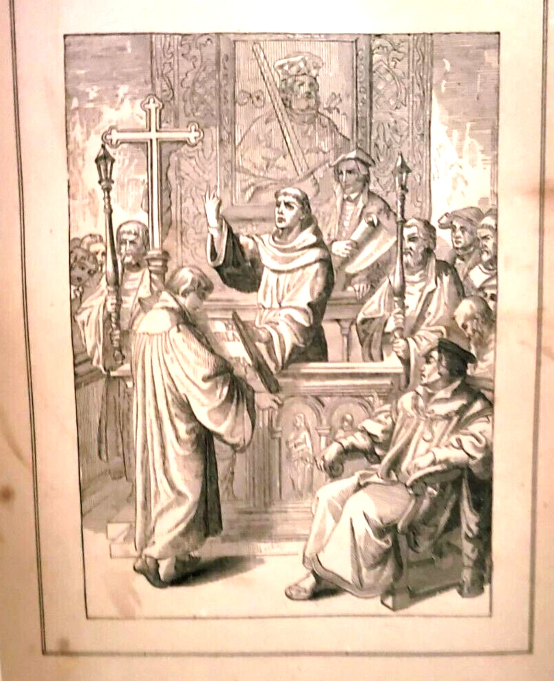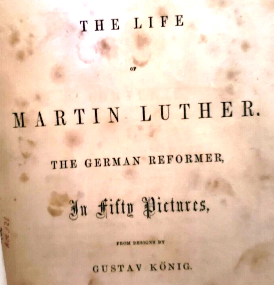 THE LIFE OF MARTIN LUTHER Gustav Konig THE LIFE OF MARTIN LUTHER - THE GERMAN REFORMER - IN FIFTY PICTURES, from designs by Gustave Konig......And includes a sketch of the rise and progress of the Reformation in Germany ...... ... Published by the Methodist Book and Tract Depository, Philadelphia...... Illustrated ..... ... ... DESCRIPTION - The book is bound with full tooled leather, with gold letterin' on the spine, and with colored endpapers - - - and the pages are tipped with gold....This is a very decorative book, and a purty big book.....It measures about 10 inches high, and about 7 1/2 inches across front ..... CONDITION - The big fella is in overall good condition, with a damaged cover - bless its heart .......The pages are good, with the bottom of the early page edges chewed away, does not at all affect the readin' ,....……The cover is solid, with some wear and use, and with a large part of the bottom front corner chewed away- by my dog - please look at the pictures in the gallery - (By the way, it costs a lot to have a dog put to sleep). ...........The gnawed on cover looks bad, but the pages have held up well - this is a very readable and useable book.……I think you will be pleased with it ...... ... PAYMENT AND SHIPPIN' - 'Course the thrilled buyer is gonna hafta pay $7.95 for shippin' and handlin' ... . ....Multiple purchases save on shippin' ... ... Now while you're here, why don't you give my other auctions a look-see...Why, I 'spect I got a wagon load of mighty good books over yonder in my Book Barn..... Thanks a heap....!!! - - - ol' arkee