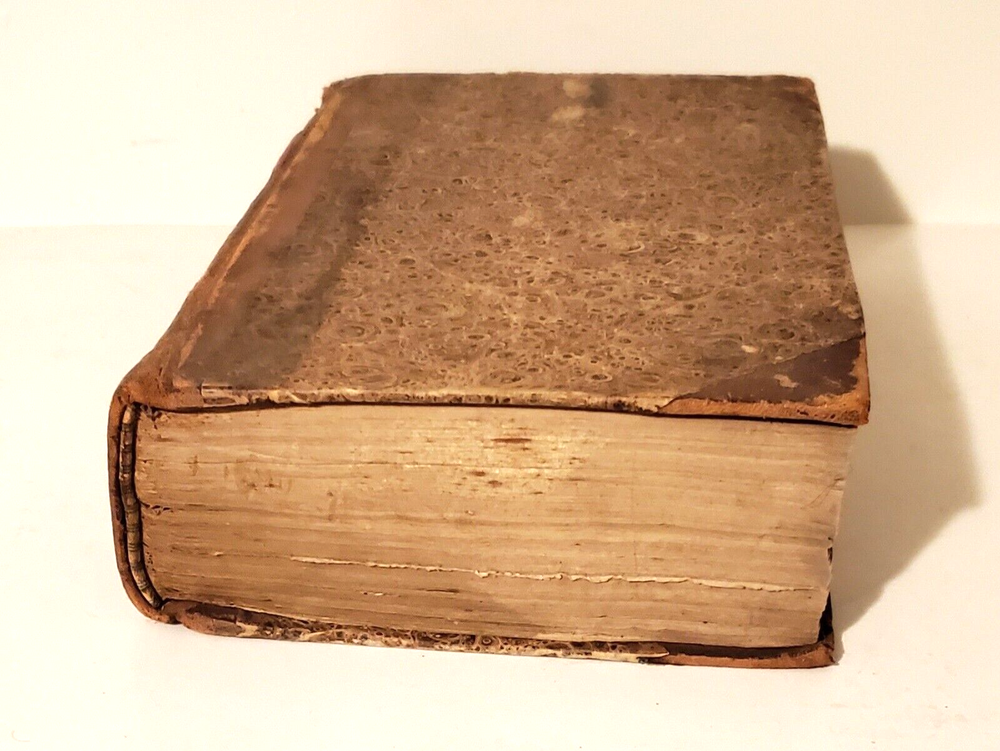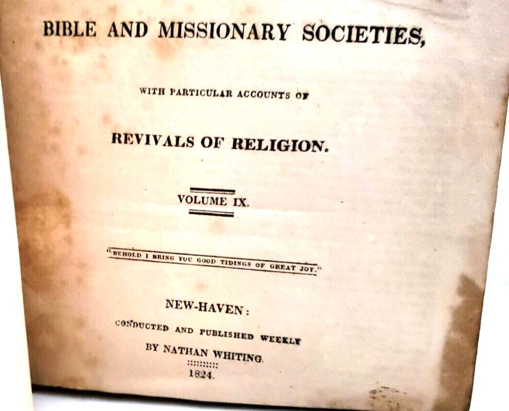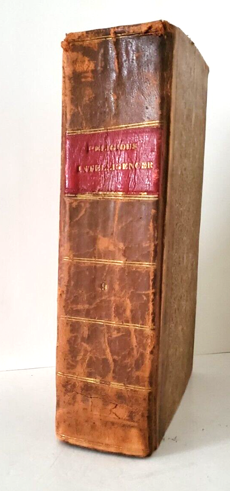 RELIGIOUS INTELLIGENCER FOR THE YEAR ENDING MAY, 1825 RELIGIOUS INTELLIGENCER - FOR THE YEAR ENDING MAY, 1825... Volume IX - containing the principal transactions of the various Bible and Missionary Societies, with particular accounts of Revivals of Religion … ……Published by Nathan Whiting, New Haven, in 1824..... DESCRIPTION - Hardback, bound with a leather spine... CONDITION - The ol' fella is in much used condition.......The pages are good for age, with what I would call a fairly light old book scent, with a few folds and tears, and with one page loose...And there are waves from age on the pages ....….The cover has general wear and use, and with the spine leather dried ……The book definitely shows its age, but still aa purty good ol' book…… I think you will be pleased with it........…… PAYMENT AND SHIPPIN ' - ... .'Course the thrilled buyer is gonna hafta pay $4.95 for shippin' and handlin'......Multiple purchases save on shippin' .... ..... Now while you're here, why don't you give my other auctions a look-see...Why, I 'spect I got a wagon load of mighty good books over yonder in my Book Barn... Thanks a heap....!!! - - - ol' arkee *
