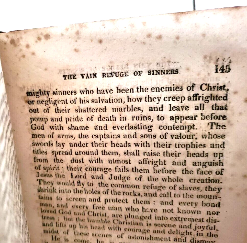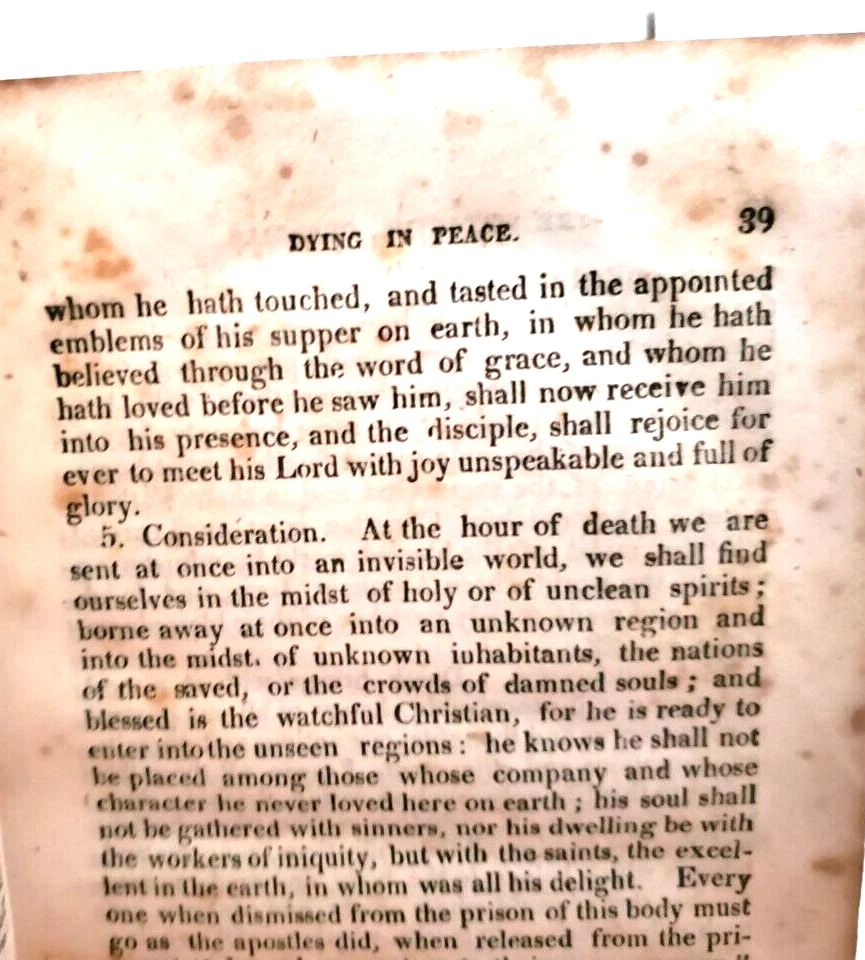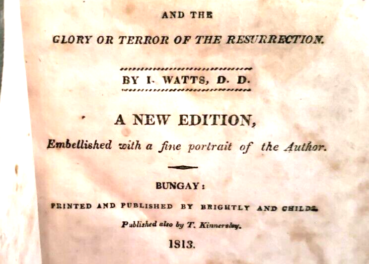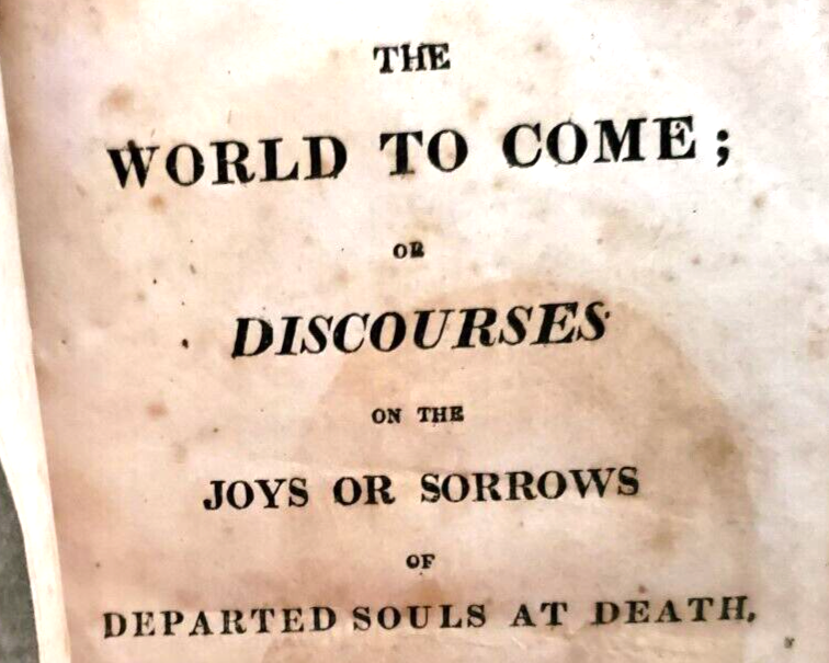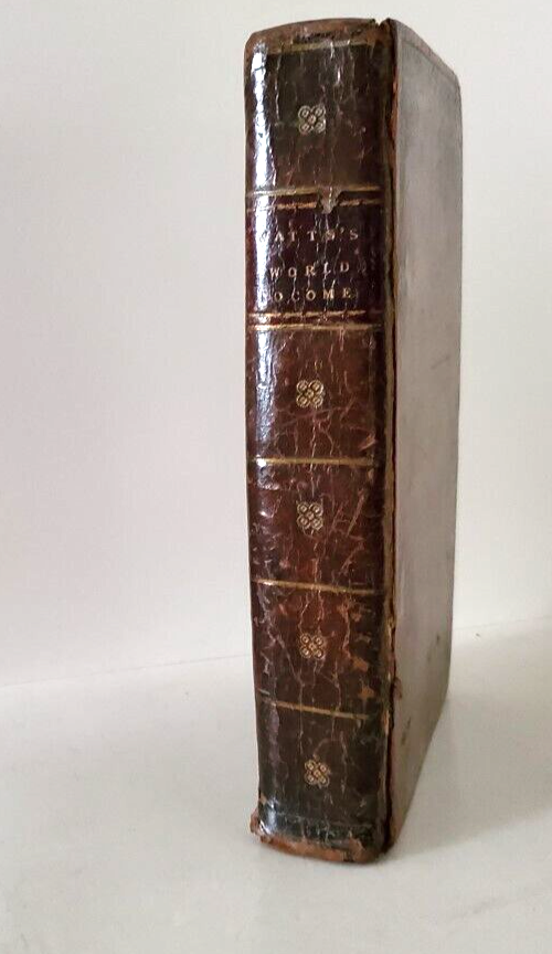 THE WORLD TO COME I. Watts THE WORLD TO COME; or DISCOURSES ON THE JOYS OR SORROWS OF DEPARTED SOULS AT DEATH, by I. Watts ...... ... Published by Brightly and Childs in 1813, a Newq Edition .... .... A New Edition ... DESCRIPTION - The book is bound with a full leather cover ..... CONDITION - The book is in good used condition.......The pages are good for age, with the edges darkened, and with spots, but the pages are very readable ....…… The covers have general wear and use, with a torn area on the back, and with the hinges cracked, and the front cover is detached - so the book must be handled with care ..........This is a purty good ol' book - but do handle it with care......I think you will be pleased with it ....... PAYMENT AND SHIPPIN' - 'Course the thrilled buyer is gonna hafta pay $4.95 for shippin' and handlin' ... . ....Multiple purchases save on shippin' ... ... Now while you're here, why don't you give my other auctions a look-see...Why, I 'spect I got a wagon load of mighty good books over yonder in my Book Barn..... Thanks a heap....!!! - - - ol' arkee