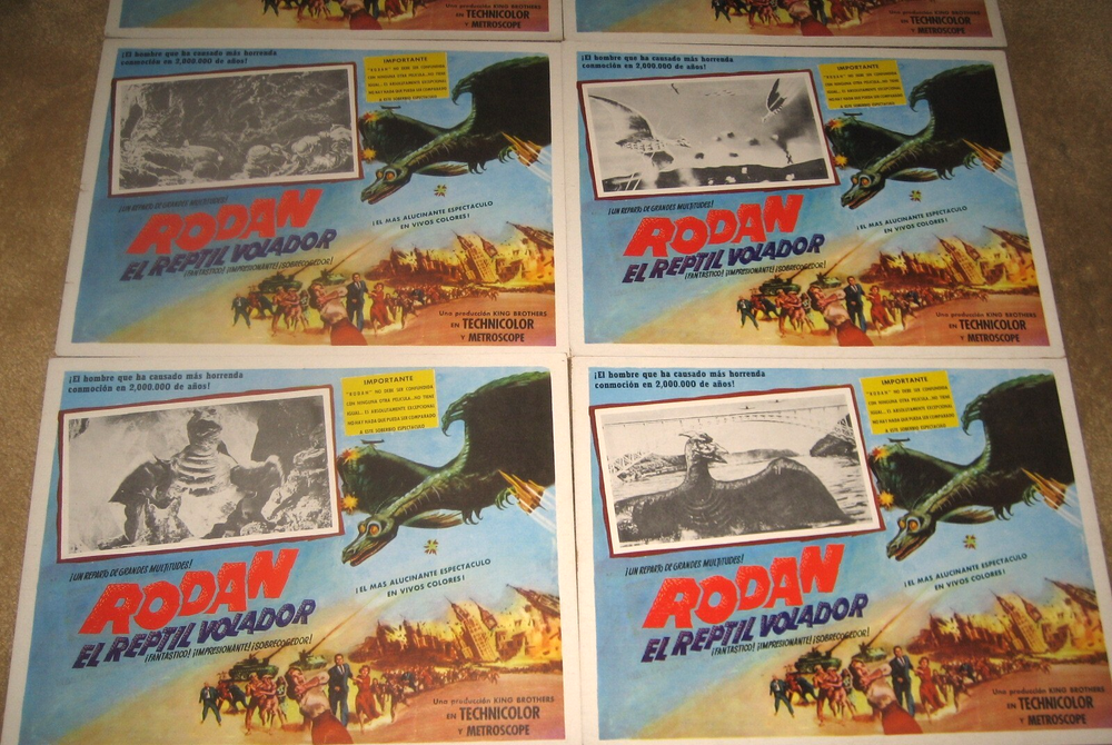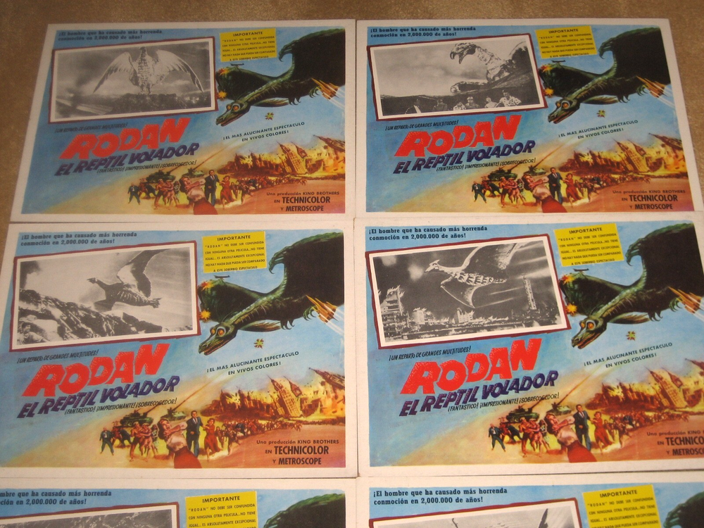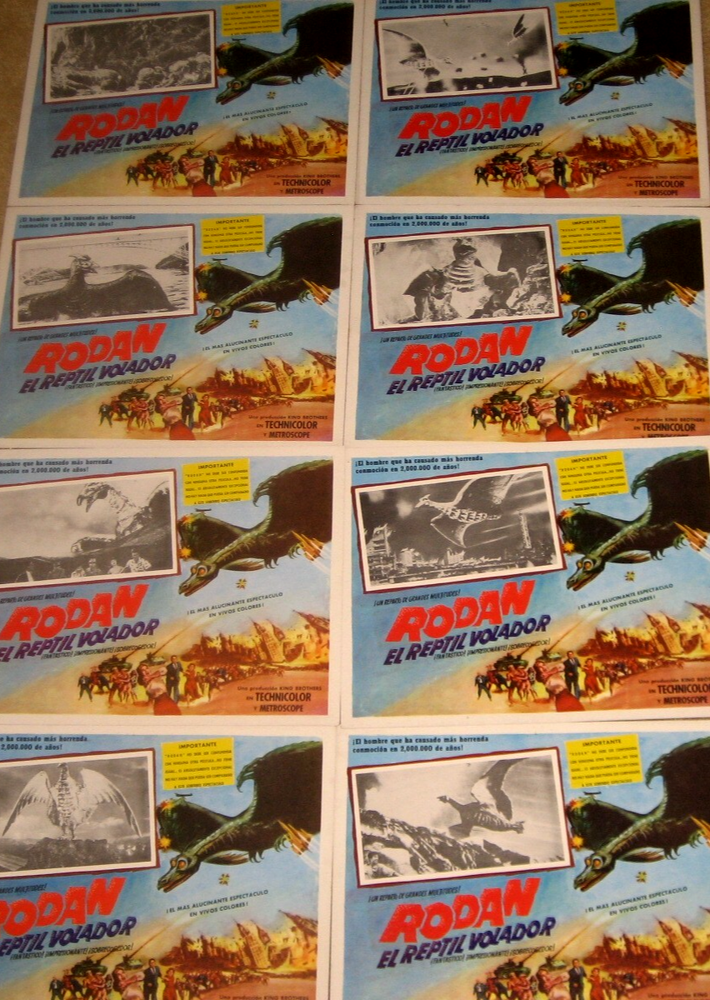 Thanks for looking at my listing. . I have been a collector, dealer, trader, hoarder of MONSTER MAGAZINES , ORIGINAL Horror / monster movie posters, lobby cards & more for over 30 yrs. I have been an ebay seller since 2004 . I have dealt with all of the big names in the hobby. I pride myself on accurate grading and customer satisfaction. Check out my feed back. Watch for my frequent auctions for hard to find quality monster mags and movie posters. You are buying a complete set of 8 15 & 1/2 by 12 Mexican lobby cards for the great Japanese flying monster RODAN ! Cool set with lots of cool insert pics of the mighty RODAN CONDITION REPORT - VERY FINE . Really nice cards . Great color and border art . Postage and packing is $12 I pack with care. . . I combine postage for multiple wins. I WELCOME OVERSEAS BIDS , PLEASE CONTACT ME BEFORE YOU BID.