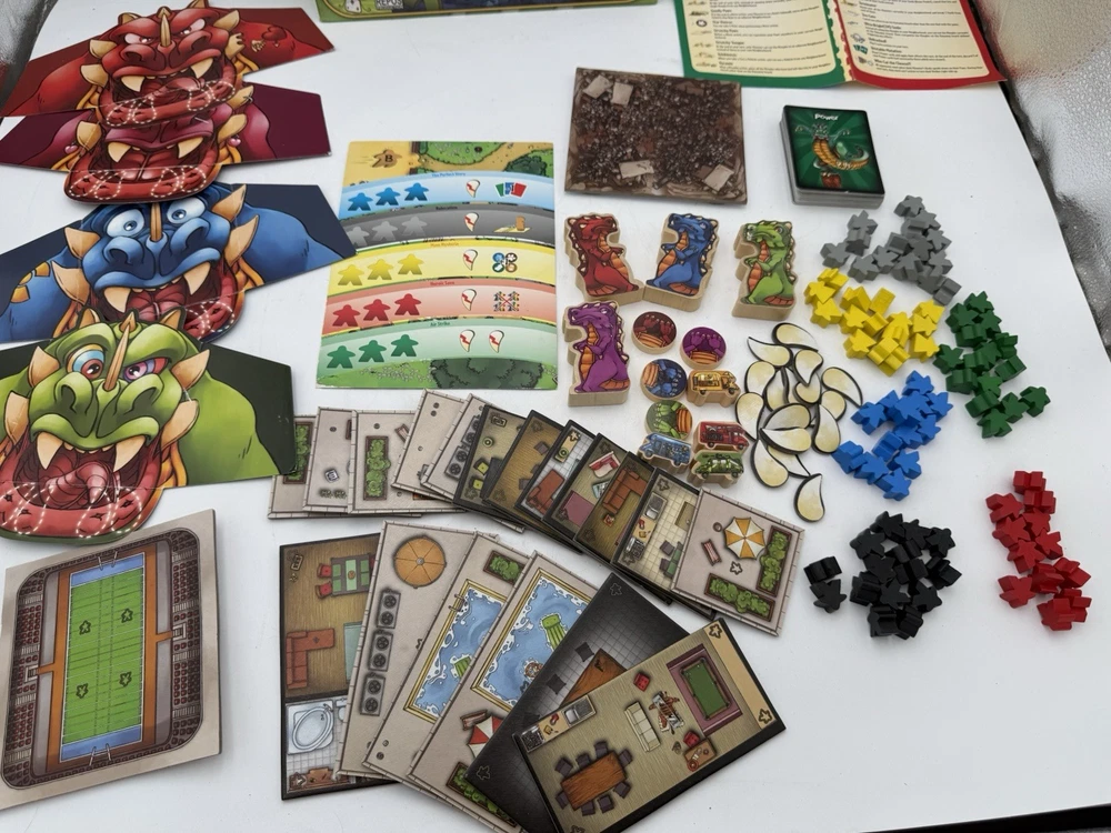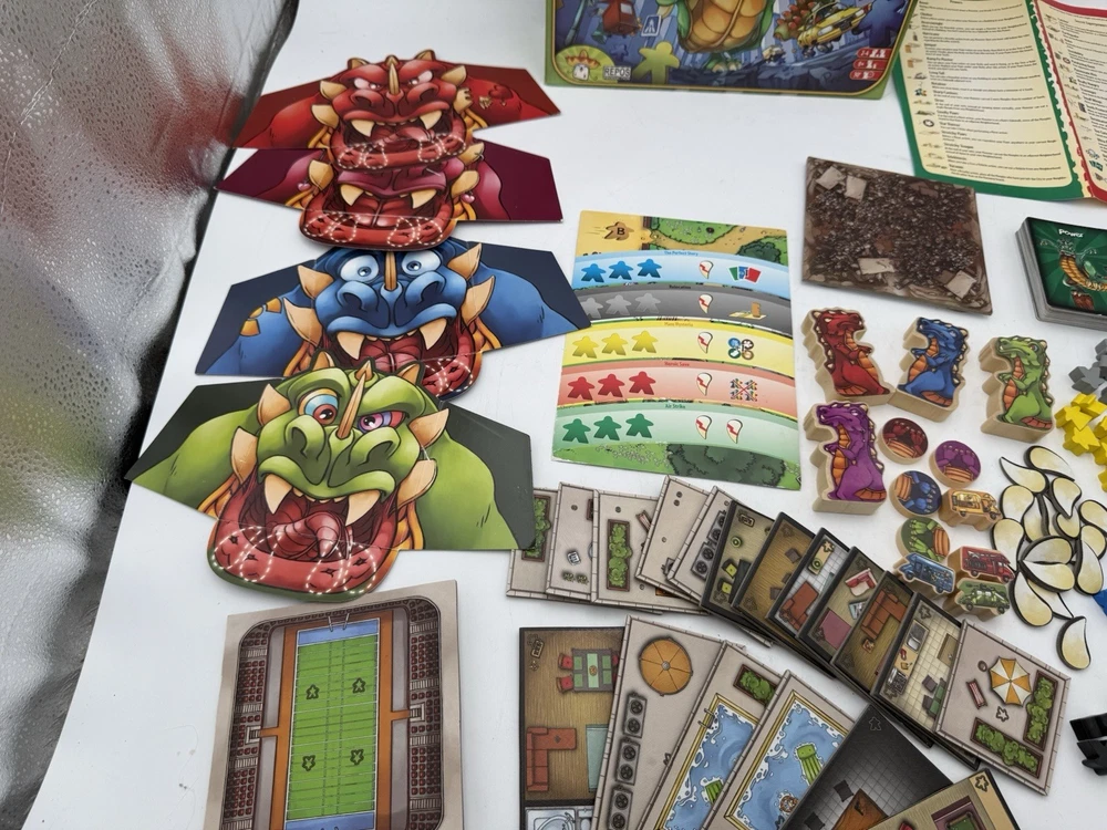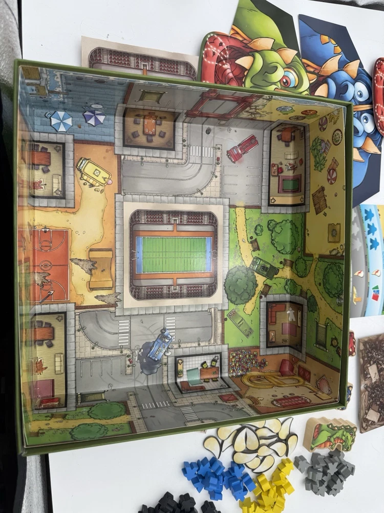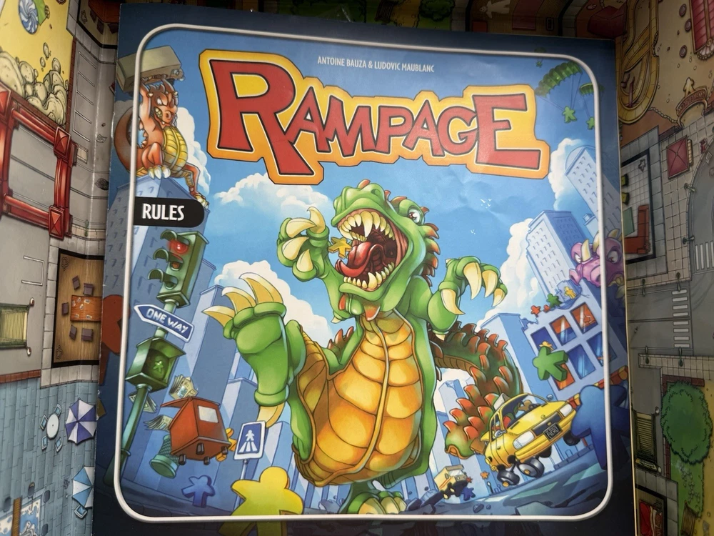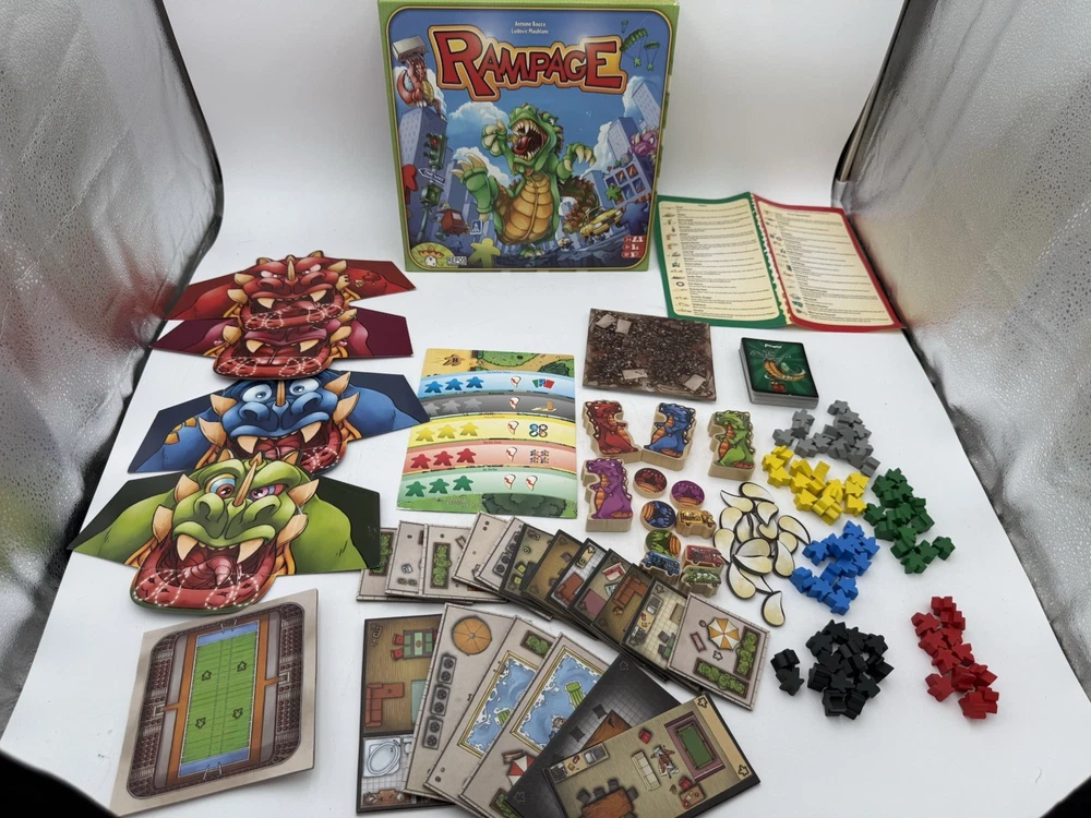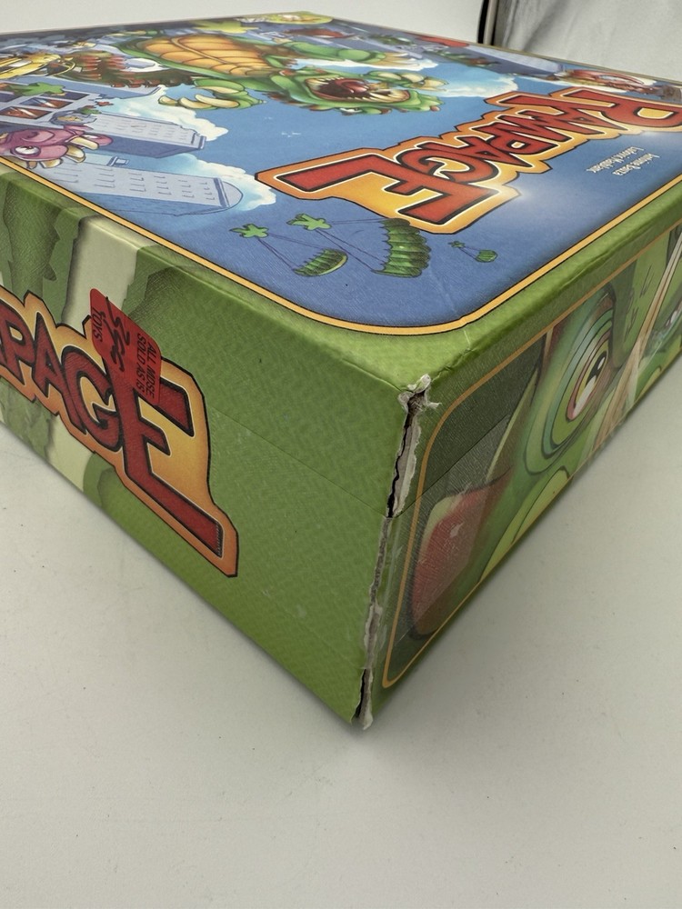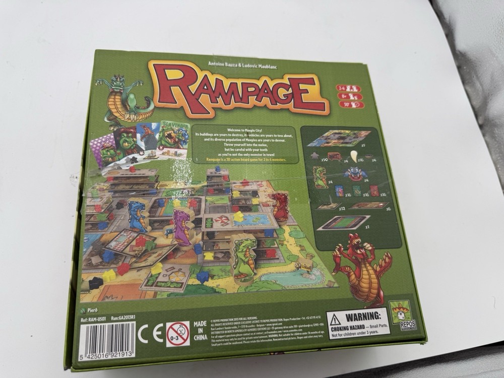 Rampage aka Terror in Meeple City Repos Production 2013 Boardgame Bauza. 2 blue and 3 red missing pieces. Ware to the box top as pictured, see pictures as best description.