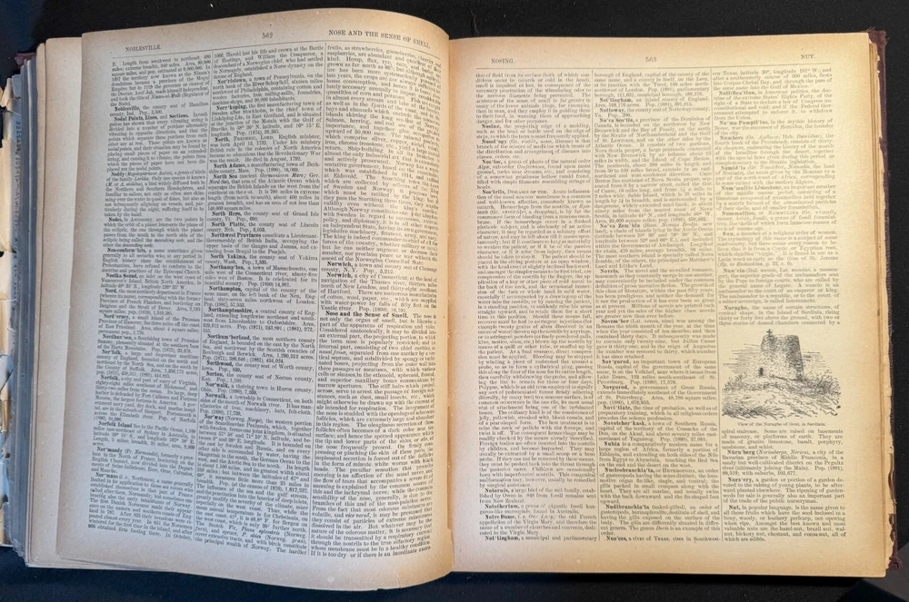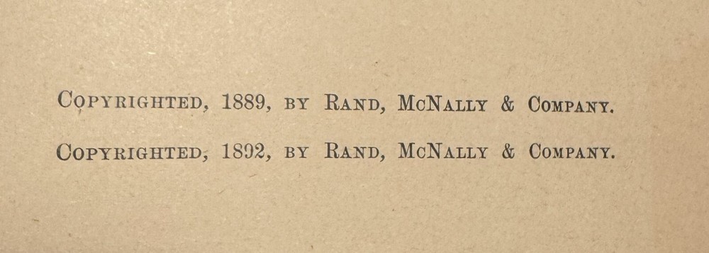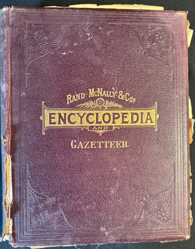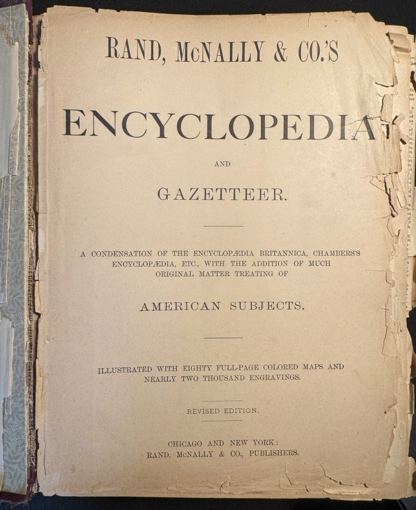 RAND-MCNALLY'S ENCYCLOPEDIA AND GAZETTEER A condensation of the Encyclopedia Britannica, Chambers' Encyclopedia, etc., with the addition of much original matter treating of AMERICAN SUBJECTS. This book was published by Rand, McNally and Co. in 1892 and is illustrated with 80 full-page colored maps and nearly 2,000 engravings. Hardcover, large book measuring about 12 inches tall, about 10 inches across the front, and is about 3 inches thick.