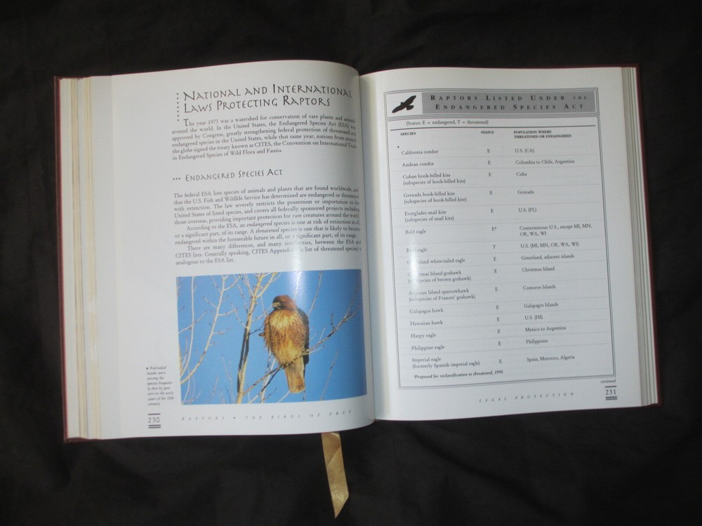 Raptors: The Birds of Prey Scott Weidensaul Easton Press Signed & Numbered First Edition 381 pages #689 of 1,000 Full Leather - 22K Gold Page Edges and Graphics - Sewn Binding - Acid Free Paper - Raised Bands on Spine - Moire End Papers - Sewn in Ribbon Page Marker ______________________________________________________ Anyone who has seen a soaring hawk, witnessed a falcon swoop down on prey, or watched an eagle on its perch knows the awesome beauty and power of a raptor. This is the first comprehensive guide to the biology, ecology and conservation of diurnal (daytime hunting) birds of prey, assembling all the facts and fables about these mysterious and glorious birds. Over 100 full-color photos.