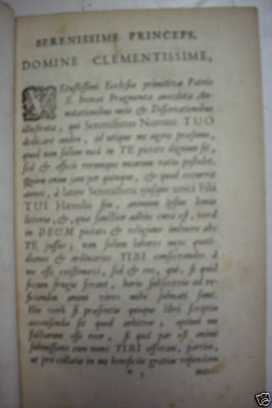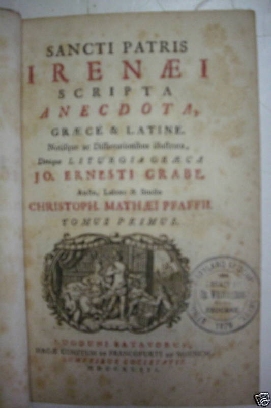 You are bidding on a very rare hardcover book. I will do my best to describe it, although it appears to be in Latin and Greek and I don't read either. I think it is the Life of Saint Irenaei but I leave it to the experts to translate. Here is what is on the title page: Sancti Patris Irenaei Scripta Anecdota, Graece & Latine. Notisque ae Dissertationibus illustrata, Denique Liturgia Graeca - Jo. Ernesti Grabe. Aueta, Labore & Studio Christoph. Mathaei Pfaffii. Tomus Primus. Lugduni Batavorum, Hagae Comitum et Francofurti Ad Moenum, Suptibus Societatie, 1743. I conducted a search and could not find another book like this one!!! There are 647 pages followed by an Index and Addenda & Emendanda. The pages are mostly clean and free of foxing, although a few pages have some foxing. The title page has the most but it is still quite readable. All pages are tightly bound. The book has hand-made laid paper. The book has leather binding, although the covers have become detached and the leather spine is dry and cracked. The book is a candidate for rebinding. There are two ink stamps and one bookplate from Stinnecke Maryland Episcopal Library - 1879 - The Legacy of Bp. Whittingham to His Diocese. Because the covers are detached, I have significantly reduced the price of this book and am selling it, as is, with no returns. This book would be a terrific addition to a collection. Very rare and very collectible! Great gift idea! (Inventory: 1462) Track Page Views With Auctiva's FREE Counter