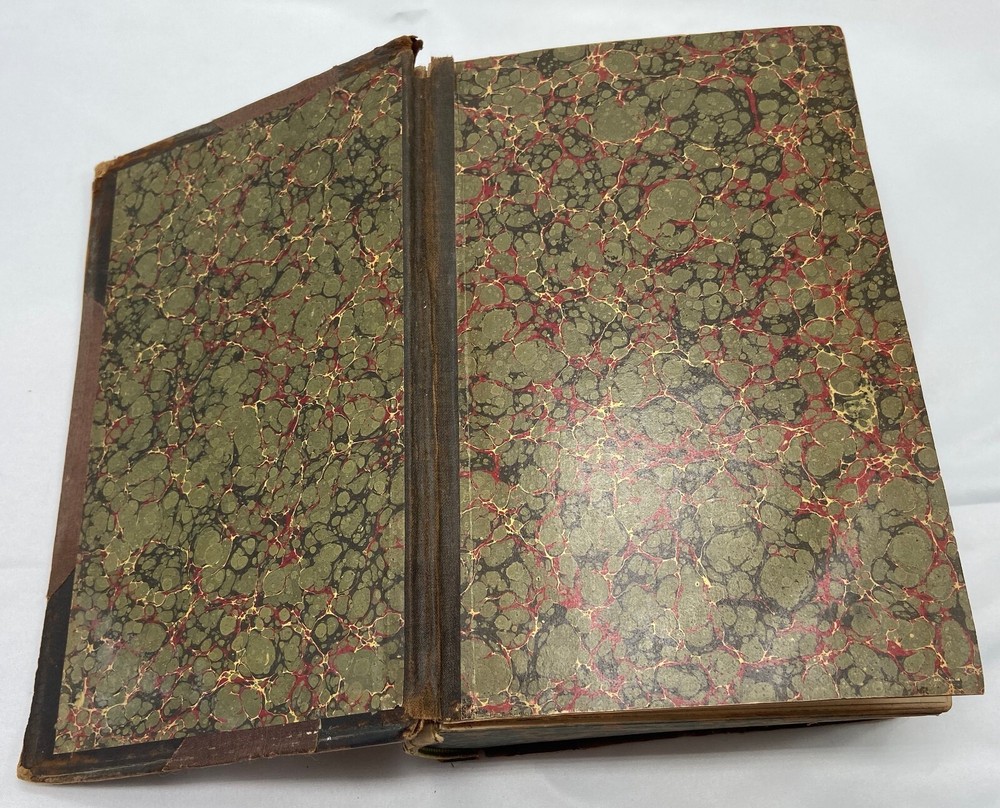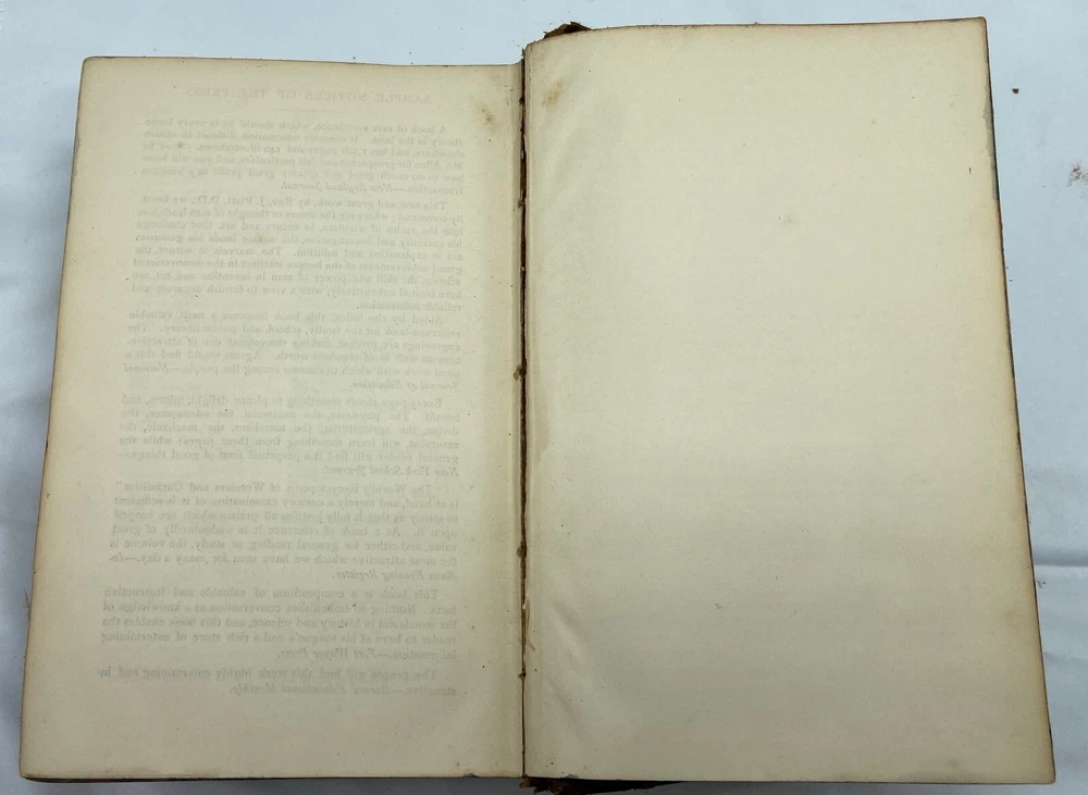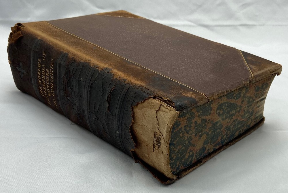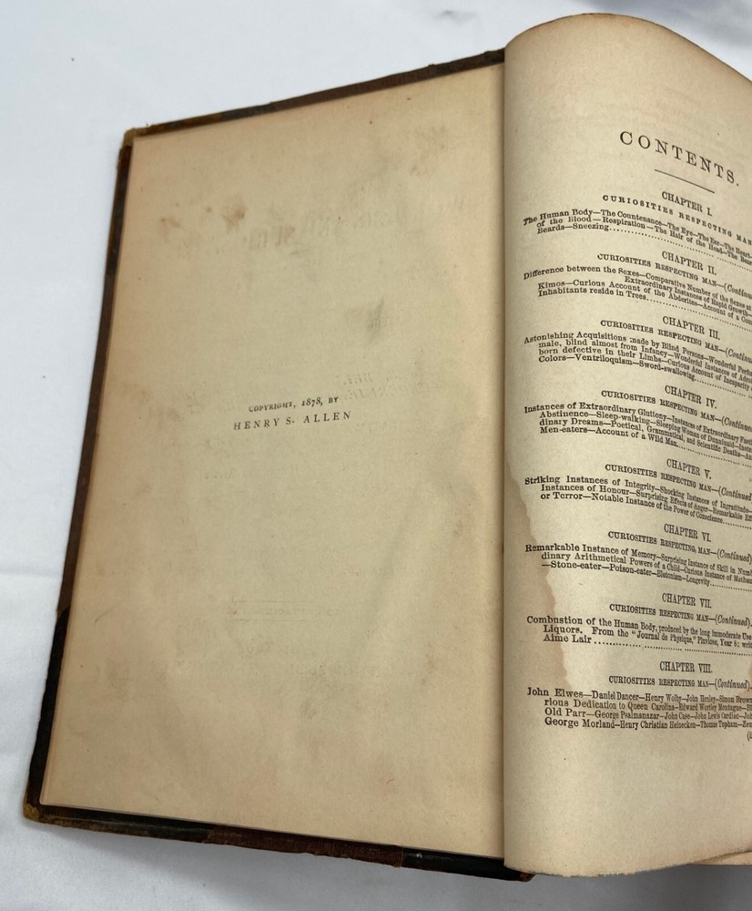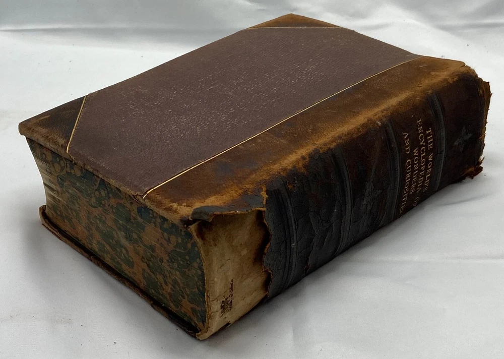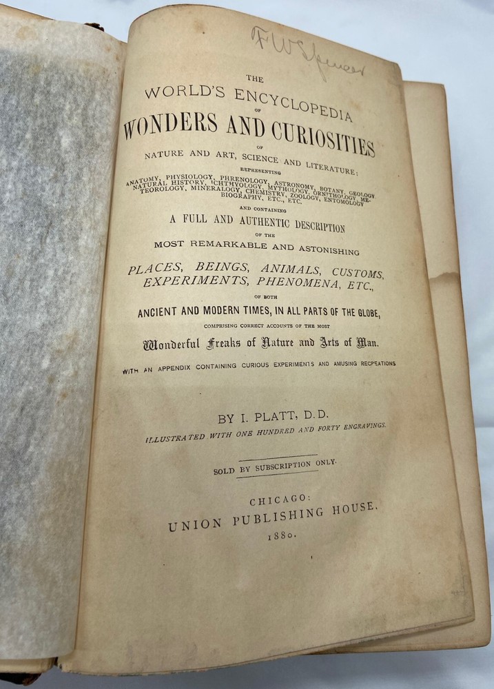 You are bidding on a rare 1880 leather-bound early edition of The World's Encyclopedia of Wonders and Curiosities of Nature and Art, Science and Literature : Representing Anatomy, Physiology, Phrenology, Astronomy, Botany, Geology, Natural History, Ichthyology, Mythology, Ornithology, Meteorology, Minearalogy, Chemistry, Zoology, Entomology, Biography, etc., etc., and Containing a Full and Authentic Description of the Most Remarkable and Astonishing Places, Beings, Animals, Customs, Experiments, Phenomena, etc., of Both Ancient and Modern Times, in All Parts of the Globe, Comprising Correct Accounts of the Most Wonderful Freaks of Nature and Arts of Man, with an Appendix Containing Curious Experiments and Amusing Recreations, by I. Platt , D.D., with 140 illustrations, published in 1880 by Union Publishing House (Chicago, Illinois). Copyright 1878 by Henry S. Allen. Hardcover, leather-bound. 959 pp. Dimensions: approximately 9.5" x 7" x 3". Weight: approximately 4 lbs. This is a complete and intact copy. No markings noted, other than previous owner's name written in pencil at top of title page. Some splitting of the binding at pp. iv-v (table of contents) (see images), but the marbled endpapers are intact. There is at least one flower pressed between the pages (see images), which I have left as is. Some pages show "shadows" from possible moisture, but it is not serious. Leather binding is crumbling and dusting in places but it, too, though tattered, is intact. See images, which are of the actual item, not stock photos.