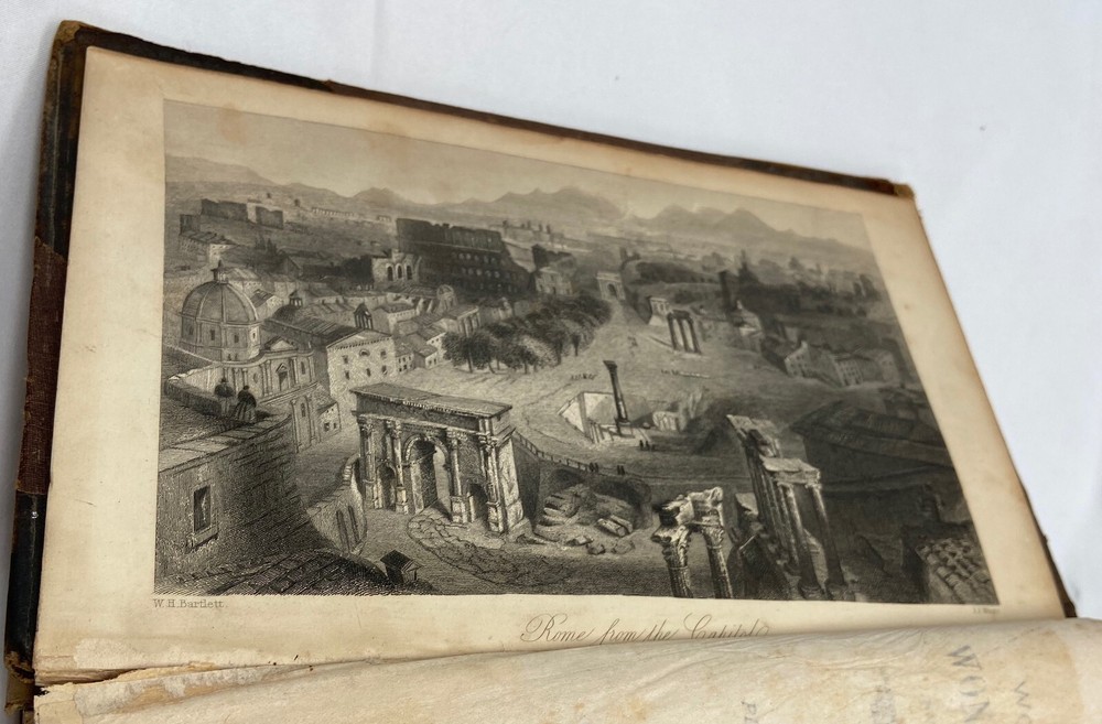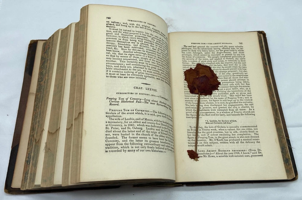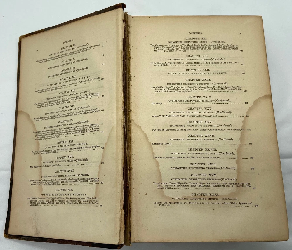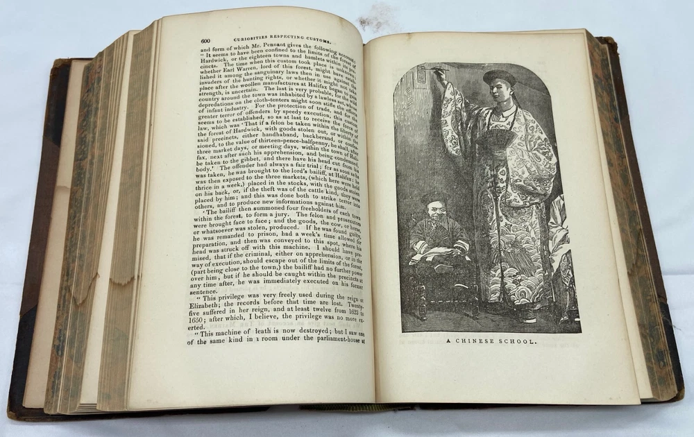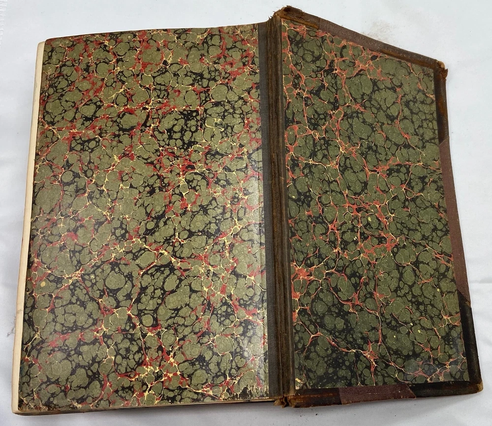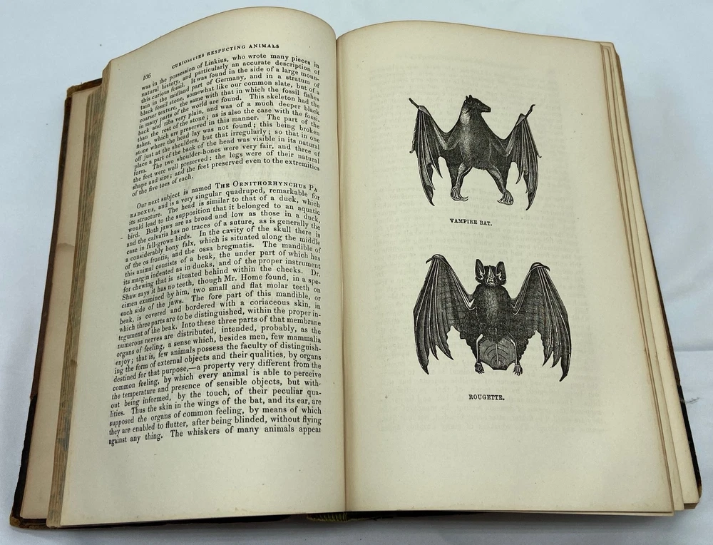 You are bidding on a rare 1880 leather-bound early edition of The World's Encyclopedia of Wonders and Curiosities of Nature and Art, Science and Literature : Representing Anatomy, Physiology, Phrenology, Astronomy, Botany, Geology, Natural History, Ichthyology, Mythology, Ornithology, Meteorology, Minearalogy, Chemistry, Zoology, Entomology, Biography, etc., etc., and Containing a Full and Authentic Description of the Most Remarkable and Astonishing Places, Beings, Animals, Customs, Experiments, Phenomena, etc., of Both Ancient and Modern Times, in All Parts of the Globe, Comprising Correct Accounts of the Most Wonderful Freaks of Nature and Arts of Man, with an Appendix Containing Curious Experiments and Amusing Recreations, by I. Platt , D.D., with 140 illustrations, published in 1880 by Union Publishing House (Chicago, Illinois). Copyright 1878 by Henry S. Allen. Hardcover, leather-bound. 959 pp. Dimensions: approximately 9.5" x 7" x 3". Weight: approximately 4 lbs. This is a complete and intact copy. No markings noted, other than previous owner's name written in pencil at top of title page. Some splitting of the binding at pp. iv-v (table of contents) (see images), but the marbled endpapers are intact. There is at least one flower pressed between the pages (see images), which I have left as is. Some pages show "shadows" from possible moisture, but it is not serious. Leather binding is crumbling and dusting in places but it, too, though tattered, is intact. See images, which are of the actual item, not stock photos.