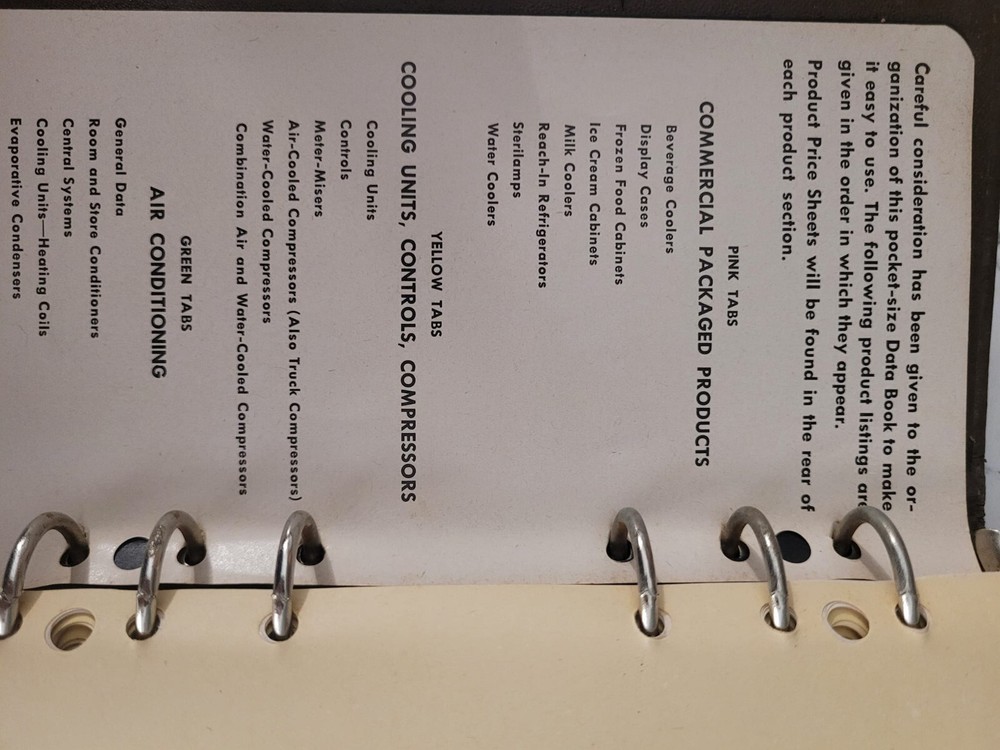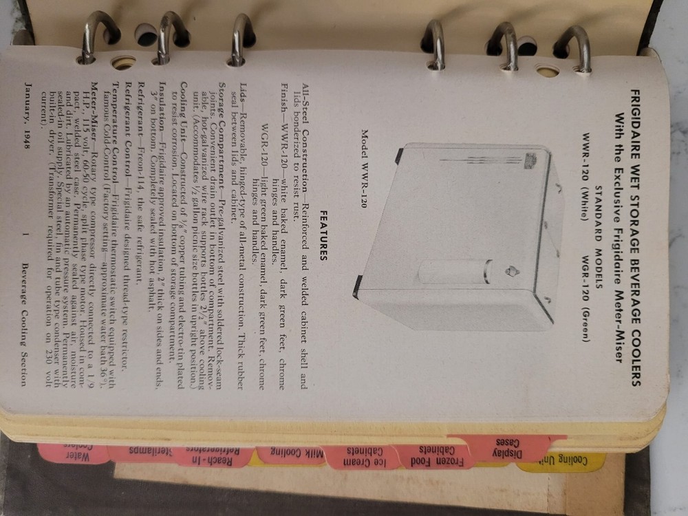 FRIGIDAIRE DATA BOOK w/ COMMERCIAL AND AIR CONDITIONING, 1948 General Motors Corporation. A smaller, six ring spiral book with leather covers, tabbed chapters with compressor ratings, specifications, etc. For being over 70 years old, it's still in great shape.