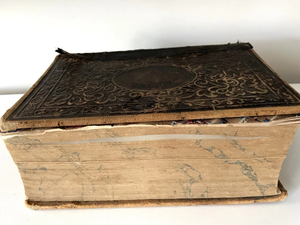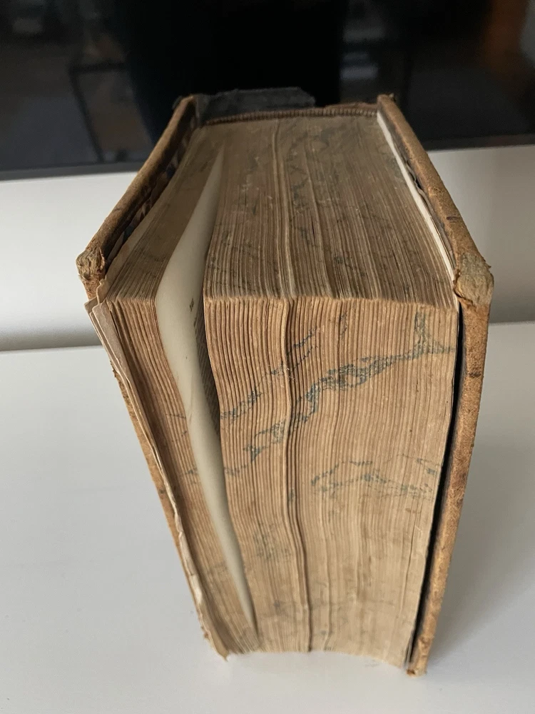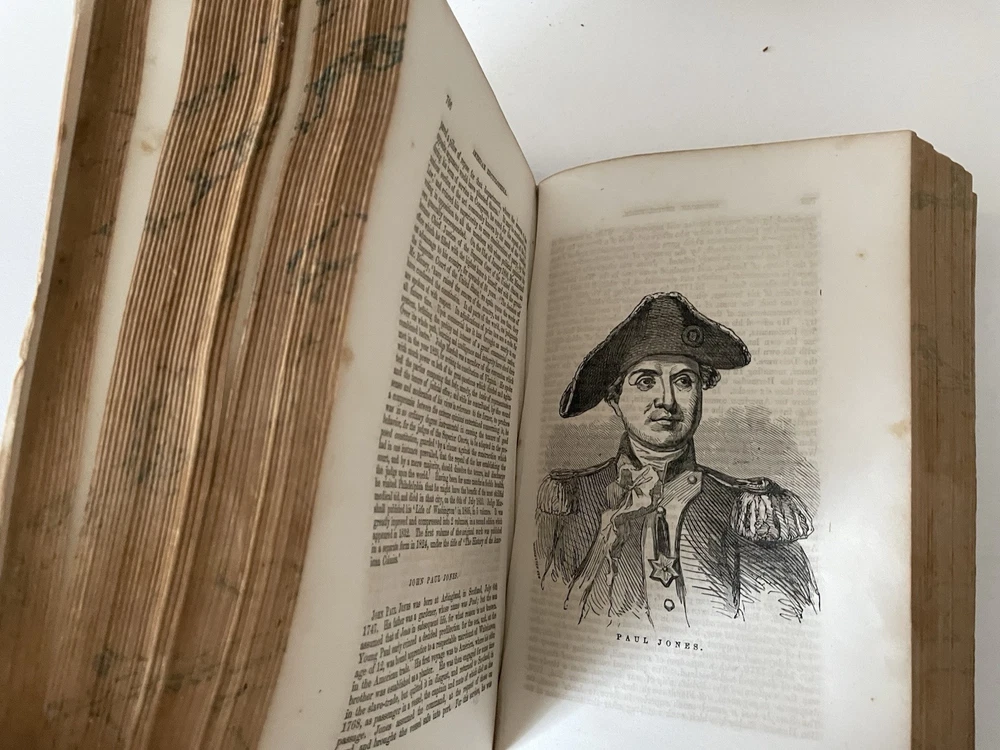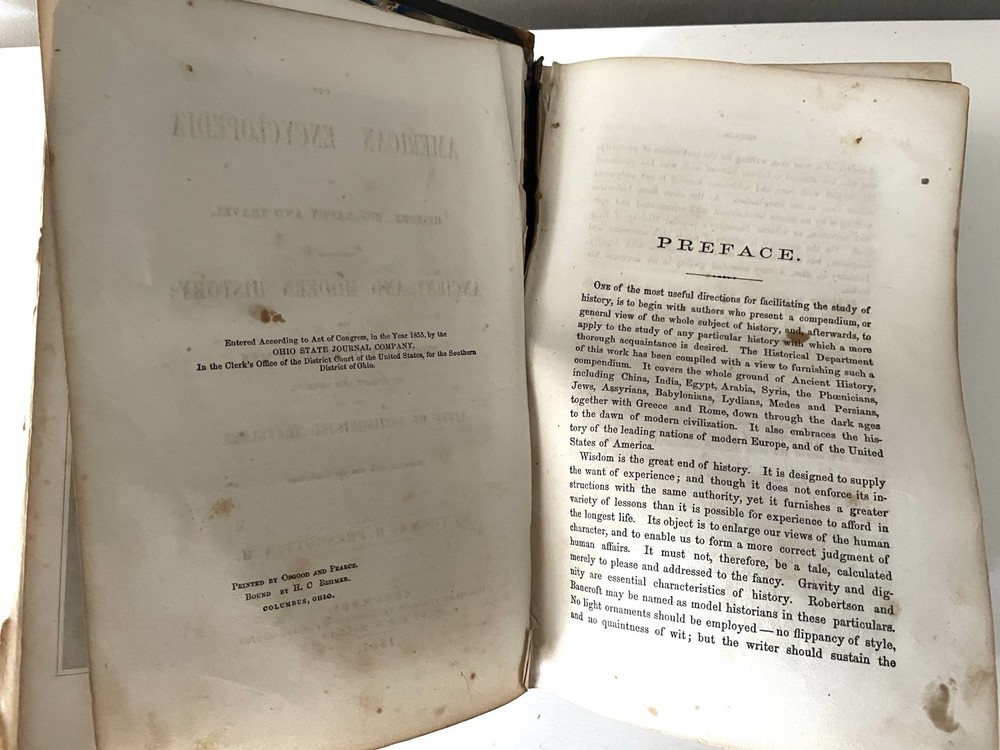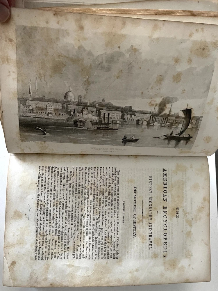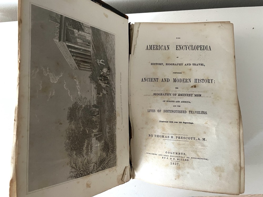 What an unusual large volume of American Encyclopedia up for auction. This is a very rare item. There are over a thousand pages of fascinating information and many illustrations. It is a treasure trove of information. There are some conditions to this volume. However , pages are all clean save some age appropriate foxing , and the spine has been lined with a piece of leather. This is a nice project for someone willing to restore this rare gem.