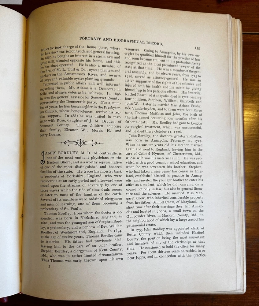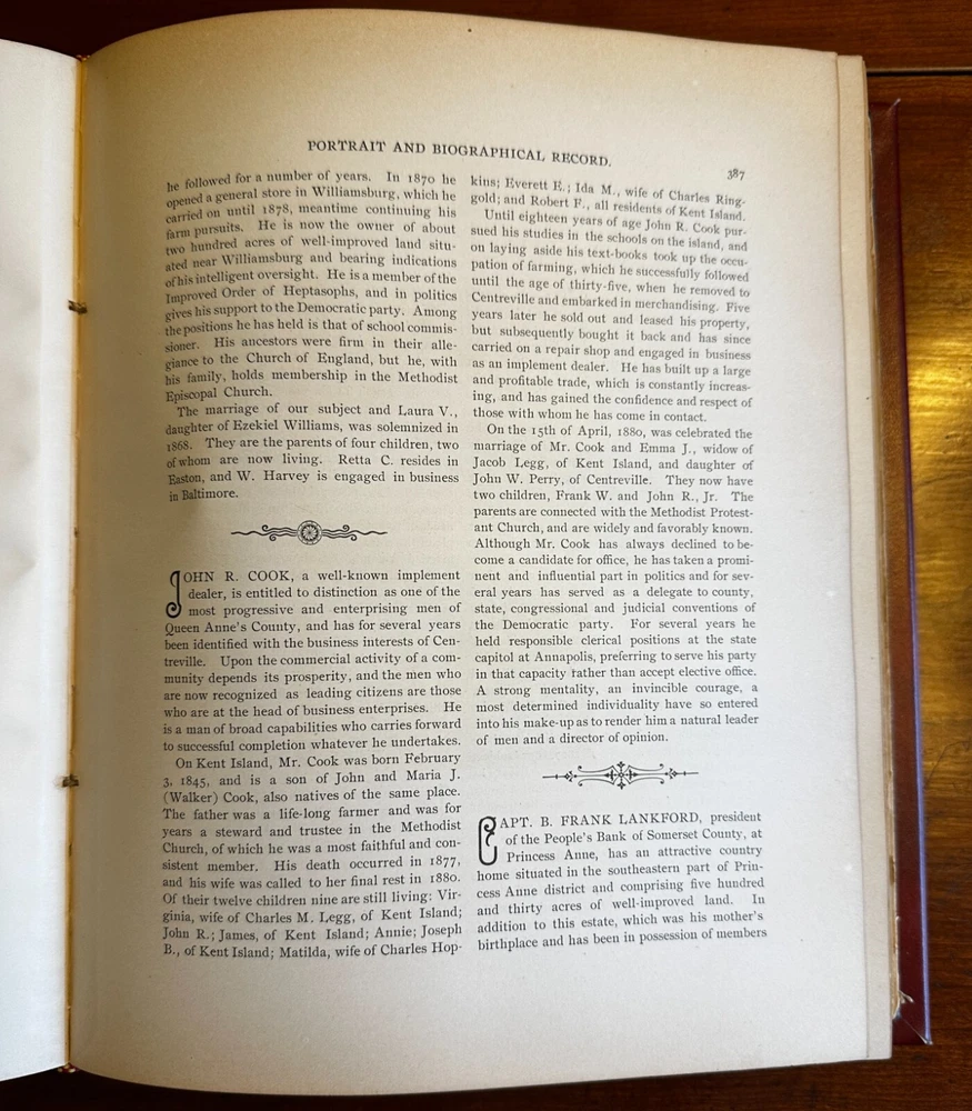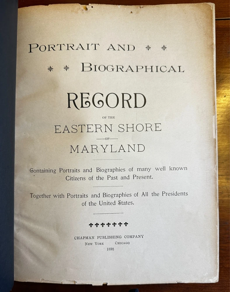 A scarce 19th-century Eastern Shore of Maryland history. This history is divided into two parts, the first being biographical sketches of all of the U.S. Presidents up through William McKinley. Each detailed sketch features a black and white illustrated plate of the President. The second portion of the book, comprising most of its 927 pages, features sketches and portraits of contemporary notable figures from Maryland's Eastern Shore, such as Civil War Governor Thomas Hicks, Confederate Army officer and Oswald Tilghman, among many others. Not all of the Eastern Shore bios have attached portraits. Scarce to begin with, this book, when found, is usually beaten to smithereens. This one is in choice condition having been professionally reworked and rebound in rich red leather by Wert Bookbinding of Grantville PA. First pages and last pages are slightly damaged on the edges but o verall an excellent copy of a scarce and desirable title.
