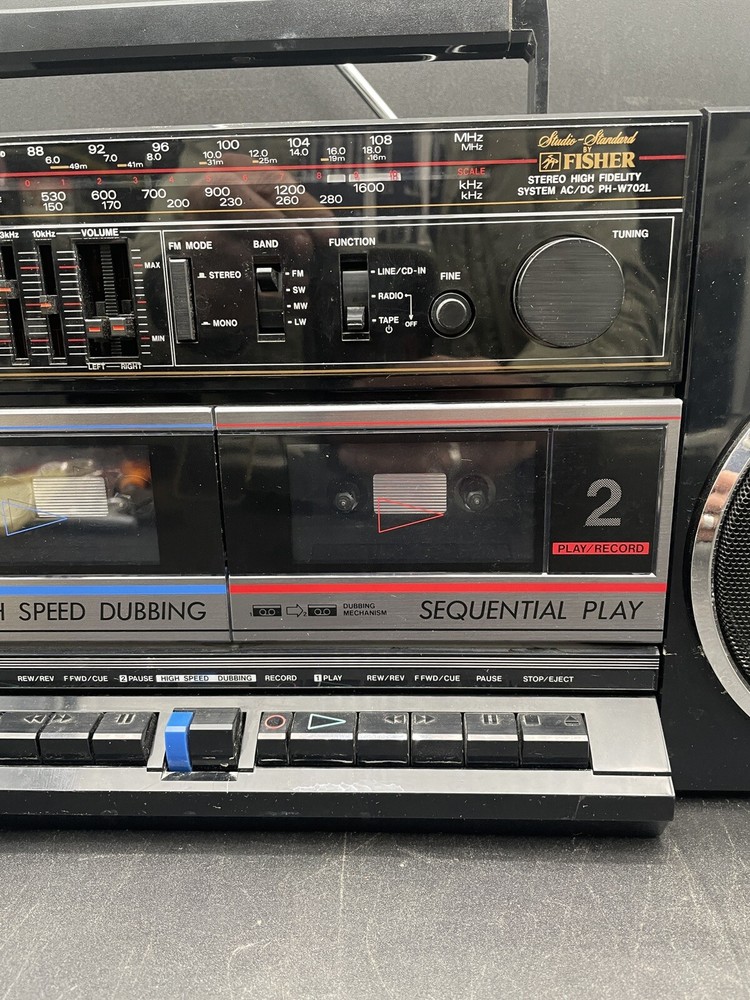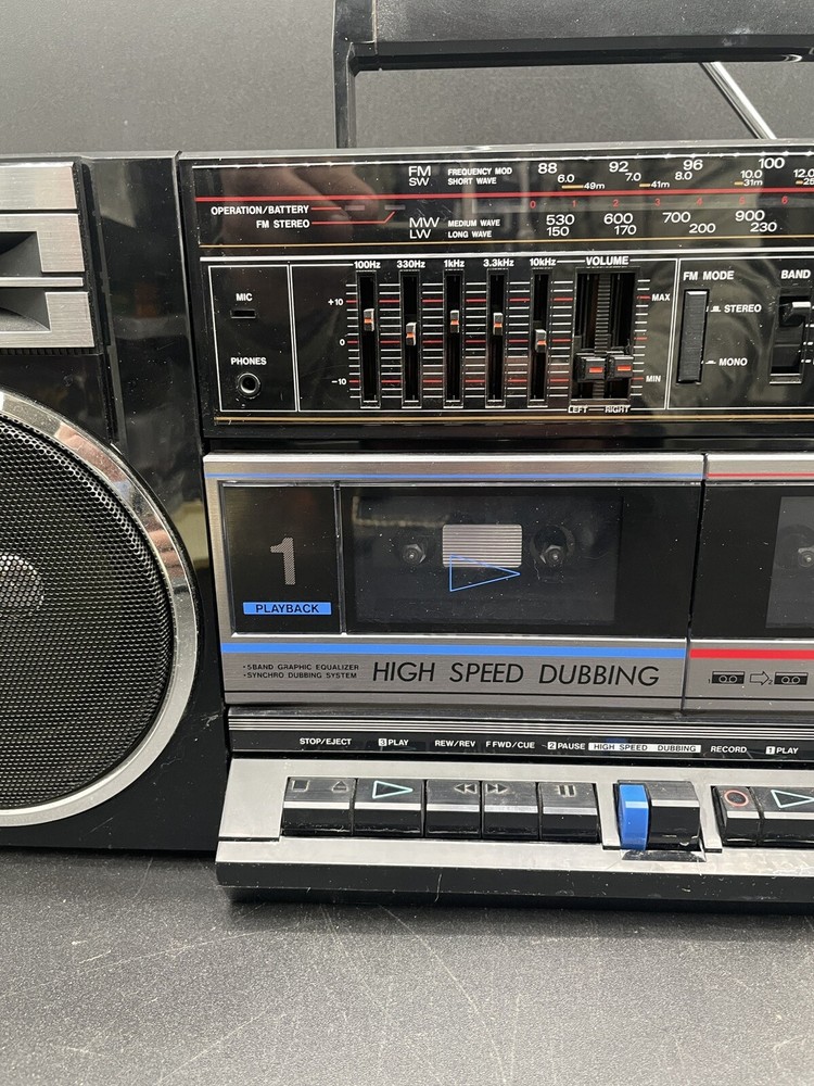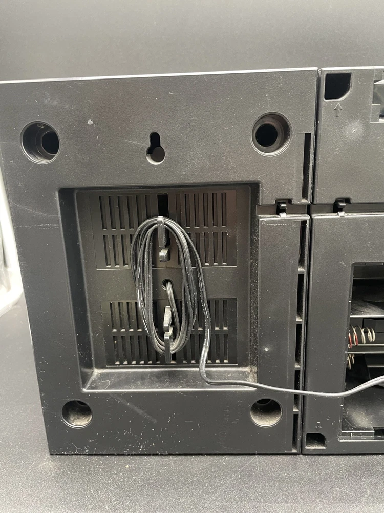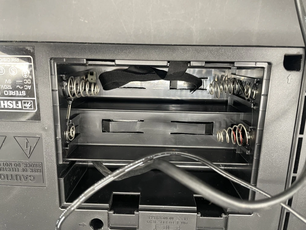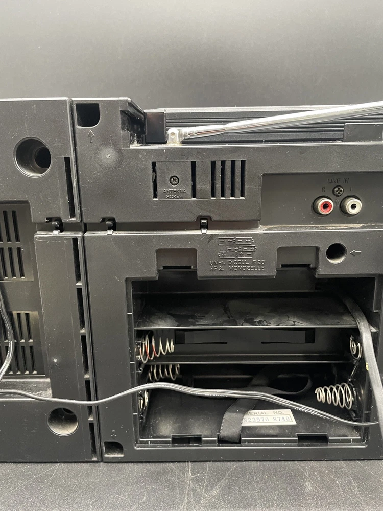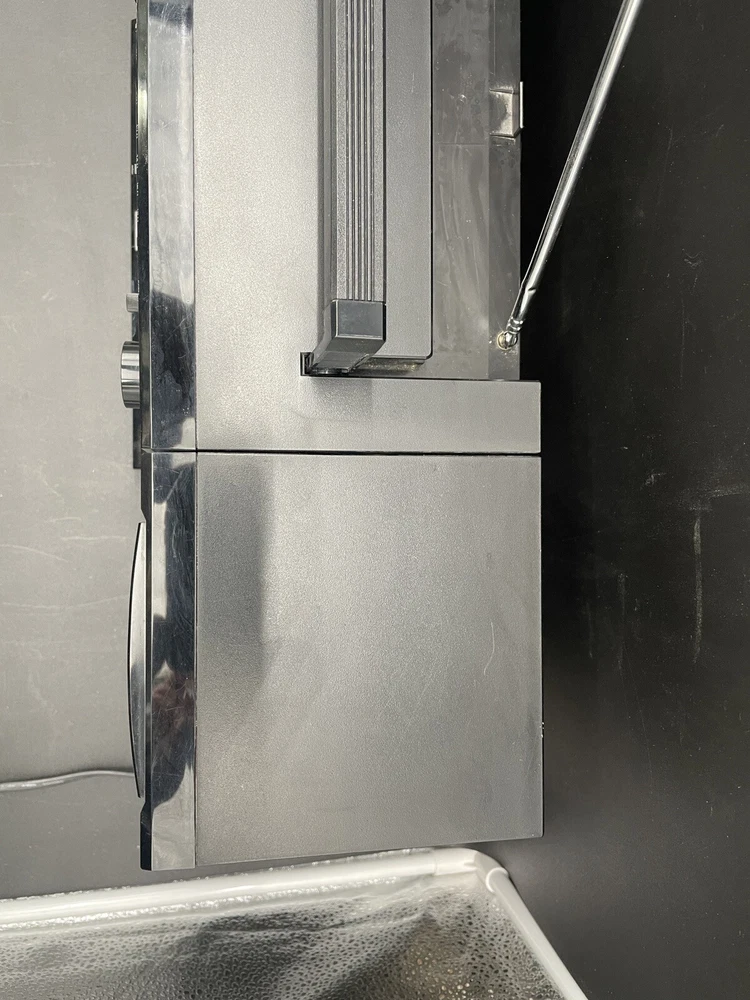 Radio works as it should but tape drives do not spin. I would guess that the drive belts need to be replaced but am not technically adept enough to try. Sound is good on FM radio. Speakers don’t crackle, all slides and switches run smoothly. No crackles on volume slides. Antenna has a kink at the base that keeps it from sliding all the way in. Battery compartment clean clean. Type C plug with adapter. Please see photos for details.