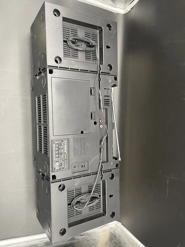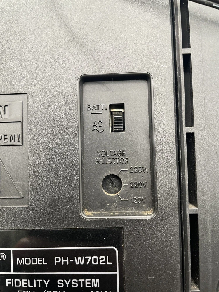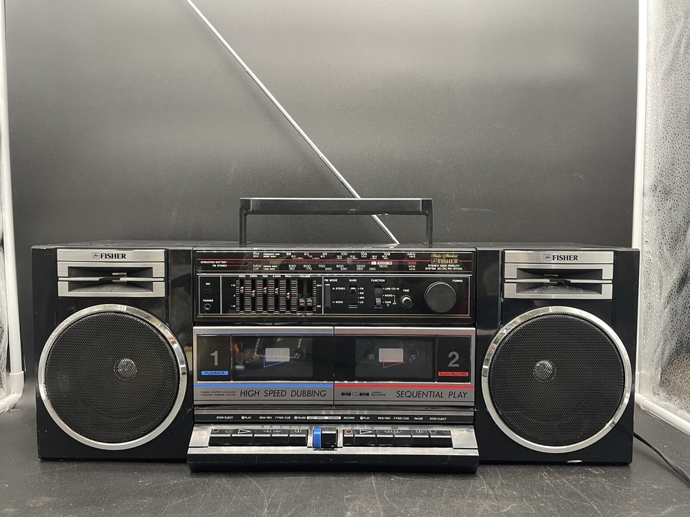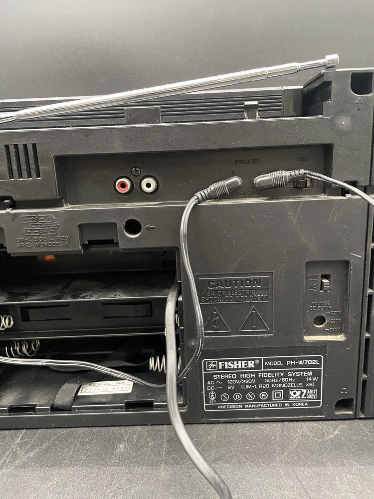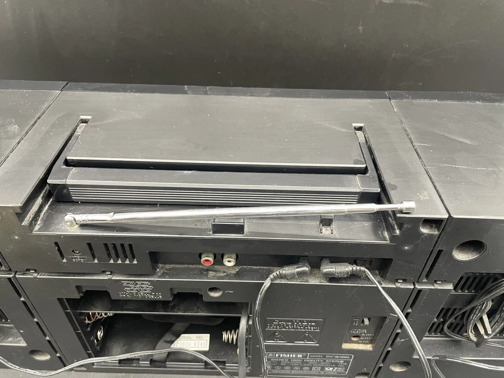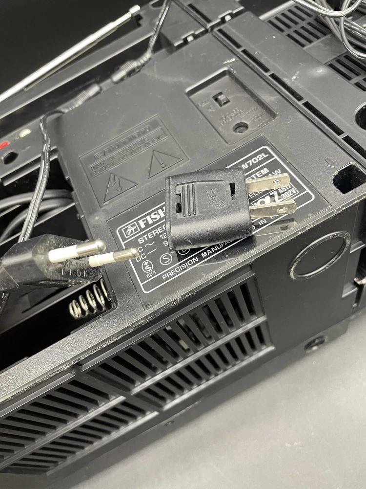 Radio works as it should but tape drives do not spin. I would guess that the drive belts need to be replaced but am not technically adept enough to try. Sound is good on FM radio. Speakers don’t crackle, all slides and switches run smoothly. No crackles on volume slides. Antenna has a kink at the base that keeps it from sliding all the way in. Battery compartment clean clean. Type C plug with adapter. Please see photos for details.