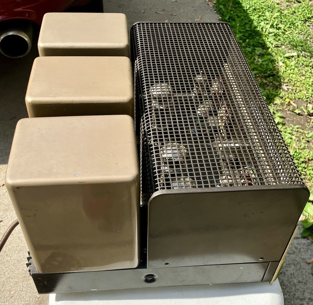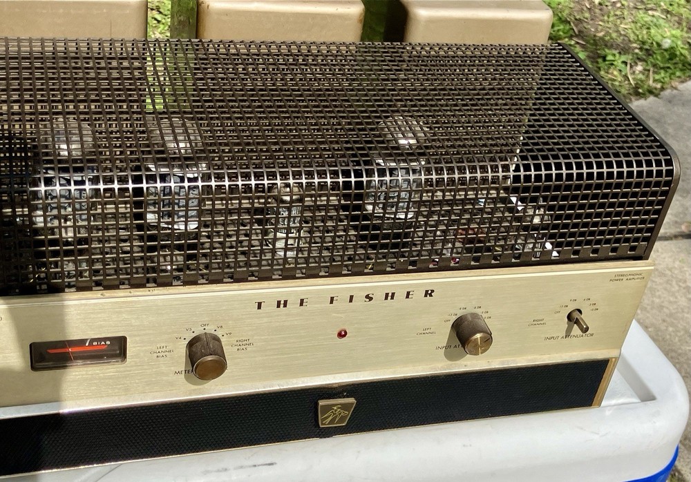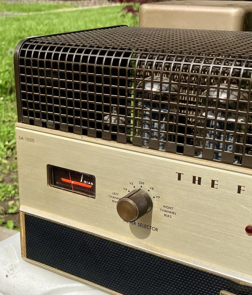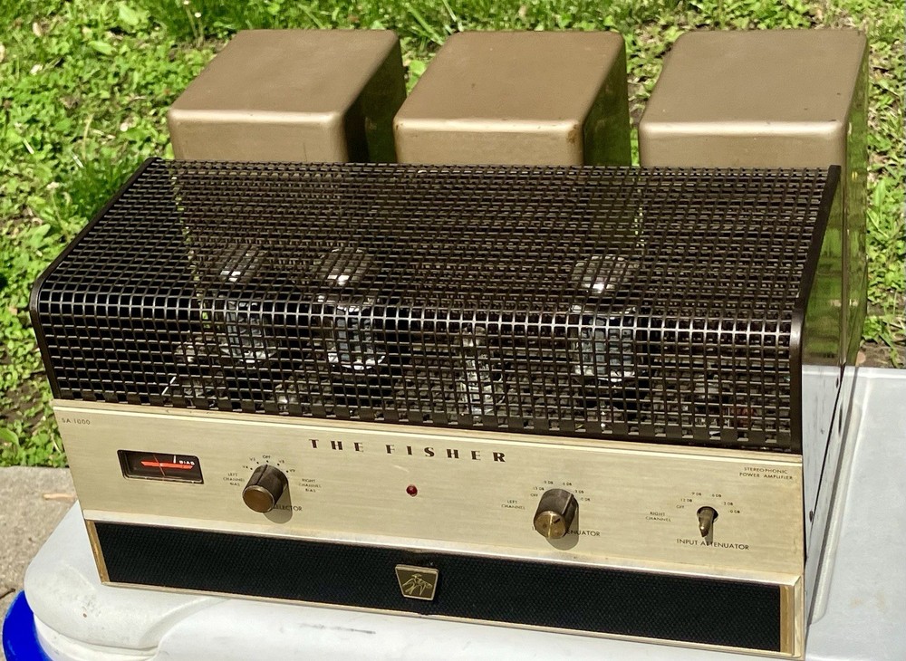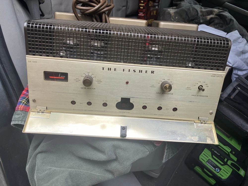 Rare Huge Vintage Fisher Model SA-1000 Stereo Tube Power Amplifier with Cage. It has been sitting unused for many years I am not a tech and have not tried to turn it on or replace the missing tube. Given its age it would advisable to have your tech go through it prior use. As such I am selling it AS-IS/For Parts or Repair. Comes as pictured. I did locate another Fisher knob for it - it is shown in a few of the pics. Still looking for a few brass knob caps. Due to its size, weight and fragile nature I would prefer local pickup in Jerseyville Illinois, Central or Southern Illinois or the metro St. Louis area. I will put a “placeholder” in for shipping. I cannot pack it myself but would be happy to drop off at the packer/shipper of your choice. If shipped I will not be held responsible for any damage or lost package while in transit - that will be between you and your packer/shipper. If you need more pice please LMK and I will provide them.
