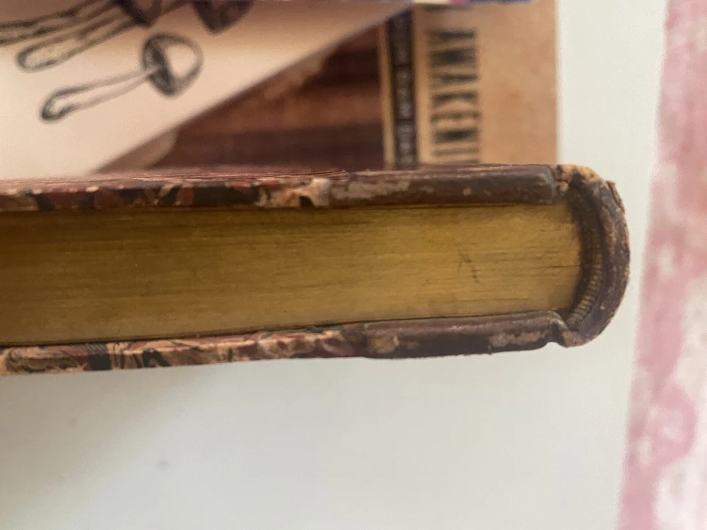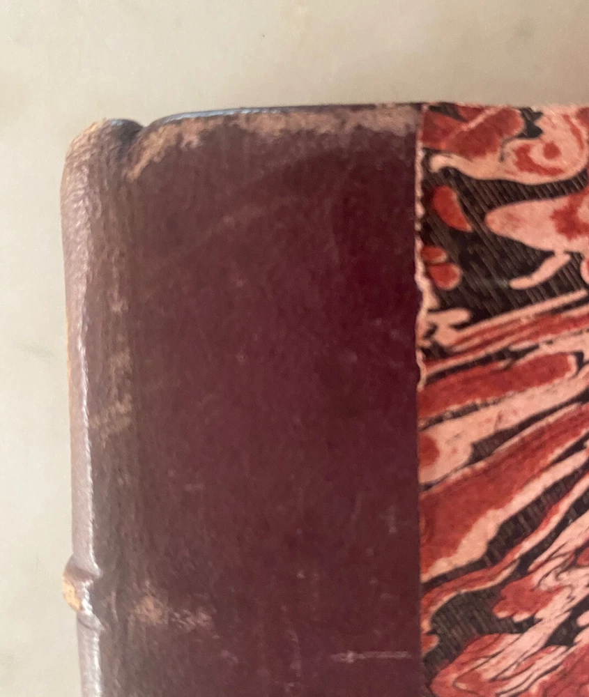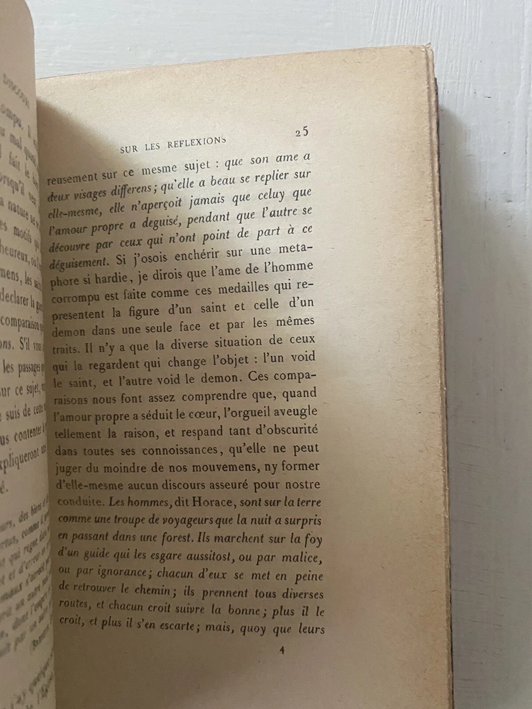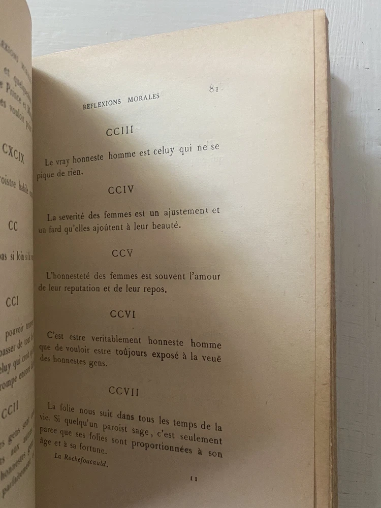 Les Maximes de la Rochefoucauld suivies des Réflexions Diverses by J. F. Thenard. This rare book is in great shape with spine intact, pages tight, & some signs of wear along the bottom and top covers near spine and edges of book. Gold leaf along top pages. Some usual discoloration on some pages. Please see photos and message with any questions or to see more pics.