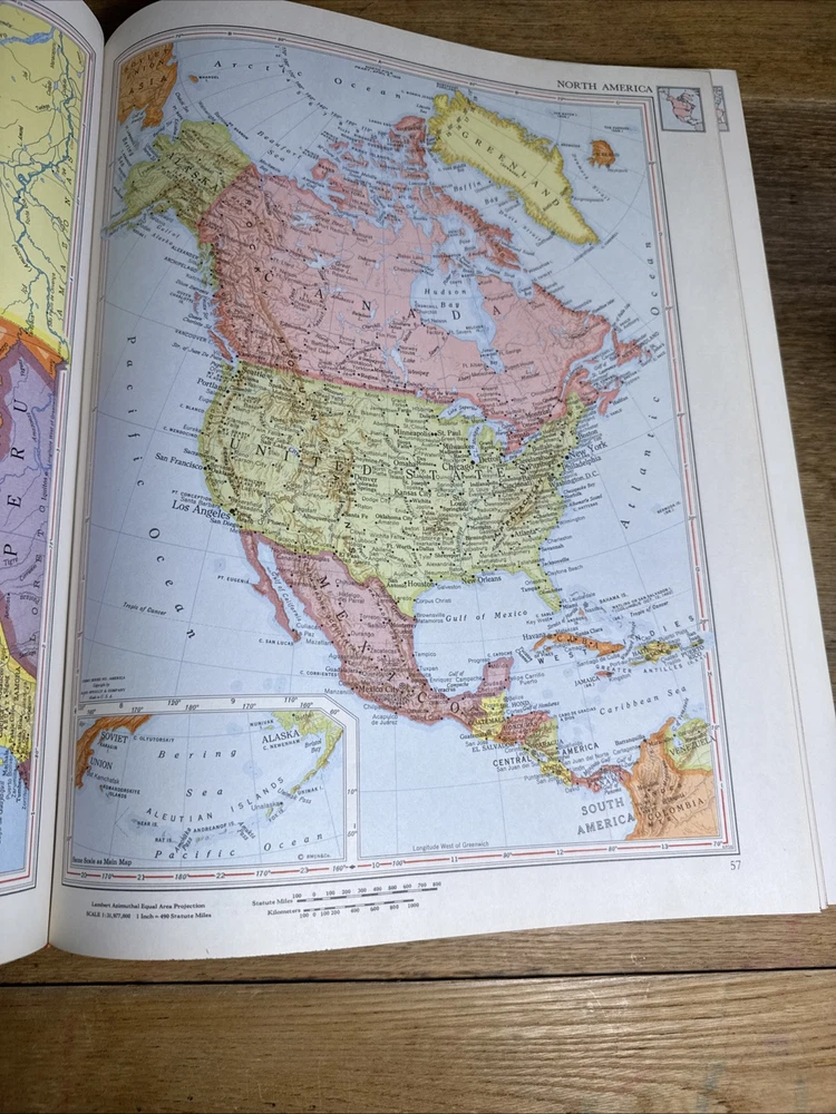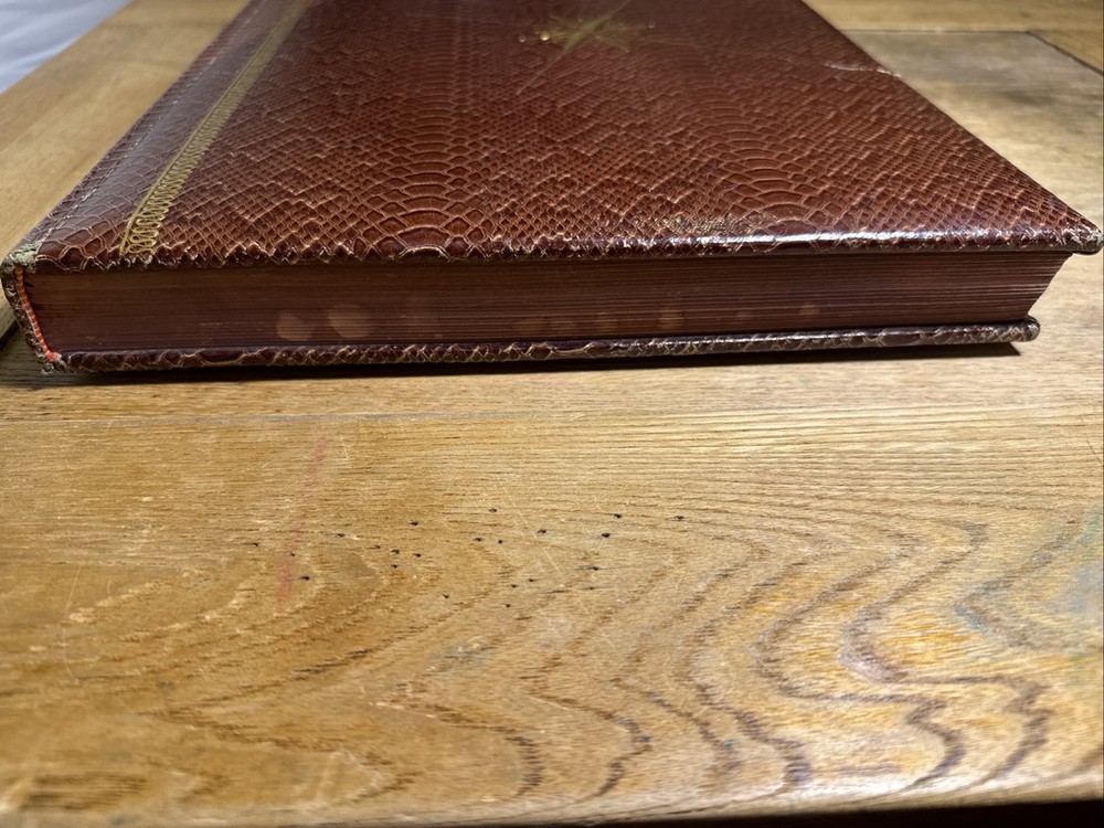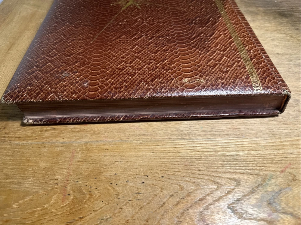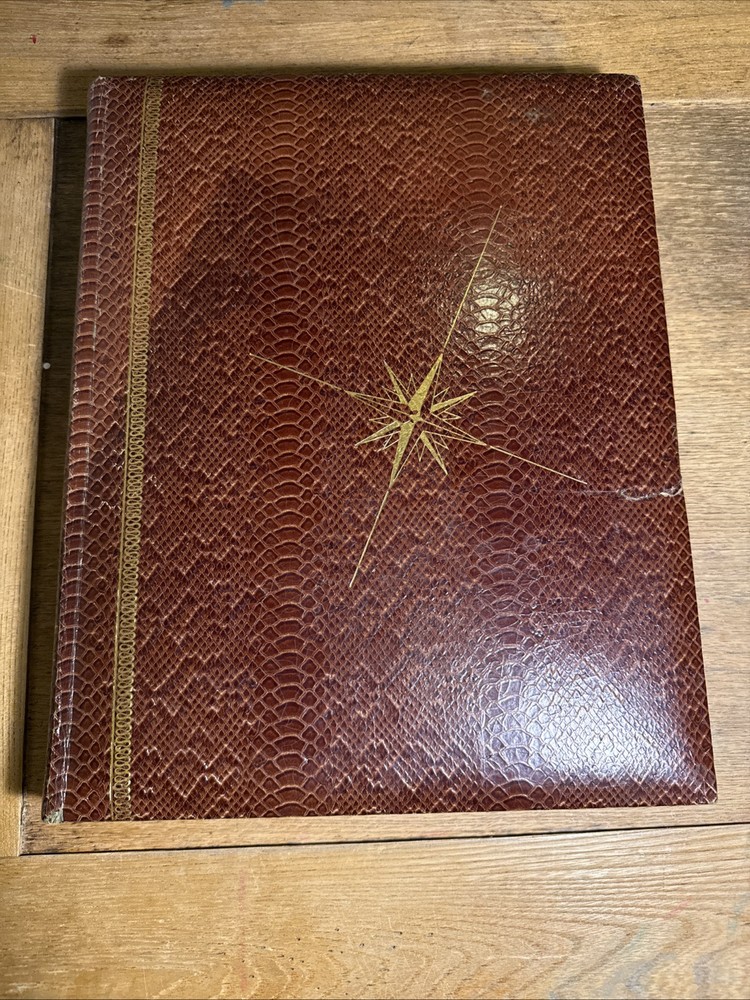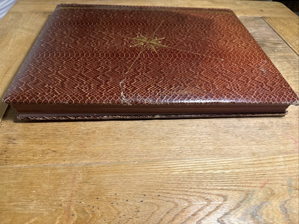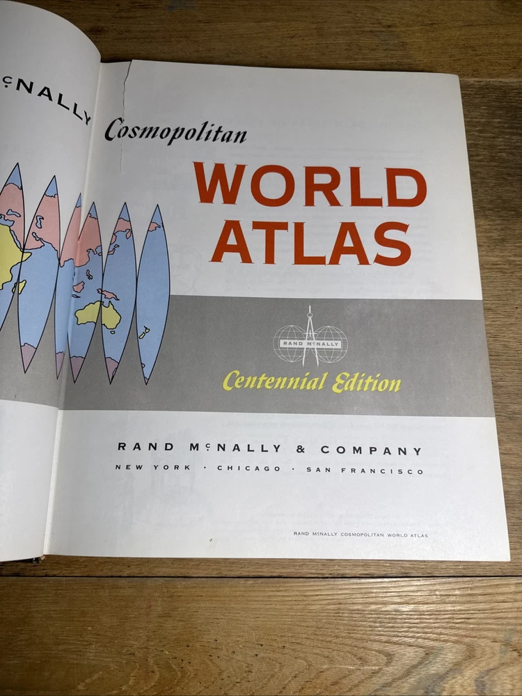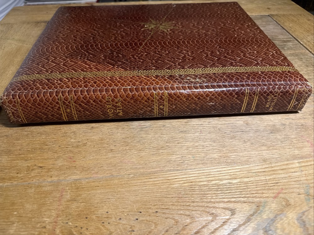 Rare Rand McNally Premier Centennial World Atlas SNAKESKIN Compass Cover 1955 14 3/8" x 11 1/2" This vintage 1955 Rand McNally World Atlas is not perfect, but it is amazing! From the snakeskin bound cover with the gold-stamped compass ... to the mid-century style illustrated end papers ... to the 120 pages of color maps plus 173 page index, this is a rare find. I do not know if the snakeskin is genuine, as this edition is extremely rare. Records of this edition are hard to find, but what little I did find out about it suggests that the snakeskin is the real deal. However, I am not an expert and cannot guarantee this. There are 120 pages of color maps of the United States and nations around the world. The maps are followed by 10 pages of reference charts, tables, and lists. Then follows a comprehensive 173 page index. CONDITION: 1.5" Crack in Snake skin on Front Cover far right, some rubbing to the cover on back side and some corner wear. Inside small tear on Centennial Edition Page only. All other Pages inside are in Great Condition with No Markings at all. This item will ship via USPS Media Mail unless you select another option. Keep in mind that Media Mail can take up to two weeks or sometimes longer. Will Ships Very Securely in Box.
