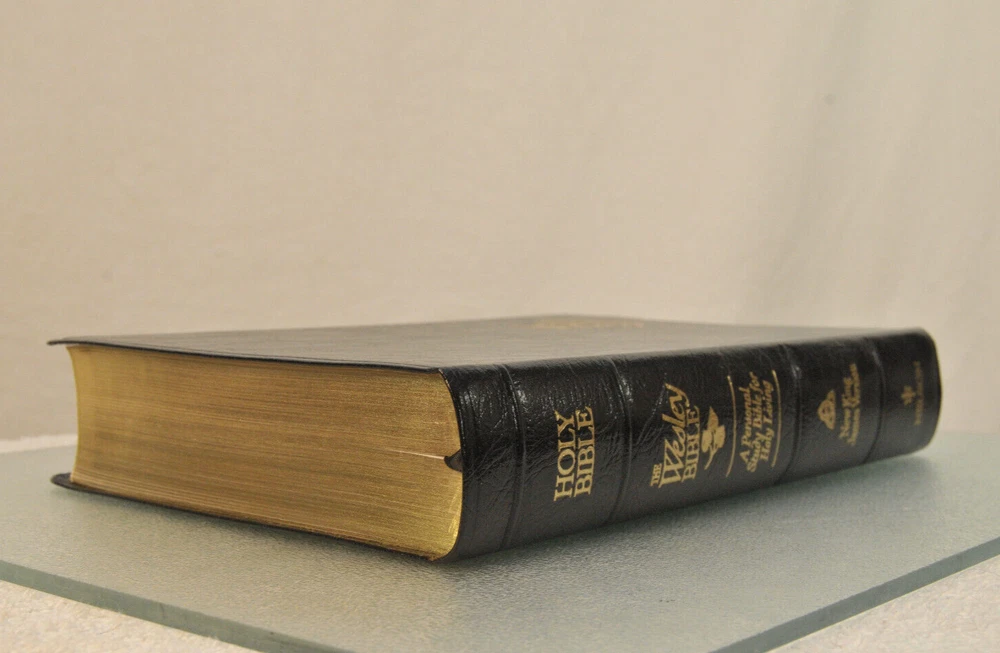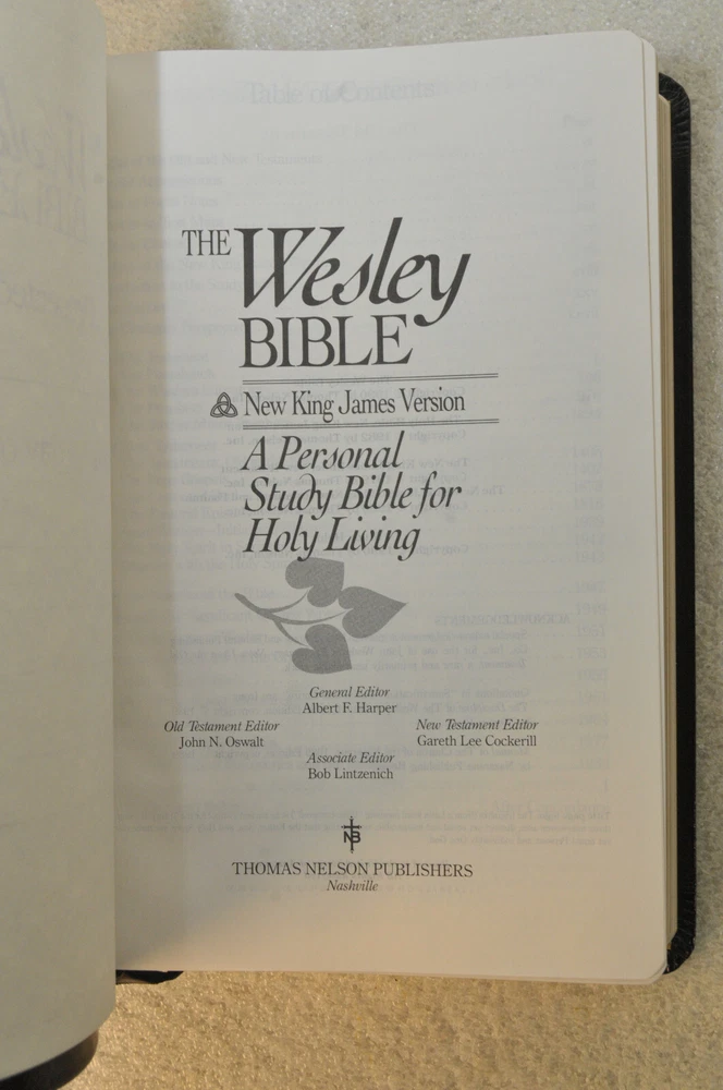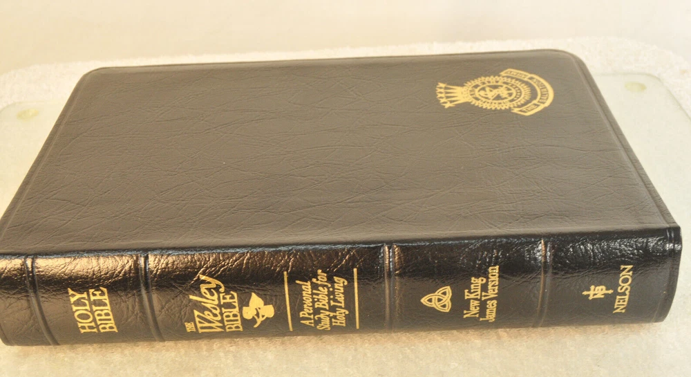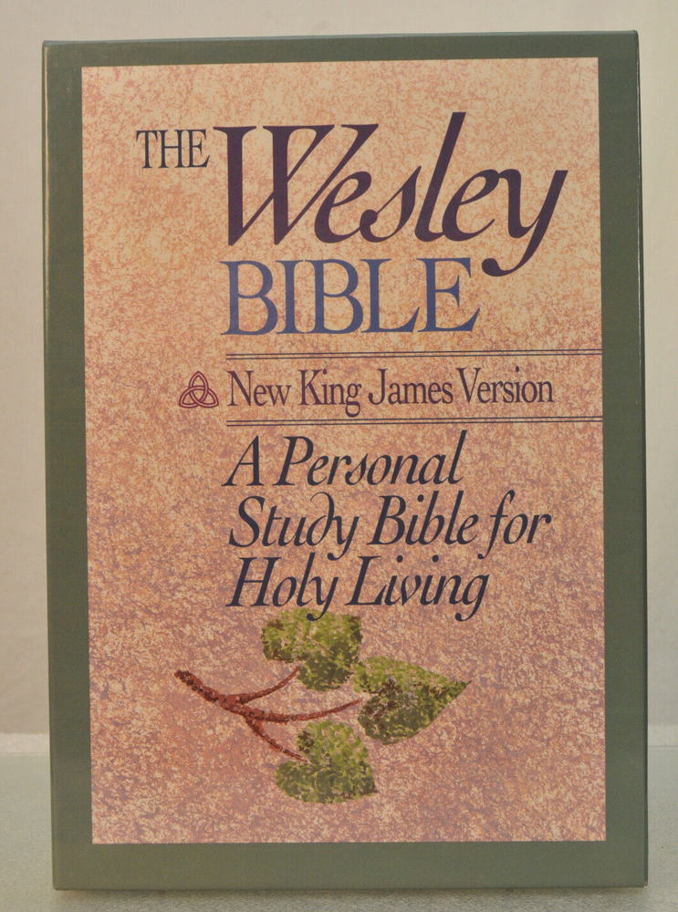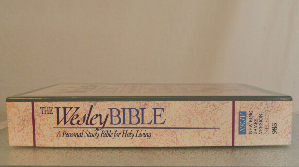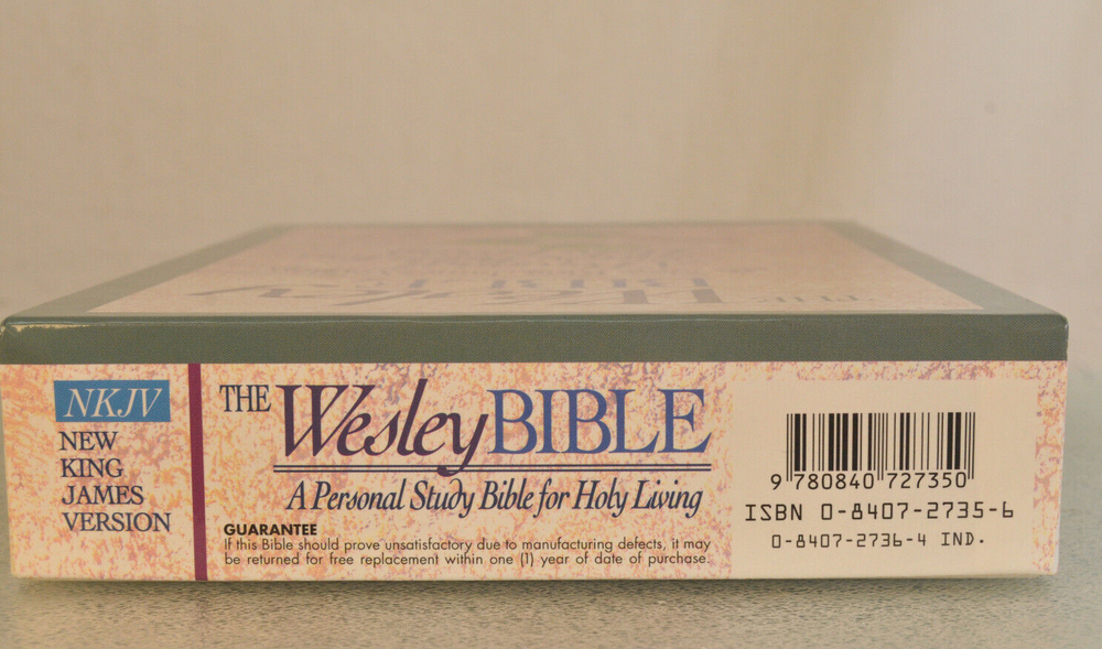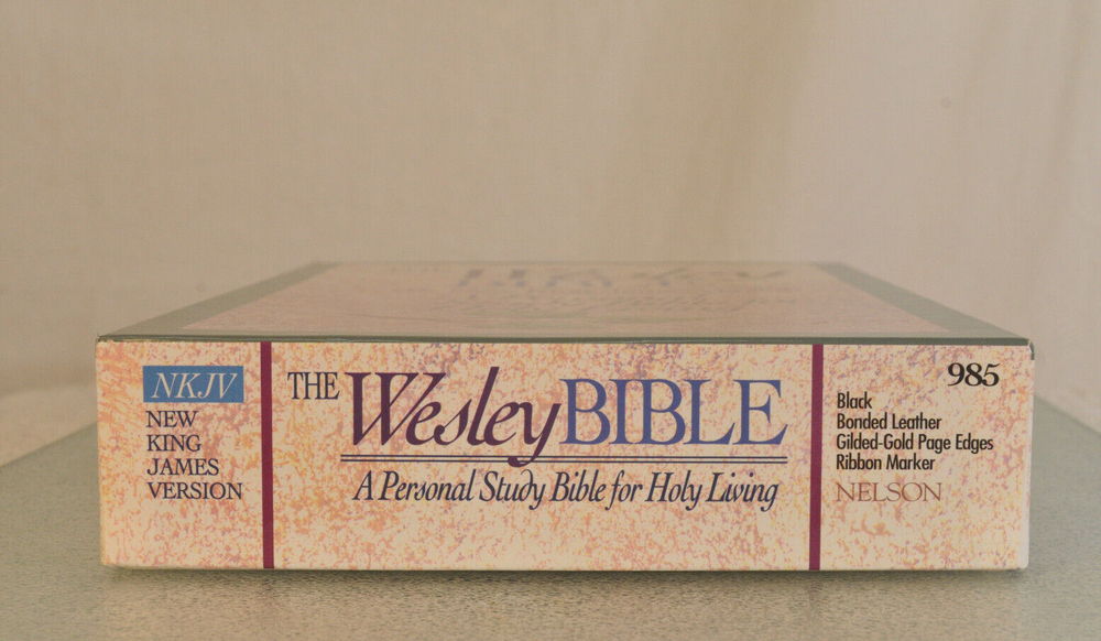 Rare Brand New In Box Unread and Unused: The Wesley Bible New King James Version A Personal Study Bible For Holy Living. This is a First Edition First Printing edition bound in Black Bonded Leather. The front cover is imprinted with the Salvation Army motto and logo. Published by Thomas Nelson Publishing model 985. It is a rare find this Wesley Bible First Edition New in Box 35 years after it's date of publish. This Bible is no longer being published. ISBN 9780840727356. Brand New In Box condition. Imprinted in gold with Salvation Army logo and motto on front cover. Free of any hand written notes or marks inside this Bible. No dog-eared pages. Minimal shelf wear for the box as it was stored during its 35 year wait to be used. Please see all photos for details and condition.