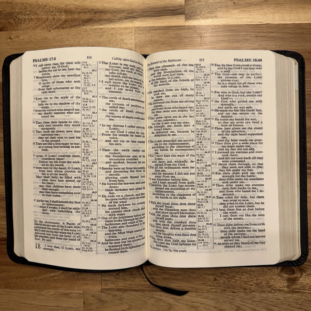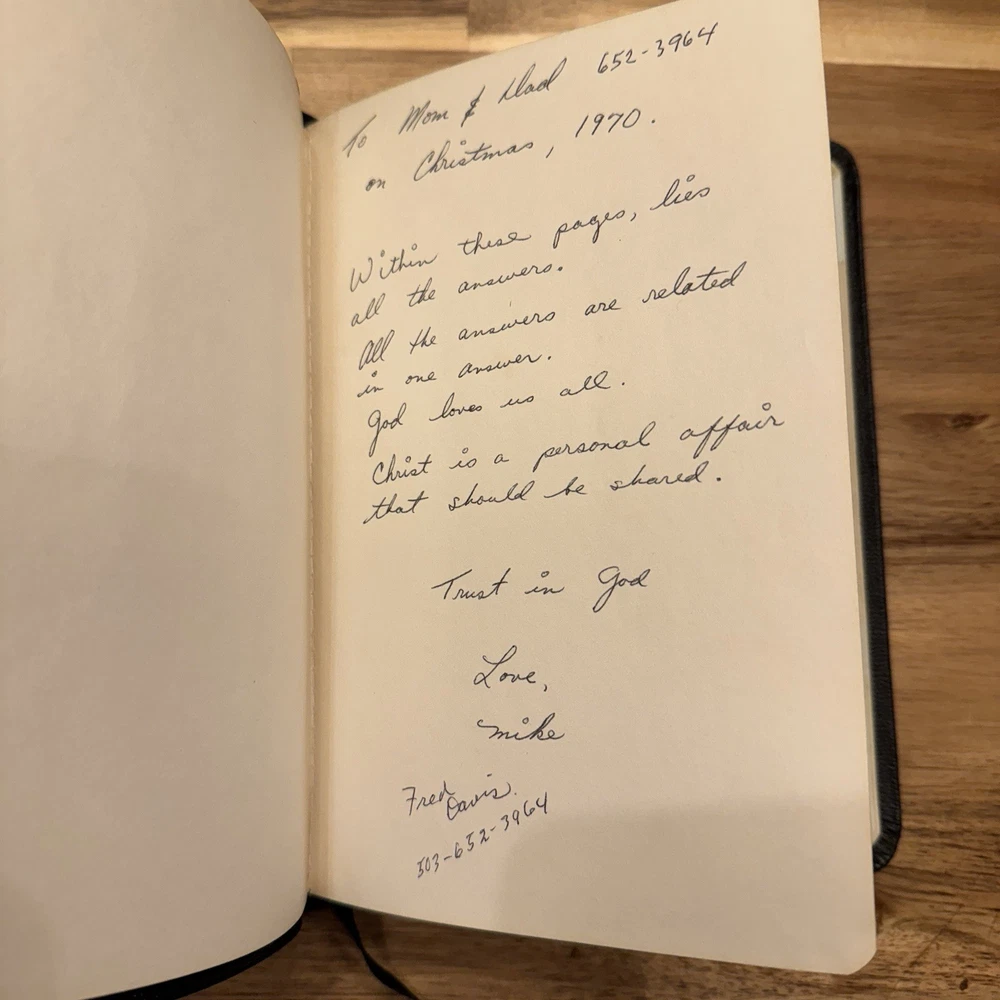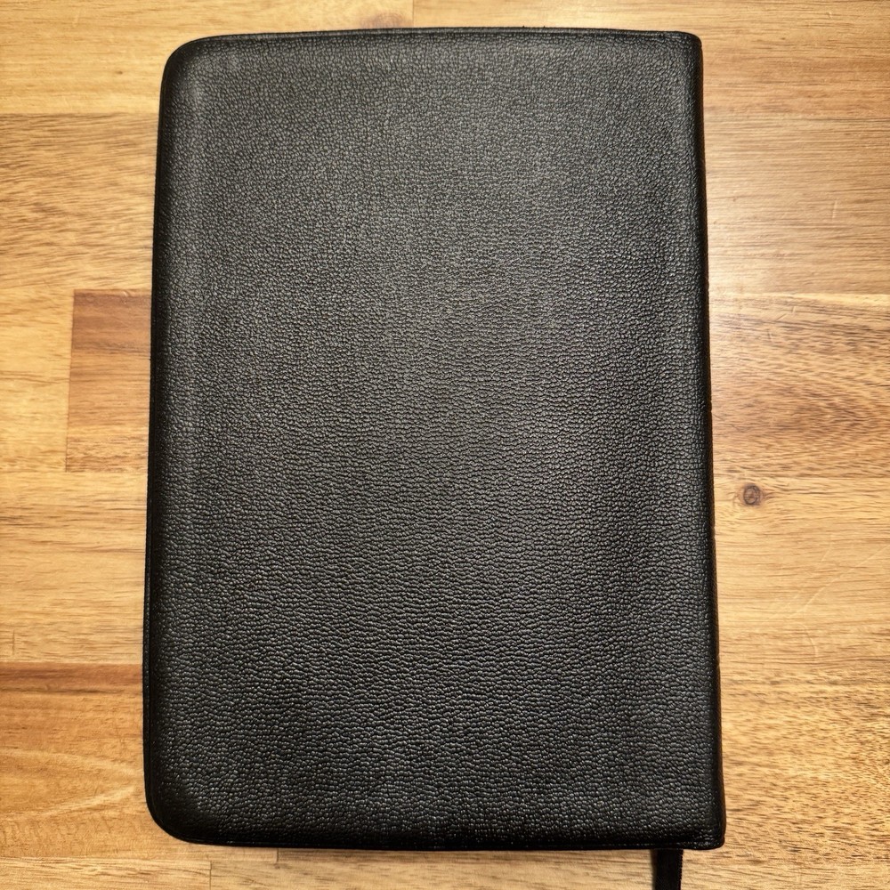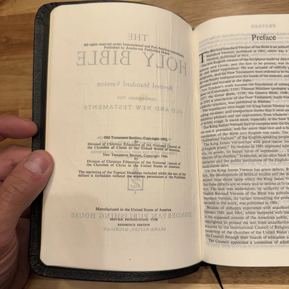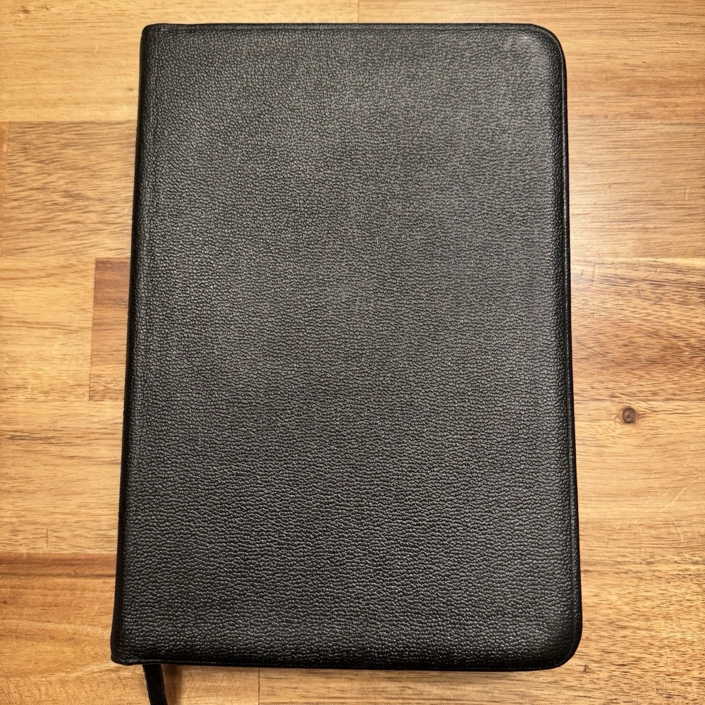 Beautiful, black leather RSV Bible in excellent condition. The vintage leather is soft. No marking in the book, just a note on the endpaper. Vintage 1952 edition. Includes concordance, color maps, and the Brevier pronouncing type.