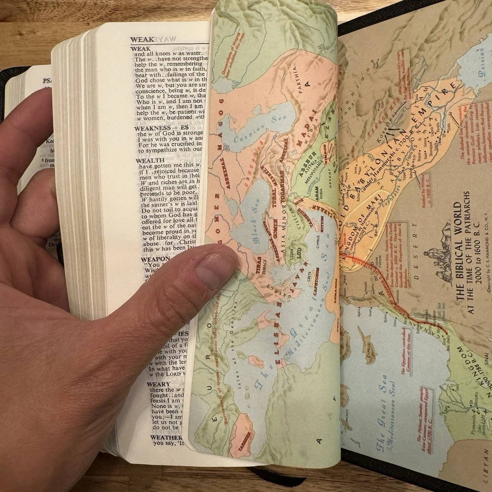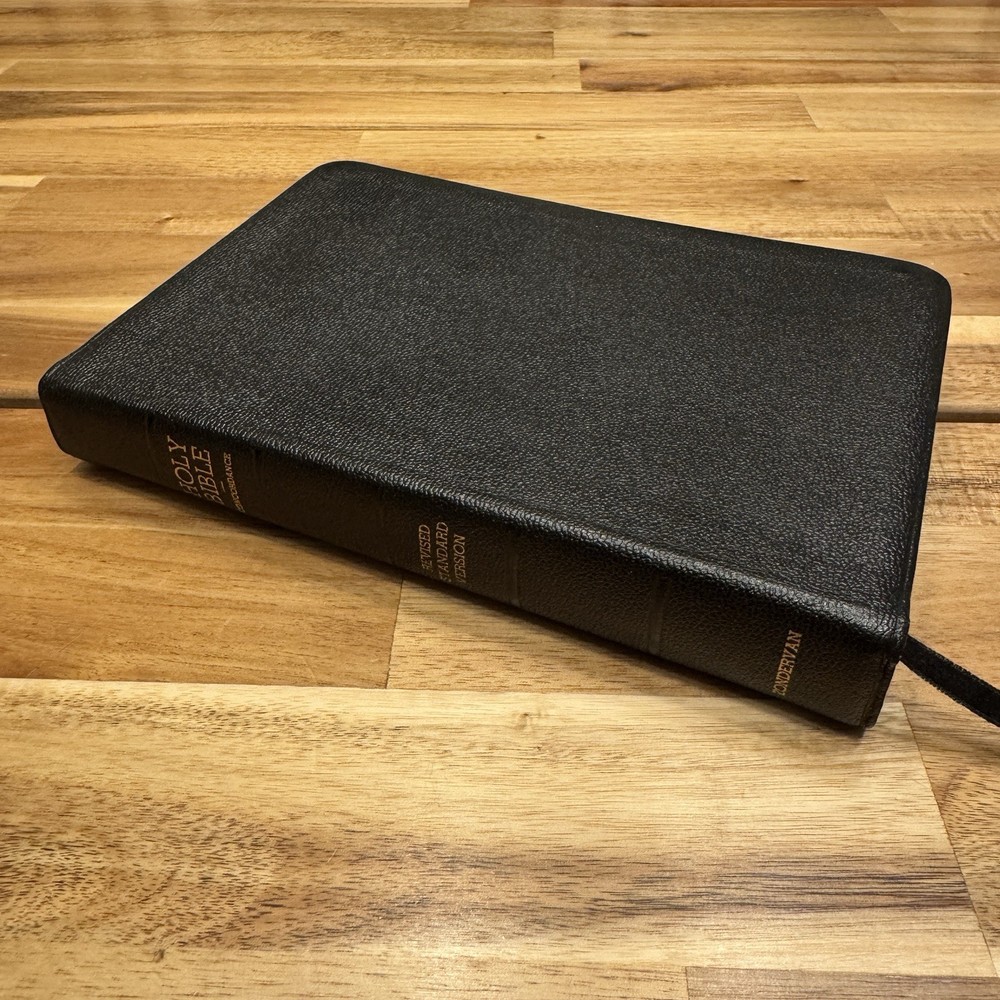 Beautiful, black leather RSV Bible in excellent condition. The vintage leather is soft. No marking in the book, just a note on the endpaper. Vintage 1952 edition. Includes concordance, color maps, and...