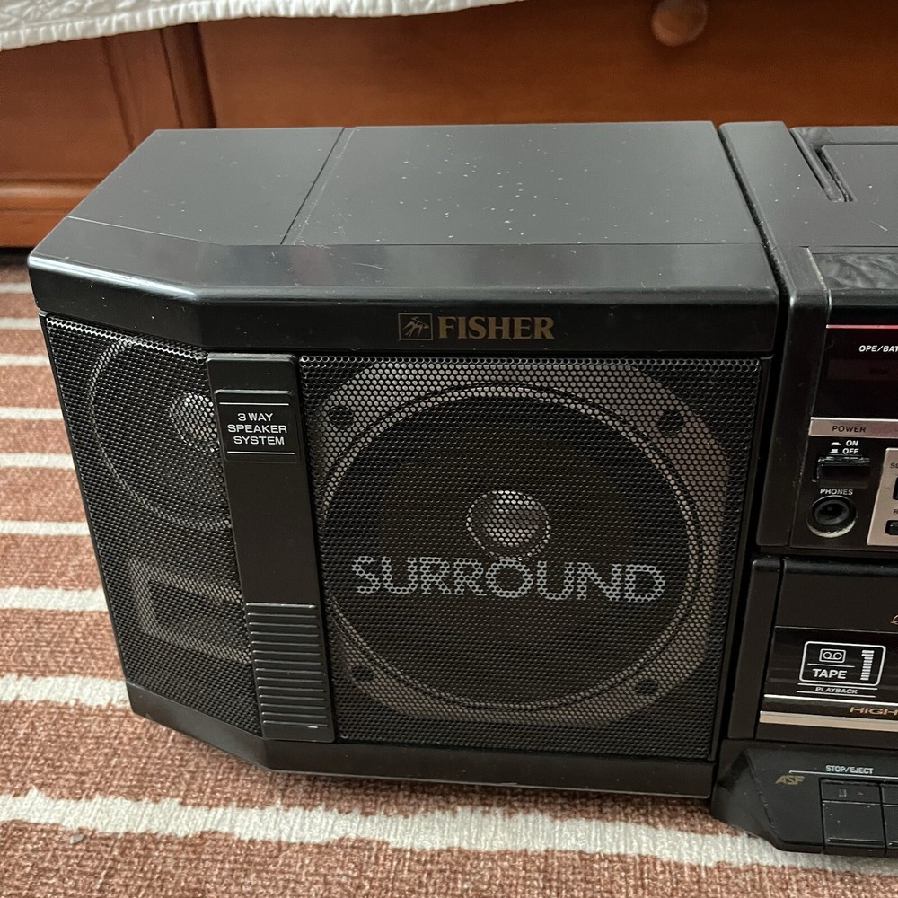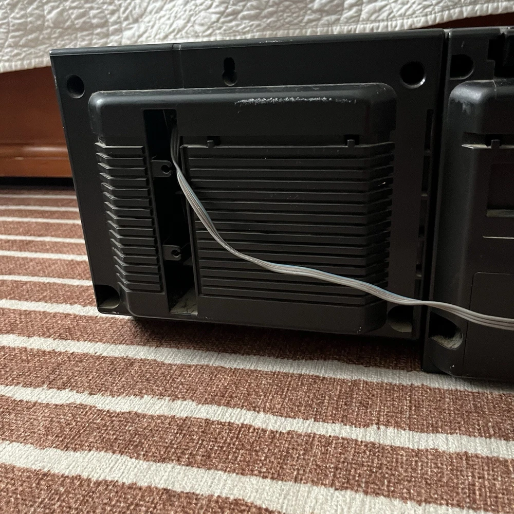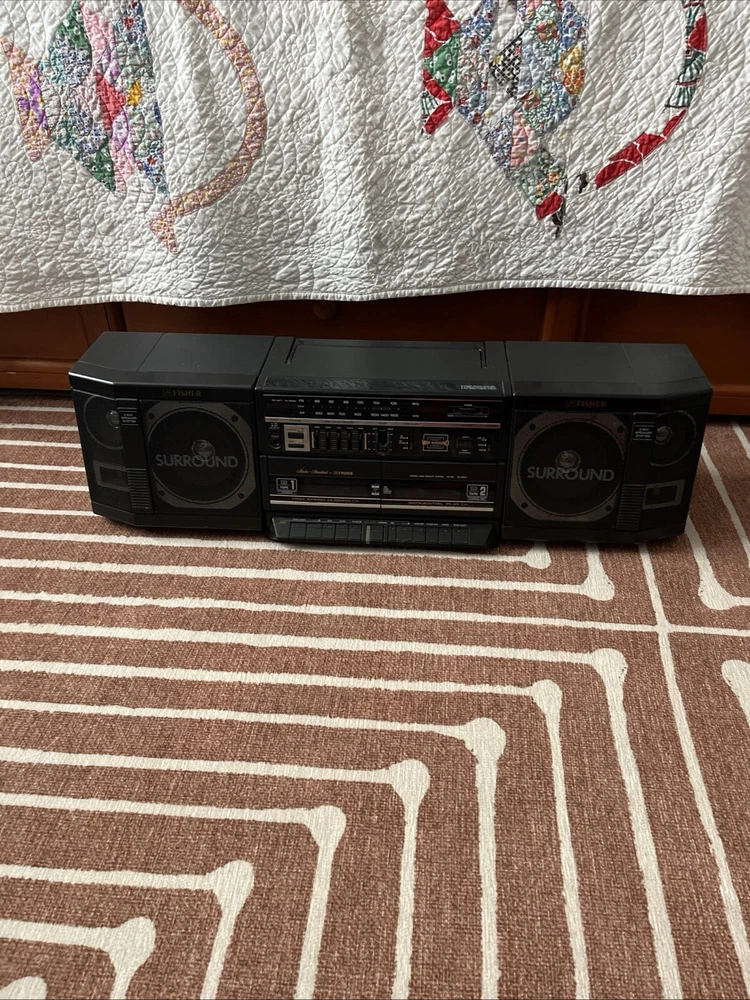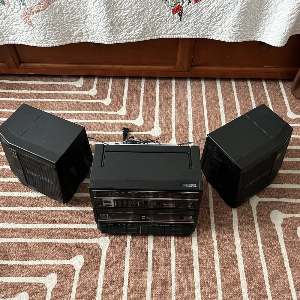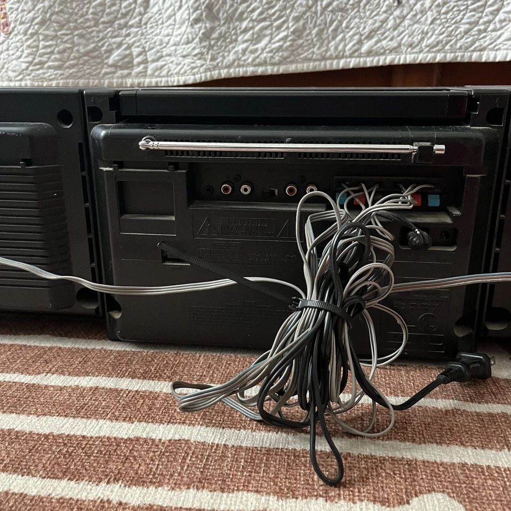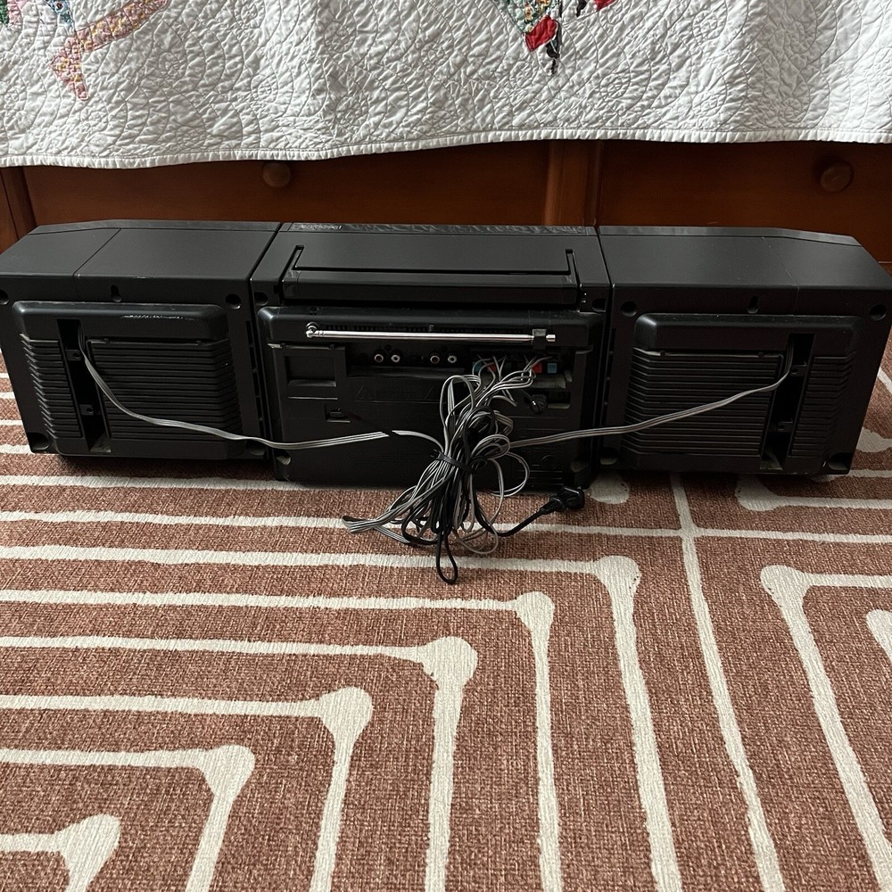 Old school boombox. Speakers can easily detach for ‘surround sound’. Double cassette player and dubbing technology. Working condition