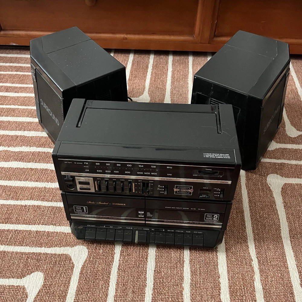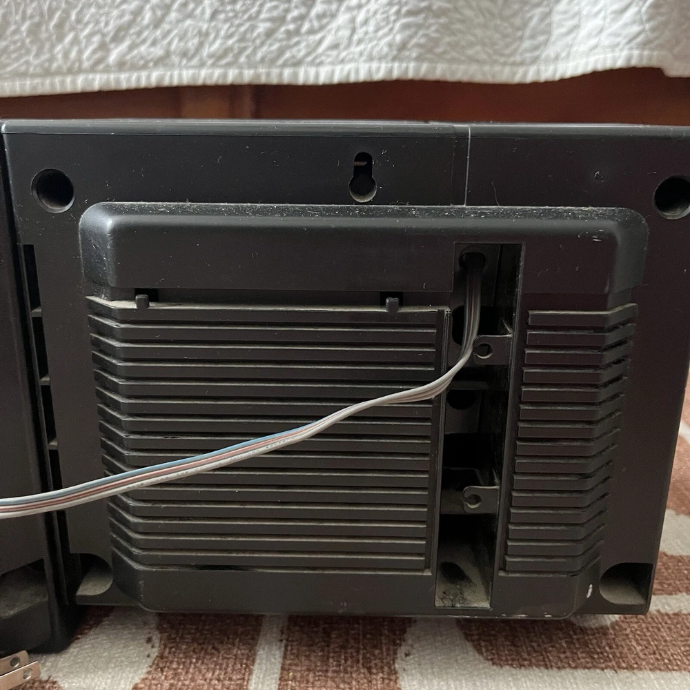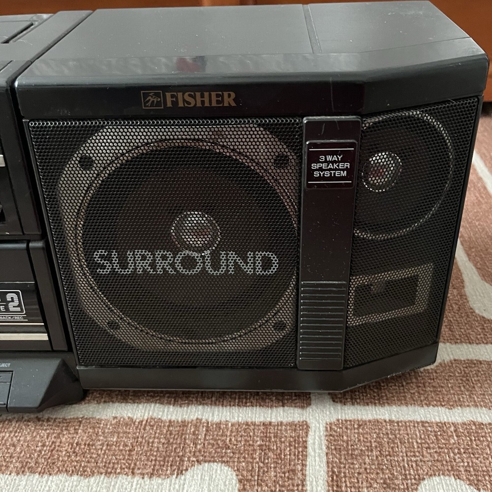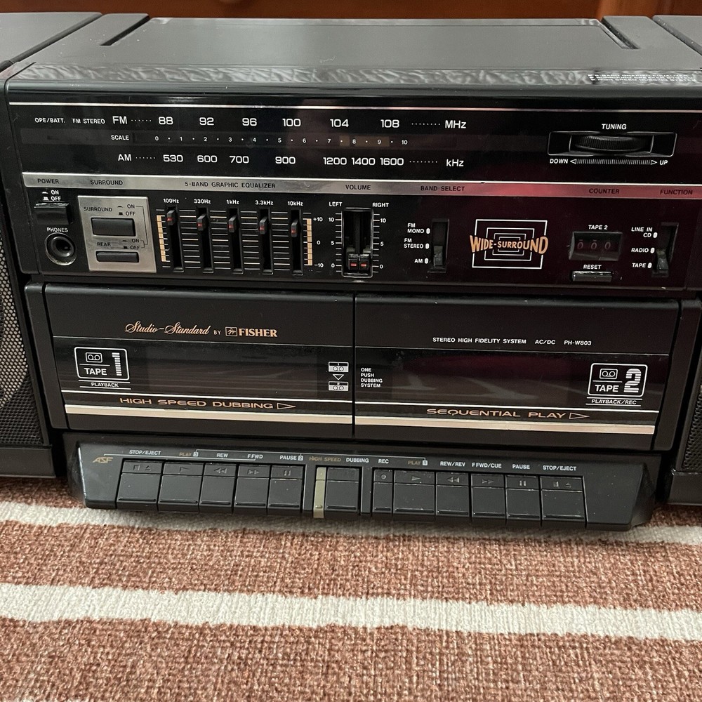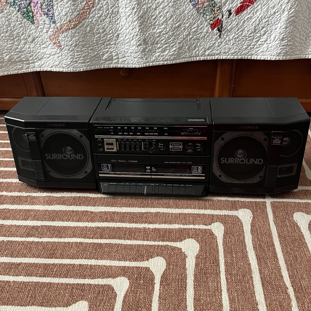Old school boombox. Speakers can easily detach for ‘surround sound’. Double cassette player and dubbing technology. Working condition