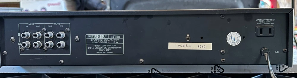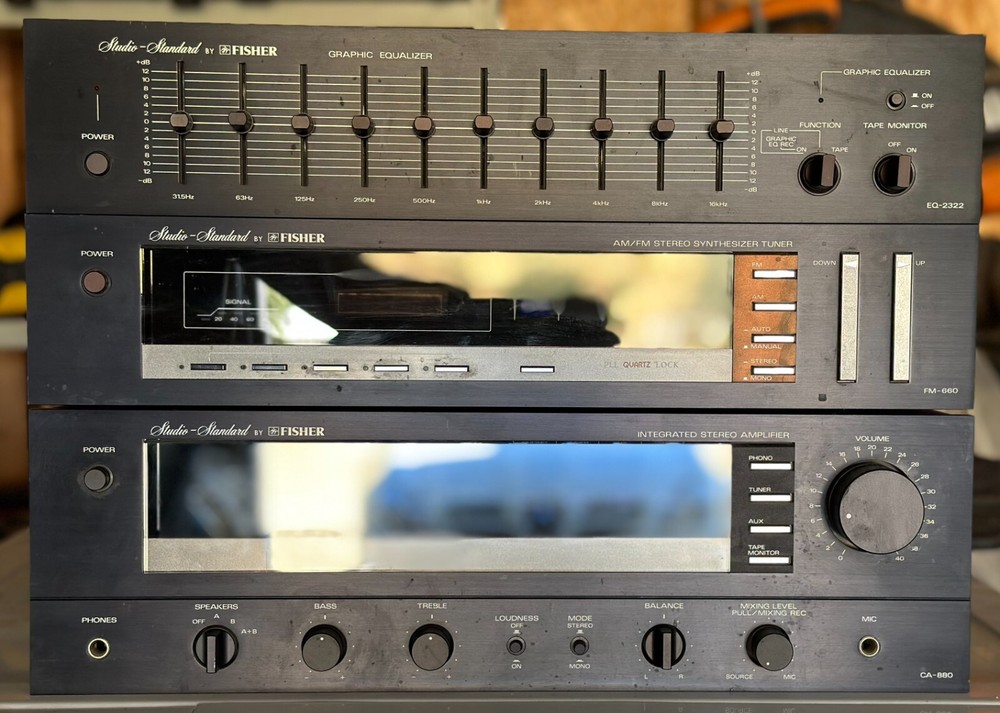 This is a rare and complete HiFi set from Fisher, a respected brand in the audio industry. It includes the CA-880 integrated amplifier, FM-660 tuner, and EQ-2322 equalizer, all made in Japan. This vintage set is a must-have for any audiophile or collector of vintage electronics. It is in good working condition and has been carefully maintained over the years. The set produces high-quality sound with a powerful and clear output. Add this Fisher HiFi set to your collection today! Fisher CA-880 Amplifier Power output: 100 watts per channel into 8Ω (stereo) Frequency response: 20Hz to 20kHz Total harmonic distortion: 0.09% Damping factor: 40 Input sensitivity: 1.6mV (mic), 2.5mV (MM), 150mV (line) Signal to noise ratio: 60dB (mic), 70dB (MM), 100dB (line) Output: 150mV (line) Fisher FM-660 Synthesizer AM/FM Stereo Tuner Fisher FM-660 Synthesizer AM/FM Stereo Tuner 24 channel random preset tuning AC Outlet Unswitched 120V 60Hz 100 watt max Fisher EQ-2322 Graphic Equalizer Output Level: 1V (7V max)Gain: ± 0dB Frequency response: 20Hz to 20kHz Signal to Noise Ratio: 110dB Total harmonic distortion: 0.01% Control Range: ± 12dB Frequency Bands: 31.5, 63, 125, 250, 500, 1K, 2K, 4K, 8K, 16KHz