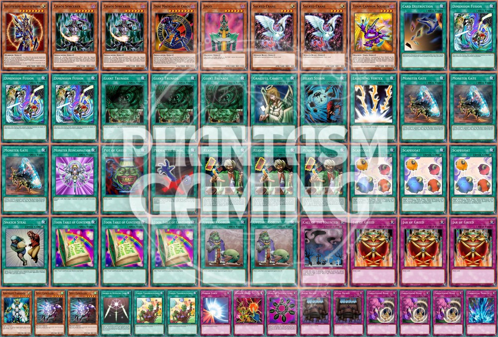Deck Name: Reasoning Gate Turbo (Goat Control) # Main Deck (40) 1 - Black Luster Soldier - Envoy of the Beginning 2 - Chaos Sorcerer 1 - Dark Magician of Chaos 1 - Jinzo 2 - Sacred Crane 1 - Toon Cannon Soldier 1 - Card Destruction 3 - Dimension Fusion 3 - Giant Trunade 1 - Graceful Charity 1 - Heavy Storm 1 - Lightning Vortex 3 - Monster Gate 1 - Monster Reincarnation 1 - Pot of Greed 1 - Premature Burial 3 - Reasoning 3 - Scapegoat 1 - Snatch Steal 3 - Toon Table of Contents 2 - Upstart Goblin 1 - Call of the Haunted 3 - Jar of Greed # Extra Deck (15) 1 - Dark Balter the Terrible 1 - Dark Blade the Dragon Knight 1 - Dark Paladin 1 - Darkfire Dragon 1 - Fiend Skull Dragon 1 - Flame Ghost 1 - King Dragun 1 - Master of Oz 1 - Ojama King 1 - Reaper on the Nightmare 1 - Ryu Senshi 1 - The Last Warrior from Another Planet 3 - Thousand-Eyes Restrict You will receive all of the following cards listed above. Most cards will will be in near mint condition. In the case of certain older cards we will do our best but some cards may be light or even moderatly played in extreme condtions. Those conditions being the card has not been reprinted in a number of years and con no longer be easily purchased in light or near mint condition. Set, Rarity, and Edition will vary and cannot be special requested. These lists are constructed with least expensive rarities we have available in stock. All cards are play legal copies. Note: If purchasing a Yugioh Deck all Speed duel cards are 100% legal at all levels of play. Store Policies Here at PMG_LLC , we pride ourselves on having the best customer service around. If you have any questions or can't seem to find something that you want please do not hesitate to contact us. We will do our best to respond to all questions within one business day. Hours of Operation: Monday-Friday: 2:30pm - 10:00pm Saturday- 10:00am - 8:00pm Sunday 11:00am - 5:30pm Note: We are closed all national holidays. Info: Thank you for choosing PMG_LLC . We appreciate your business. We ship Monday through Friday to make sure you get your deck as quickly as possible. All orders priority orders can use combined shipping. In order to use the combined shipping your whole purchase needs to be checked out as one order. We ship once we have received your payment and payment has cleared. As always if you have any questions or concerns please feel free to contact us via email. Shipping Information: We ship Monday through Friday, barring national holidays during which the United States Postal Service is closed. If you purchase a card on Friday or Saturday please bear in mind it will not ship until Monday. US Shipping: First Class Mail : Free. Comes with tracking information. Priority Mail with Delivery Confirmation : $9.99 All orders are shipped in appropriate protective material inside bubble mailers. International Shipping: We do not offer international Shipping Return Policy: You must return items sold and fulfilled by PMG_LLC within 30 days of delivery to be eligible for a refund. Returns which are damaged in the mail due to improper return packaging will receive partial refunds. We will process a full refund for all items returned in their original condition. In order for us to process your full refund you must include the full name associated with the order as well as the eBay order number inside the return packaging. We will not process returns which do not include the buyer's name and order number. Requirements: Please return items with the original plastic packaging. Failure to do so may result in a partial refund. Also you must inform us of any returns you may wish to process before sending them back. Any items simply send back to us without prior contact will not be eligible for refunds. Important Notes Remember that to benefit from our domestic combined shipping on priority orders you must to pay in a single payment. If you place two separate priority orders you will be charged the $7.50 shipping fee for both orders. If you place multiple orders for Priority shipping you will be charged the corresponding shipping costs for each order, even if you place the orders on the same day. We do not refund shipping costs as we tend to package orders throughout the day and may not notice that you would otherwise have qualified for combined shipping. We want to provide you with 5 Star service and earn your Positive Feedback, so if for any reason you are not happy with your transaction, contact us before leaving feedback. Business Day - Our business day runs from Monday to Friday from 9am to 4pm, excluding US national holidays. Any orders placed or payments cleared less than 4 hours before the close of business will be considered orders from the following business day.